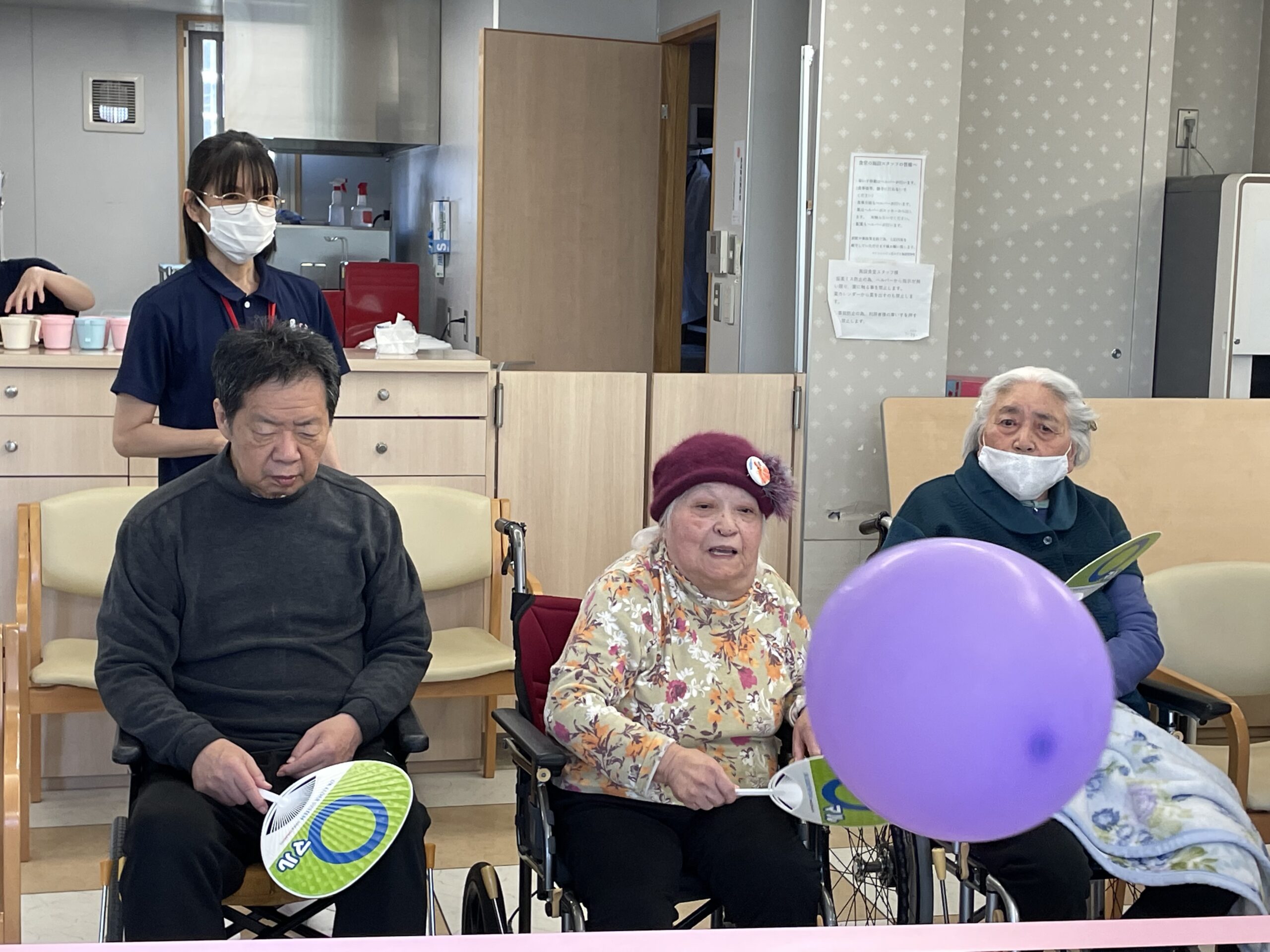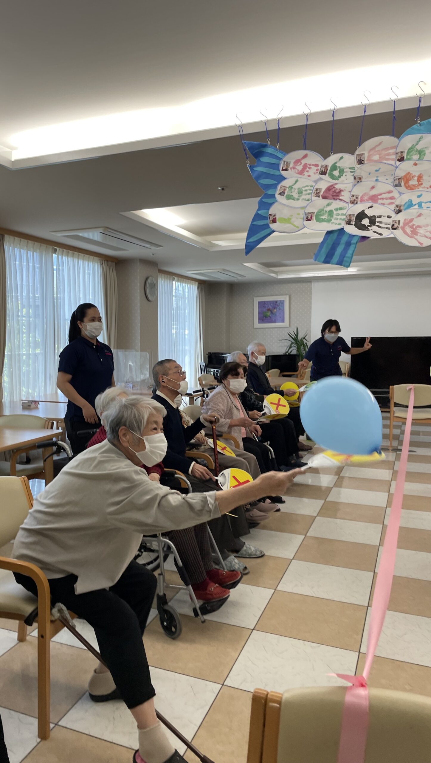 「それっ!!!」と元気な掛け声と共に風船を勢いよく打ち返してくださっていたこちらのご入居者様です! あまりの勢いにお隣の方も驚いた表情をされていますね☆