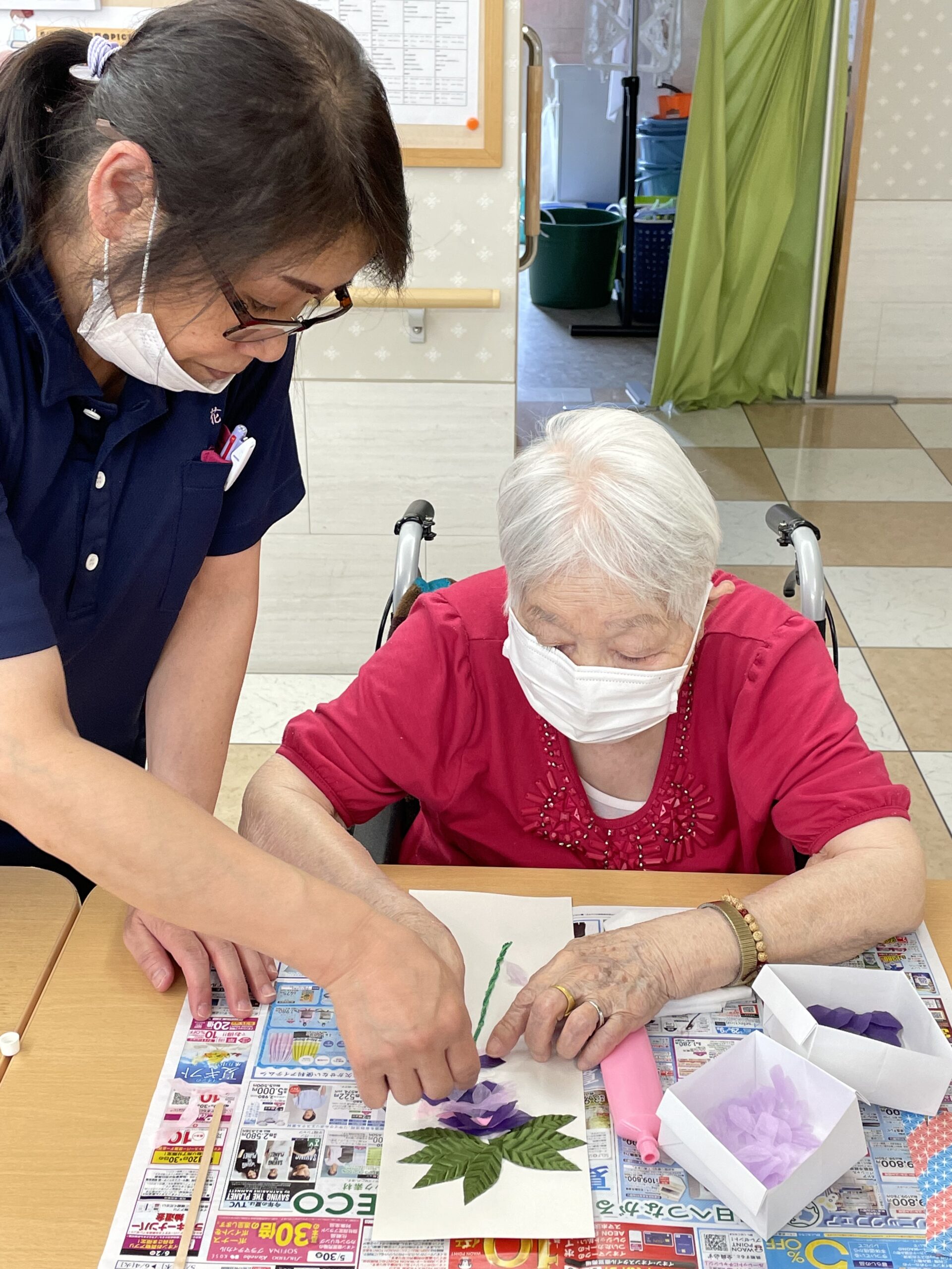 施設の方で作成したお手本を見ながら、ご参加いただいた皆様にも作成していただきます☆ 事前に花びらを作成していますので、葉っぱ付きの台紙にご自由に貼り付けていただきます。