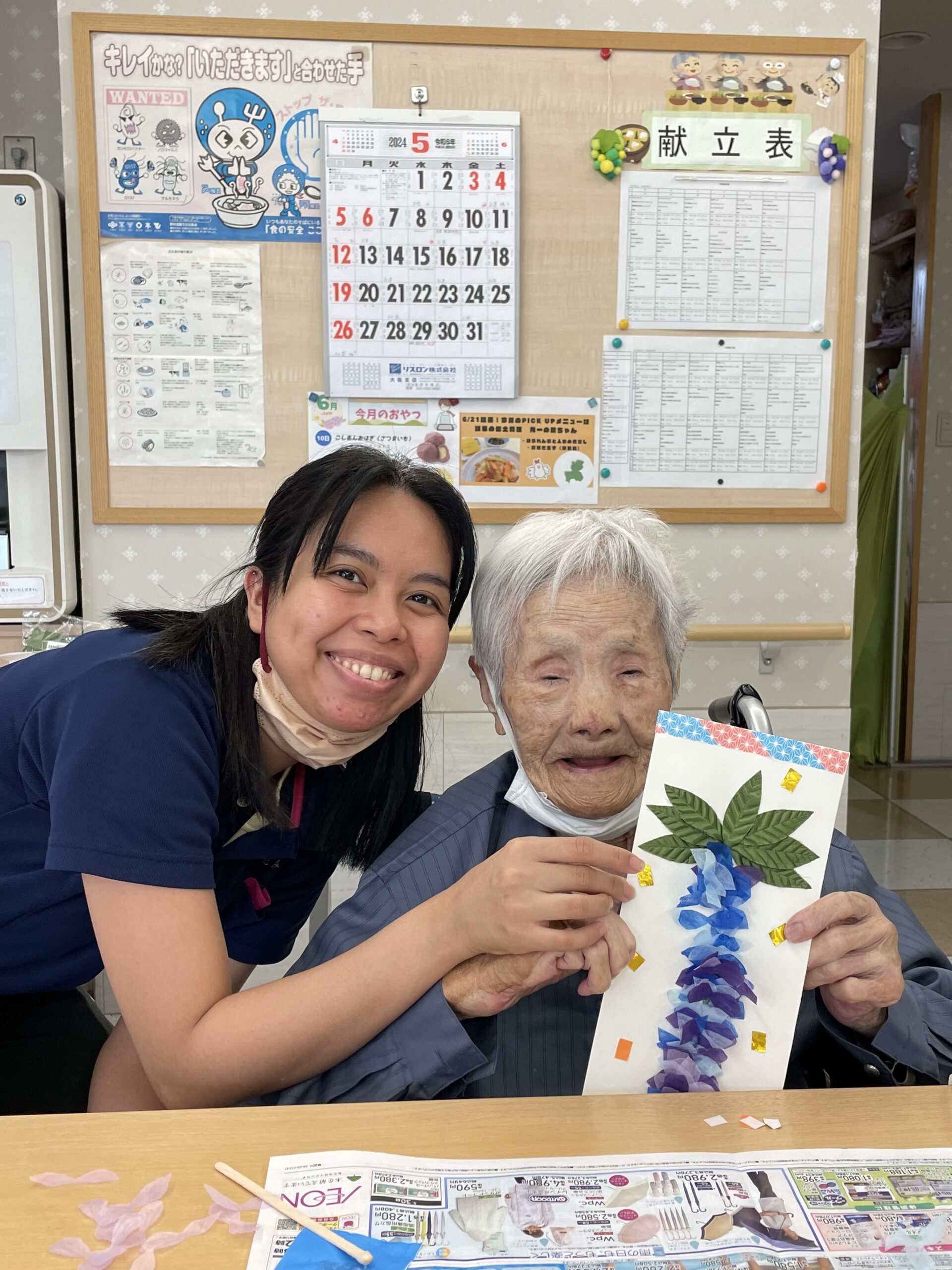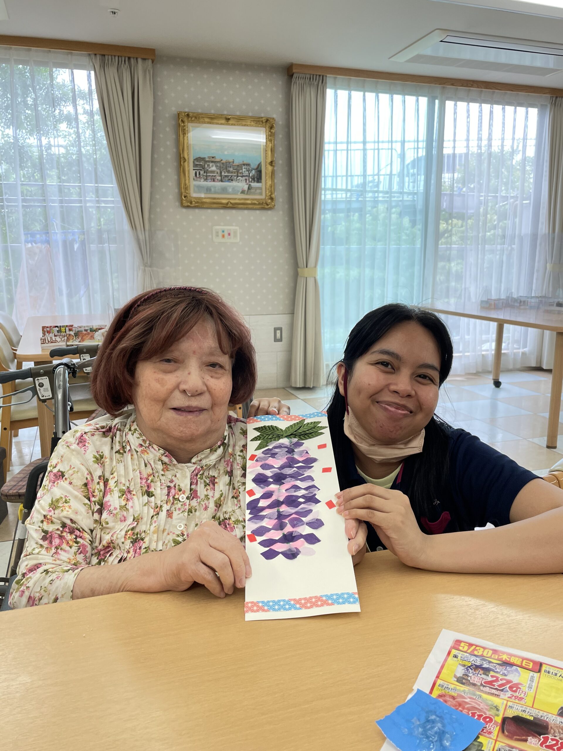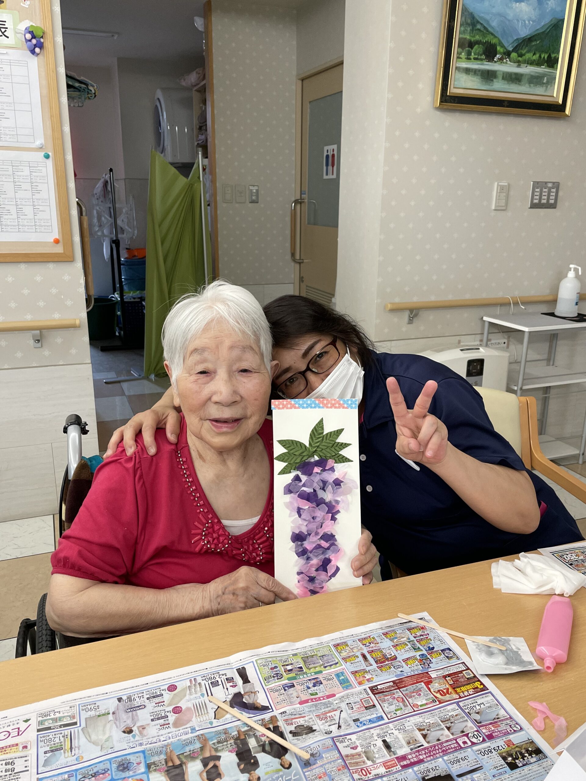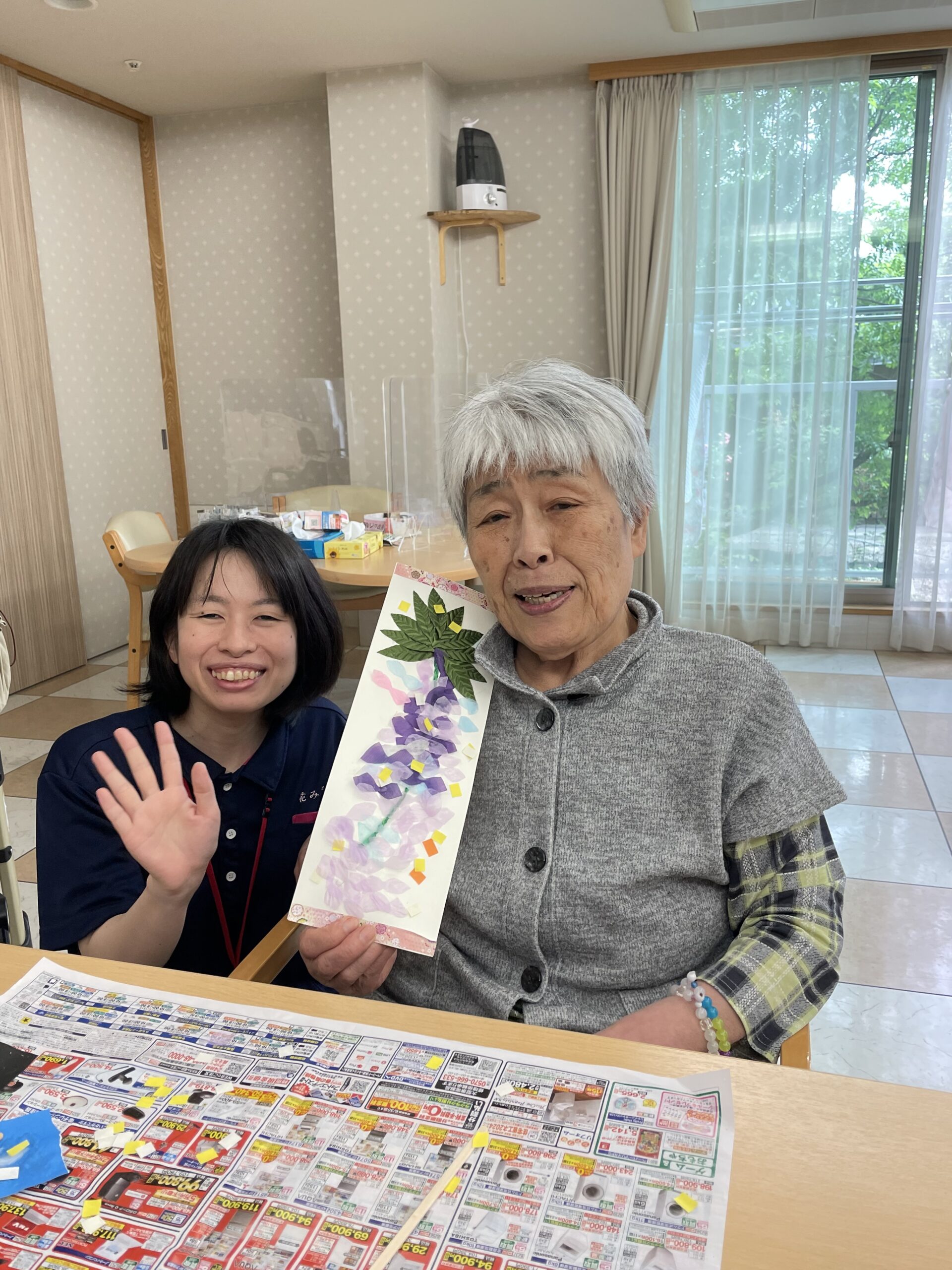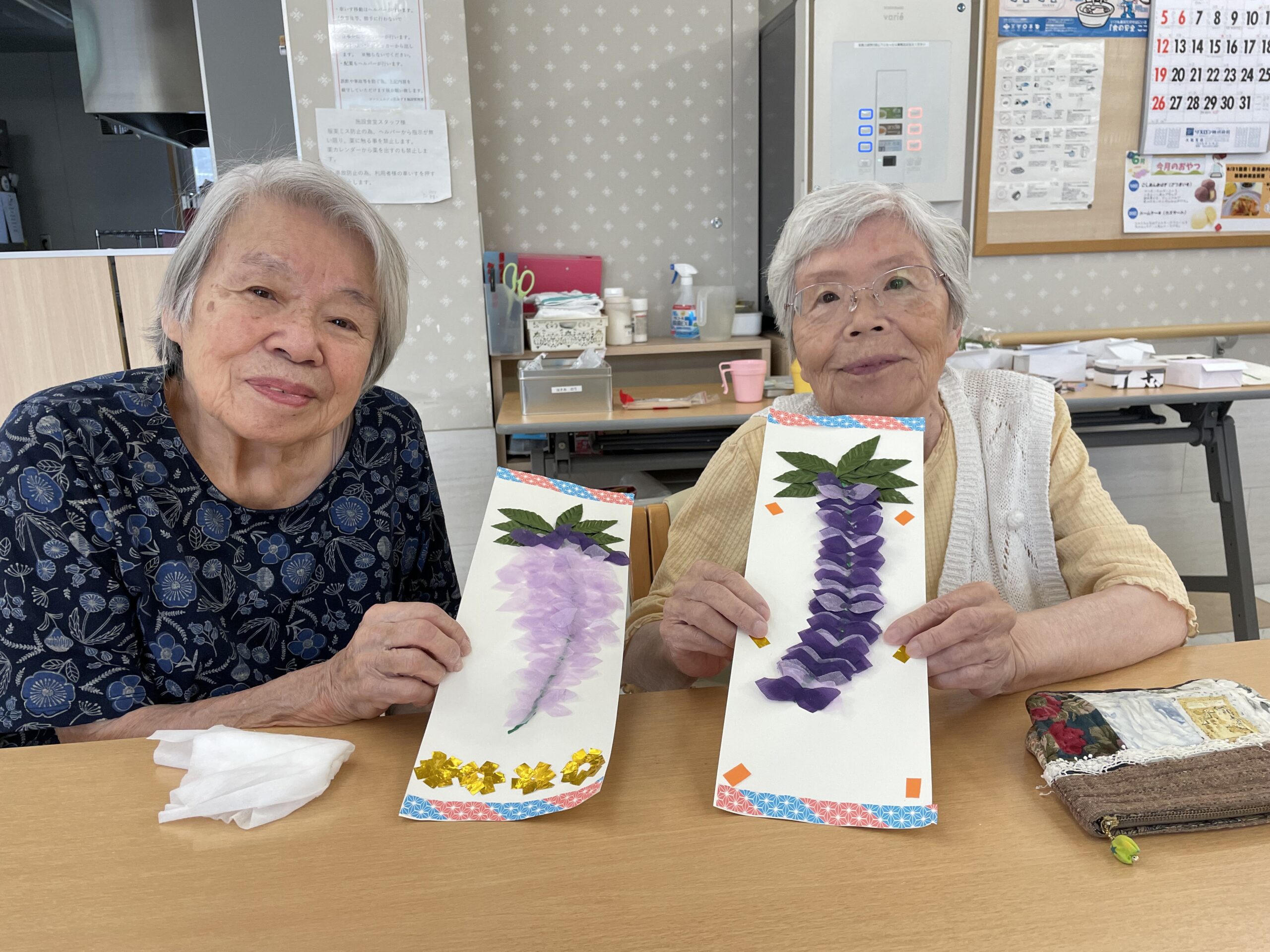 仲良しのご入居者様お二人で記念撮影です。「葉っぱで影になるから濃い紫色の花びらにしたの ♪ 」「私は綺麗に並べてみました ♪ 」と個性豊かな素敵な藤の花の壁飾りが完成です☆