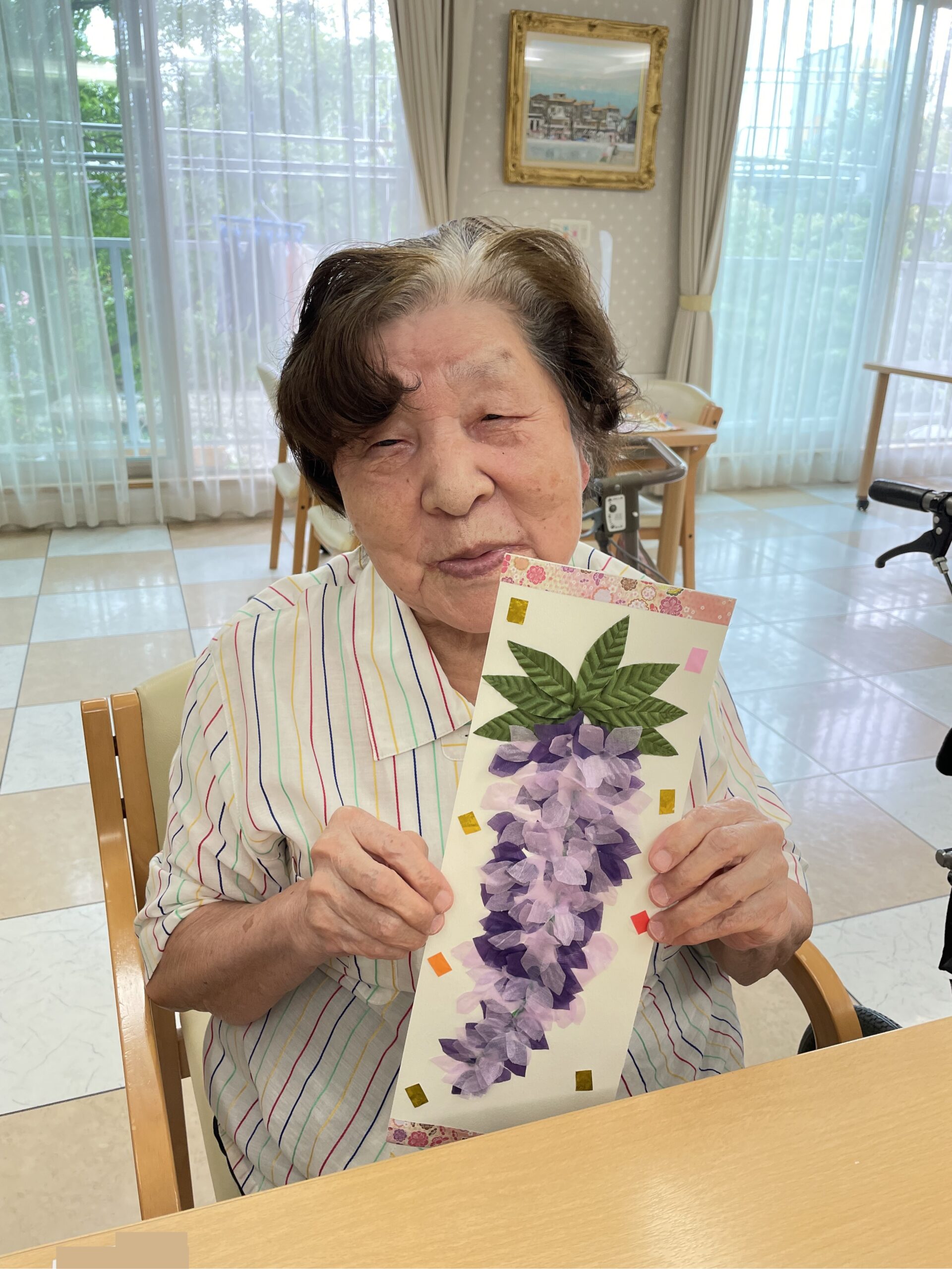 「恥ずかしい…」と照れていらっしゃいましたので仲良しのスタッフと一緒に☆ 優しいご入居者様のお人柄を表すようなふんわりとした可愛い藤の花の壁飾りが完成です ♪