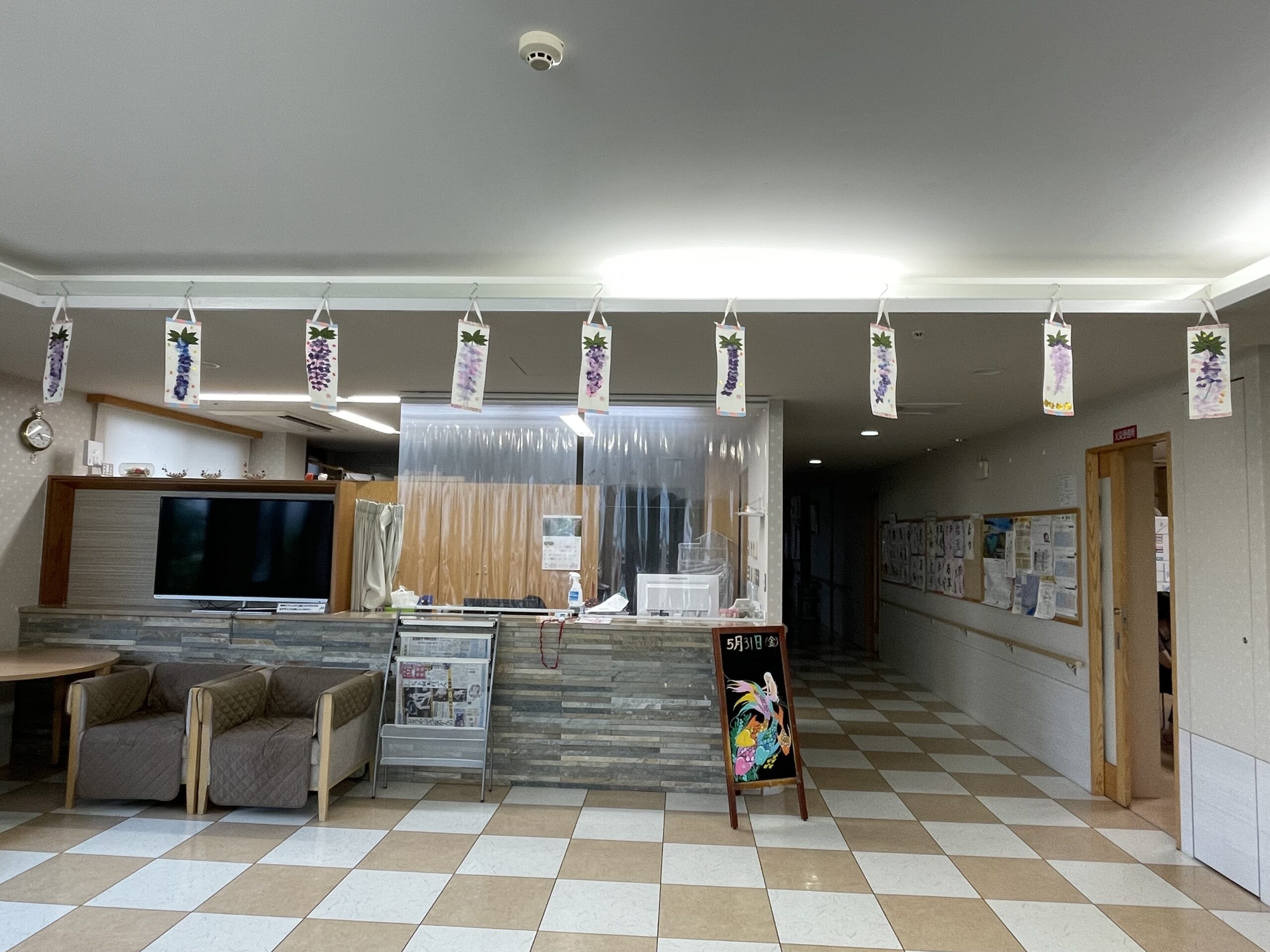 2階のロビーにも少しの間皆様の藤の花の壁飾りを飾らせていただきました☆ まるで藤棚みたいでとても綺麗でした!