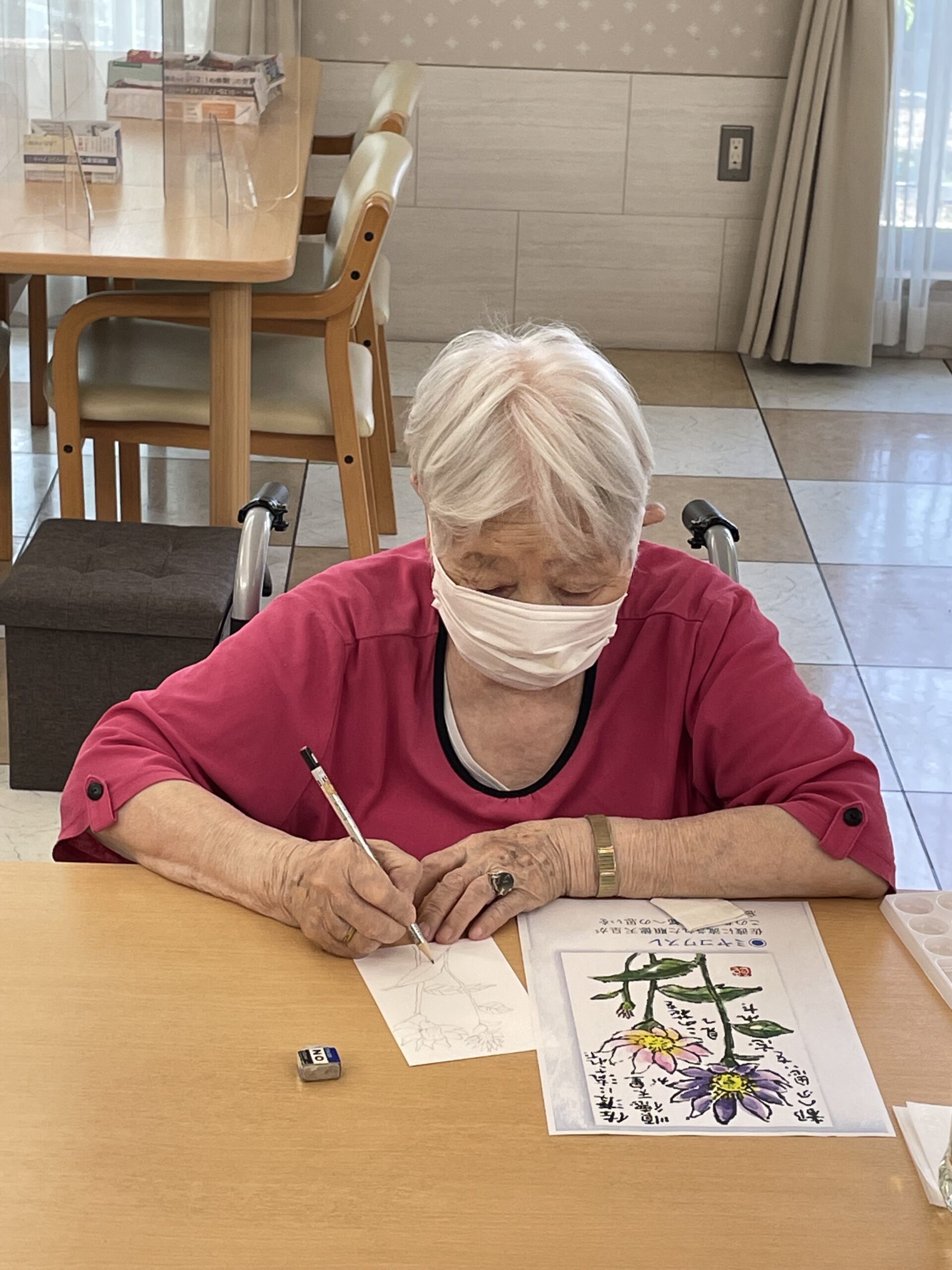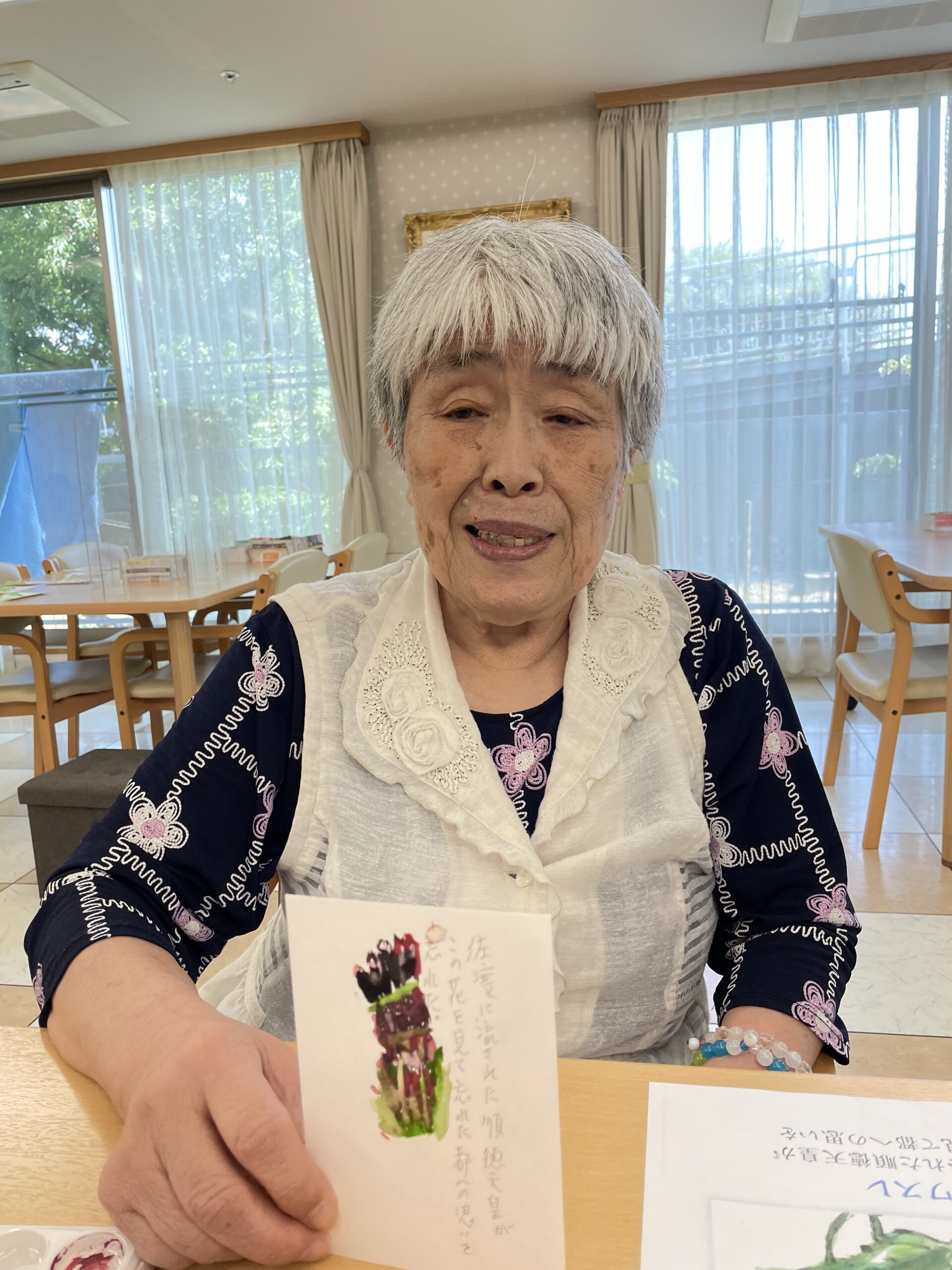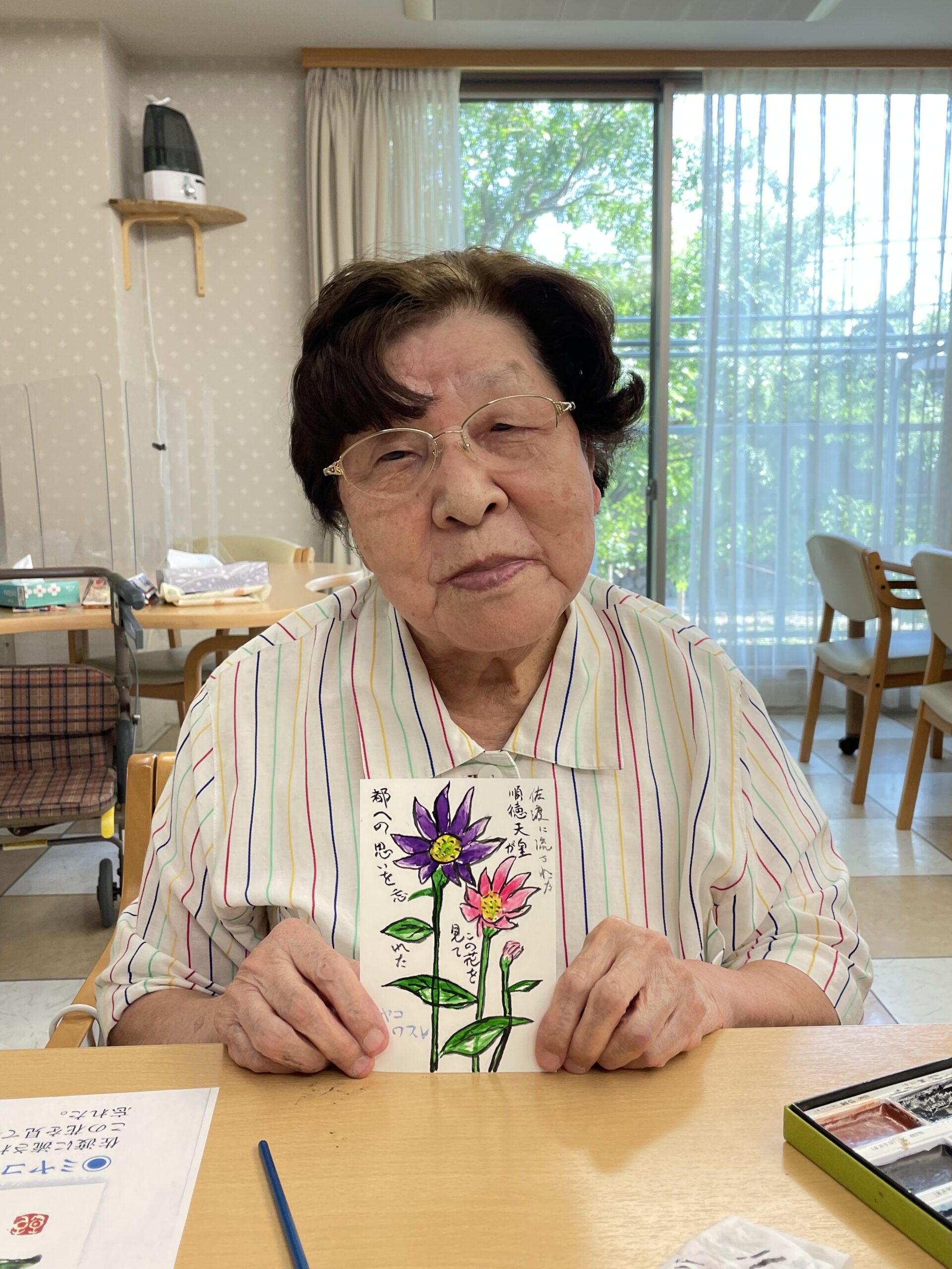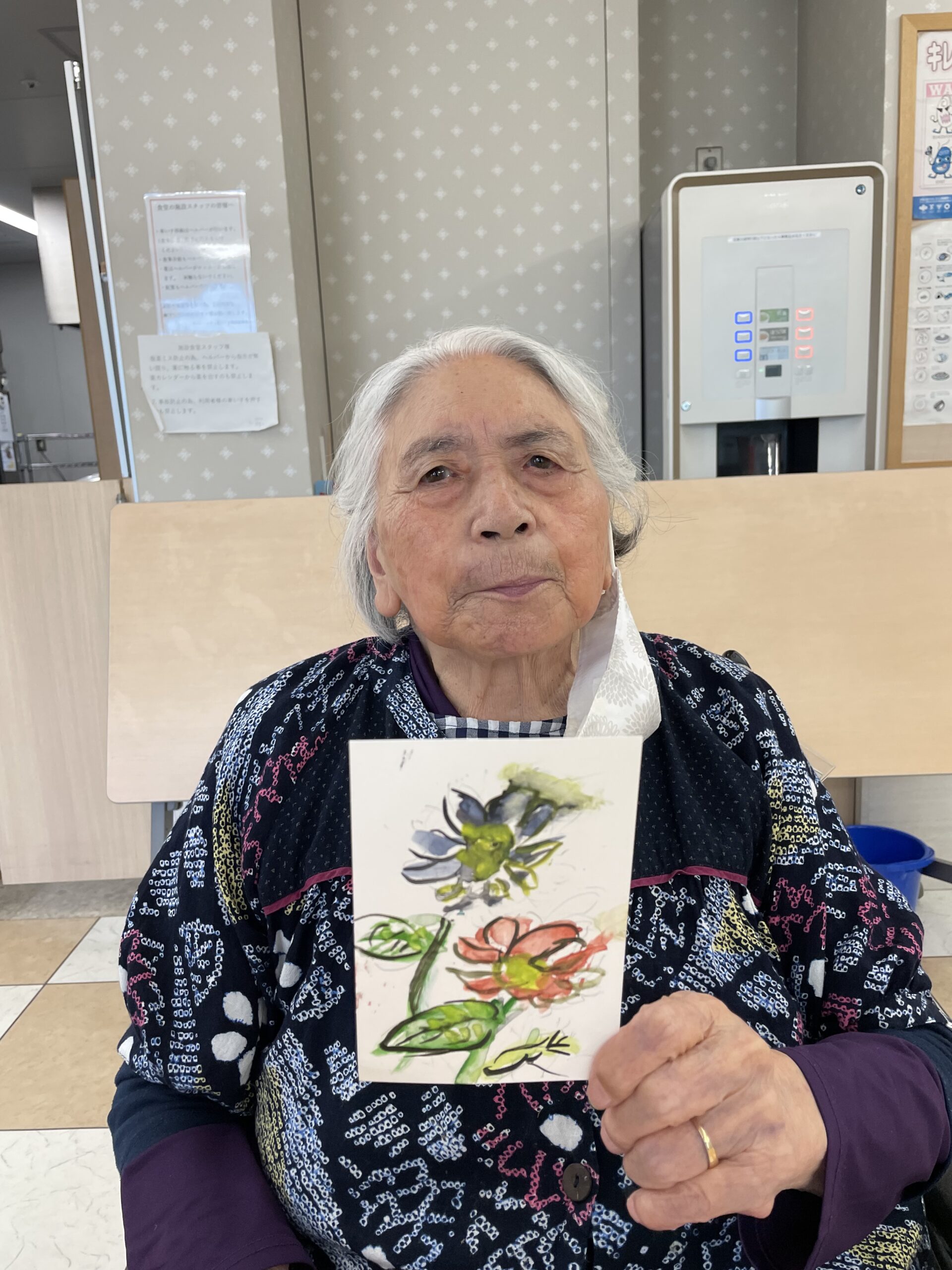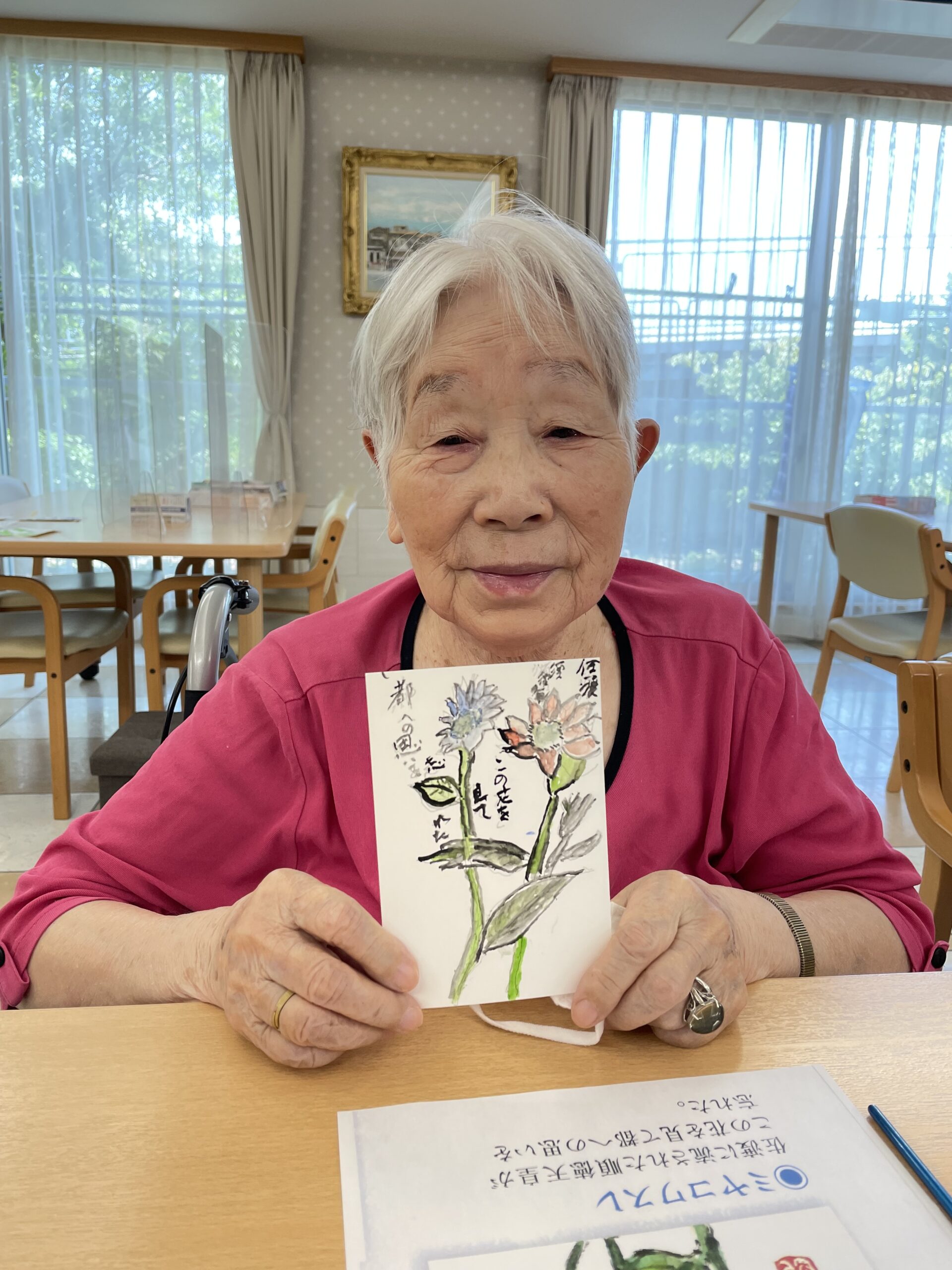 こちらのご入居者様も途中からご参加くださいました。「なかなか上手くできなかったわ~」とおっしゃっていましたが、花びらのお色がこの日お召になっているお洋服のお色目と合った素敵な絵手紙の完成です☆