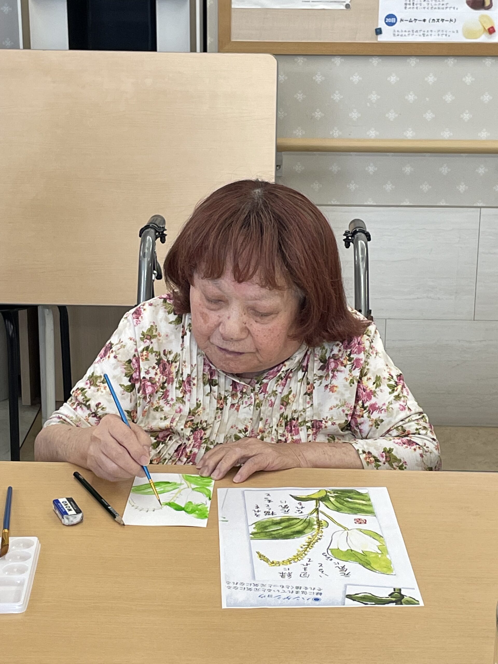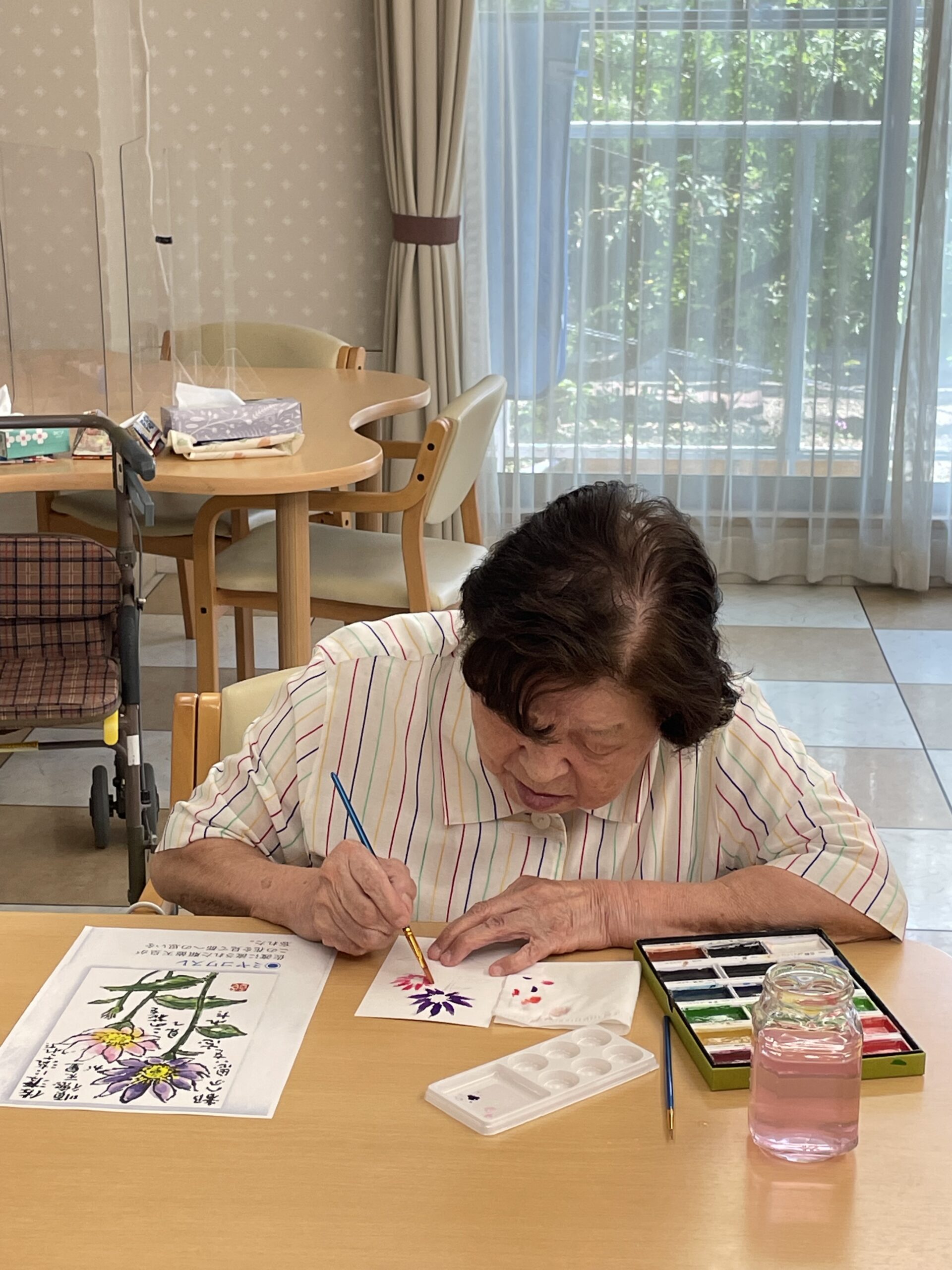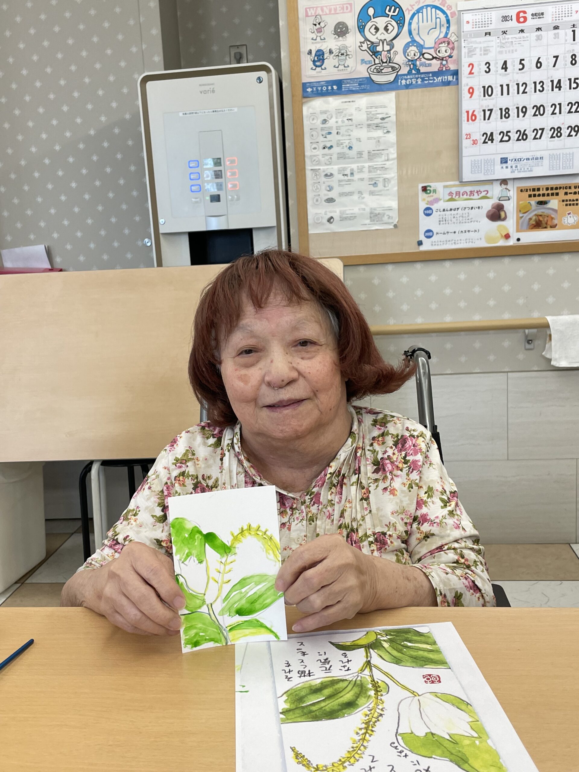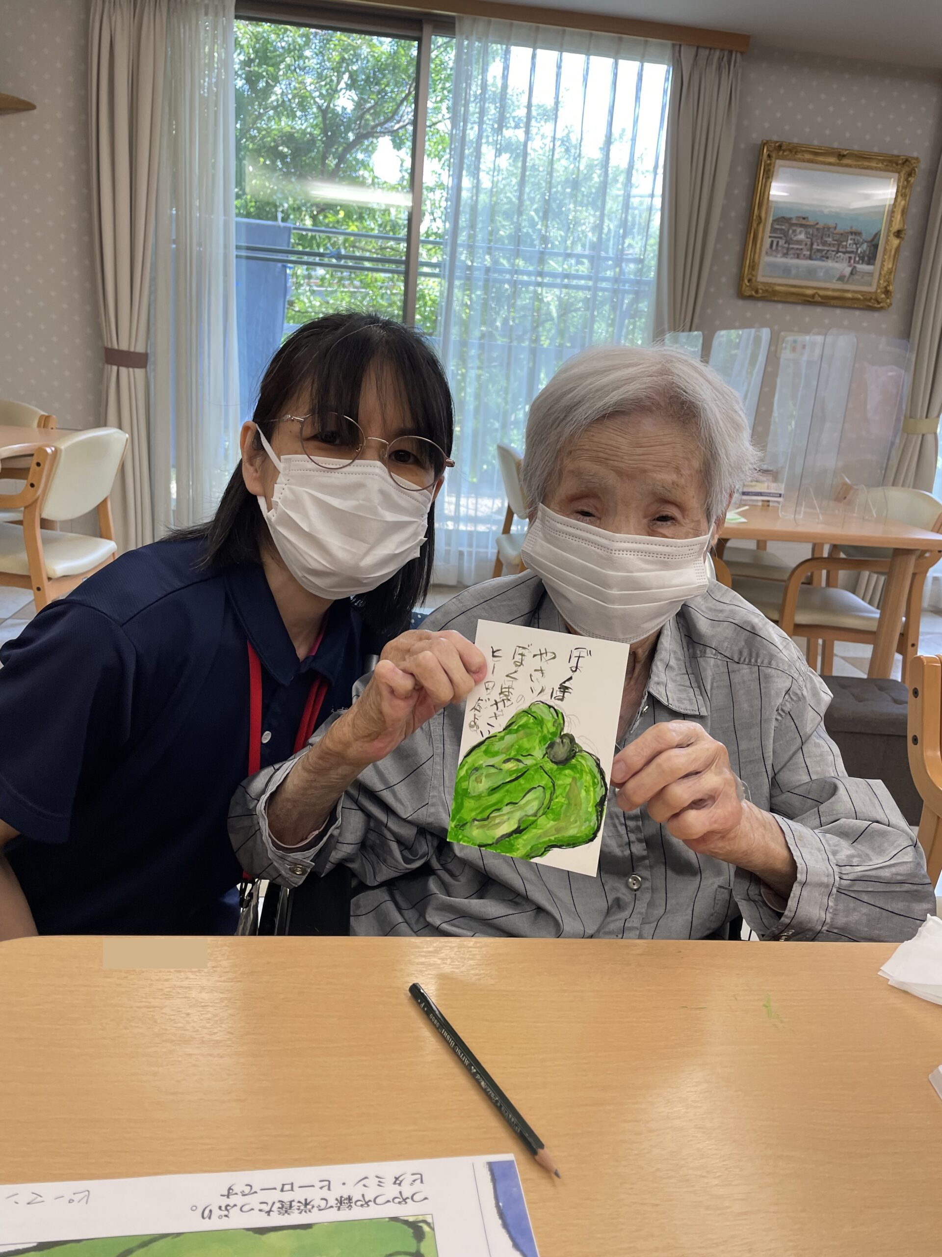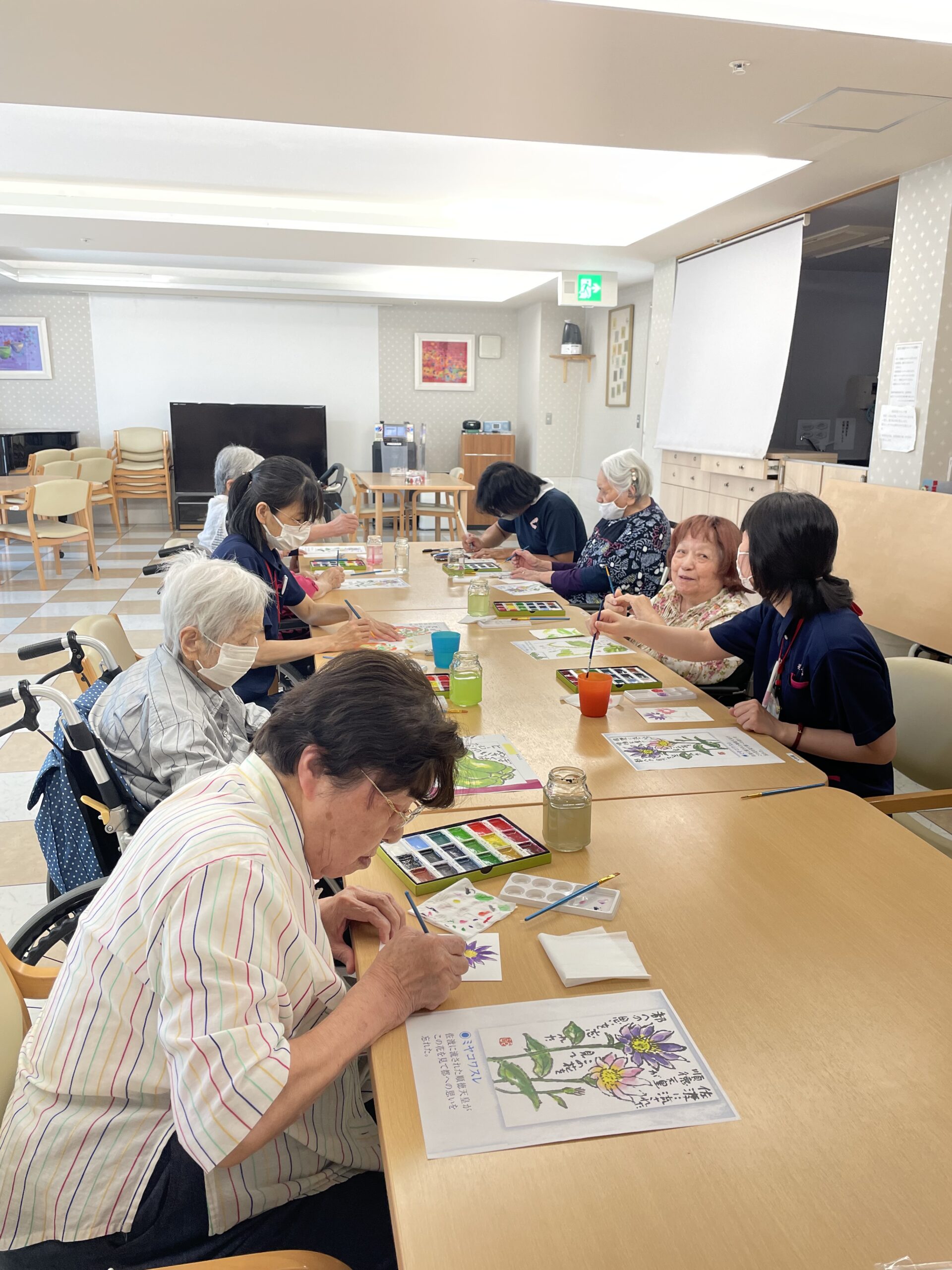 こちらのご入居者様も途中からご参加くださいました。「なかなか上手くできなかったわ~」とおっしゃっていましたが、花びらのお色がこの日お召になっているお洋服のお色目と合った素敵な絵手紙の完成です☆