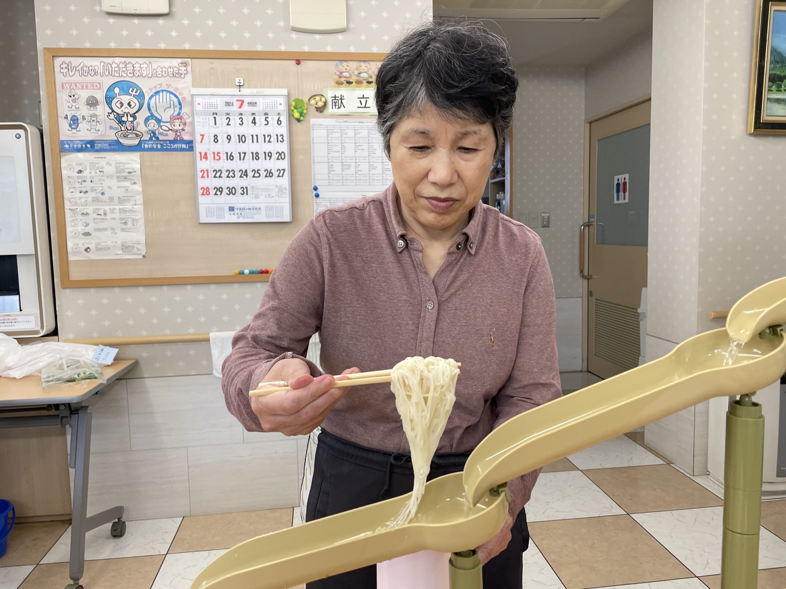 水流に乗ってたっぷりとそうめんが流れてきました! 慌てることなく、落ち着いてお箸ですくっています ♪ 取れた!と嬉しそうにおっしゃっていました。