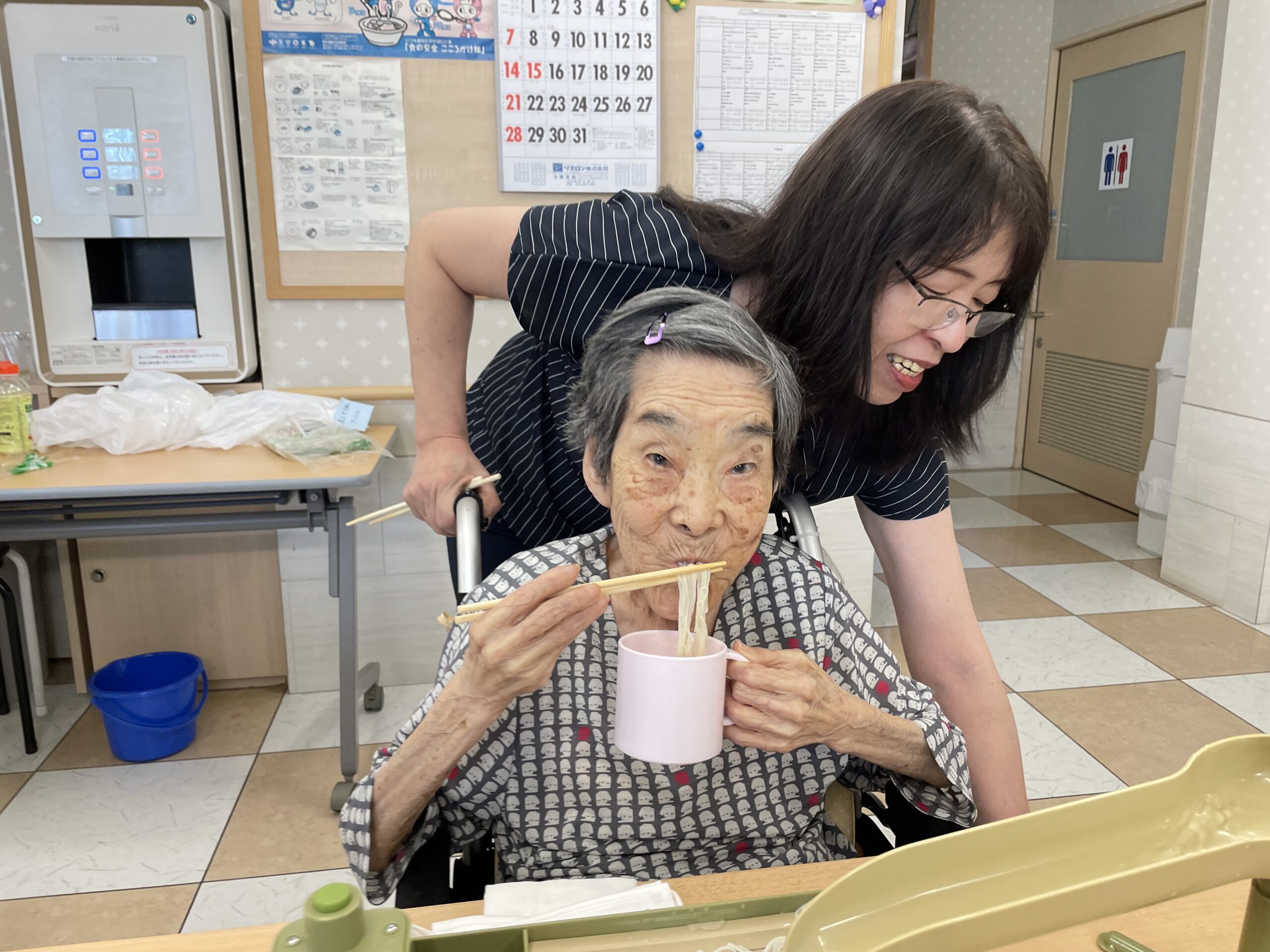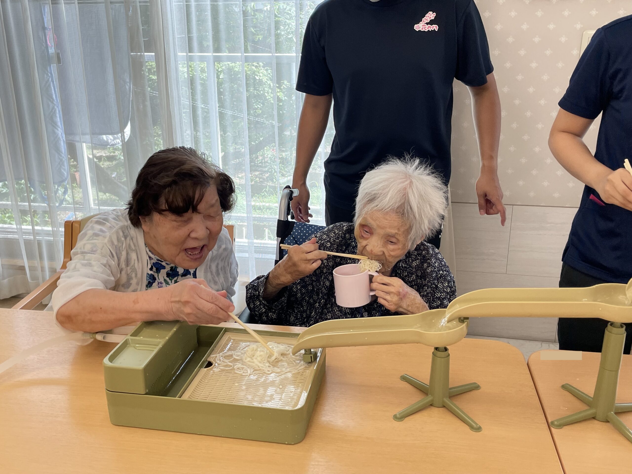 「〇〇さんがまだ食べたいそうです!」と仲良しのご入居者様からお聞きして、どんどんそうめんが流れてきます☆ 「凄い!沢山食べてらっしゃいますね!!」とご友人もスタッフもビックリしました ♪ 嬉しいですね☆