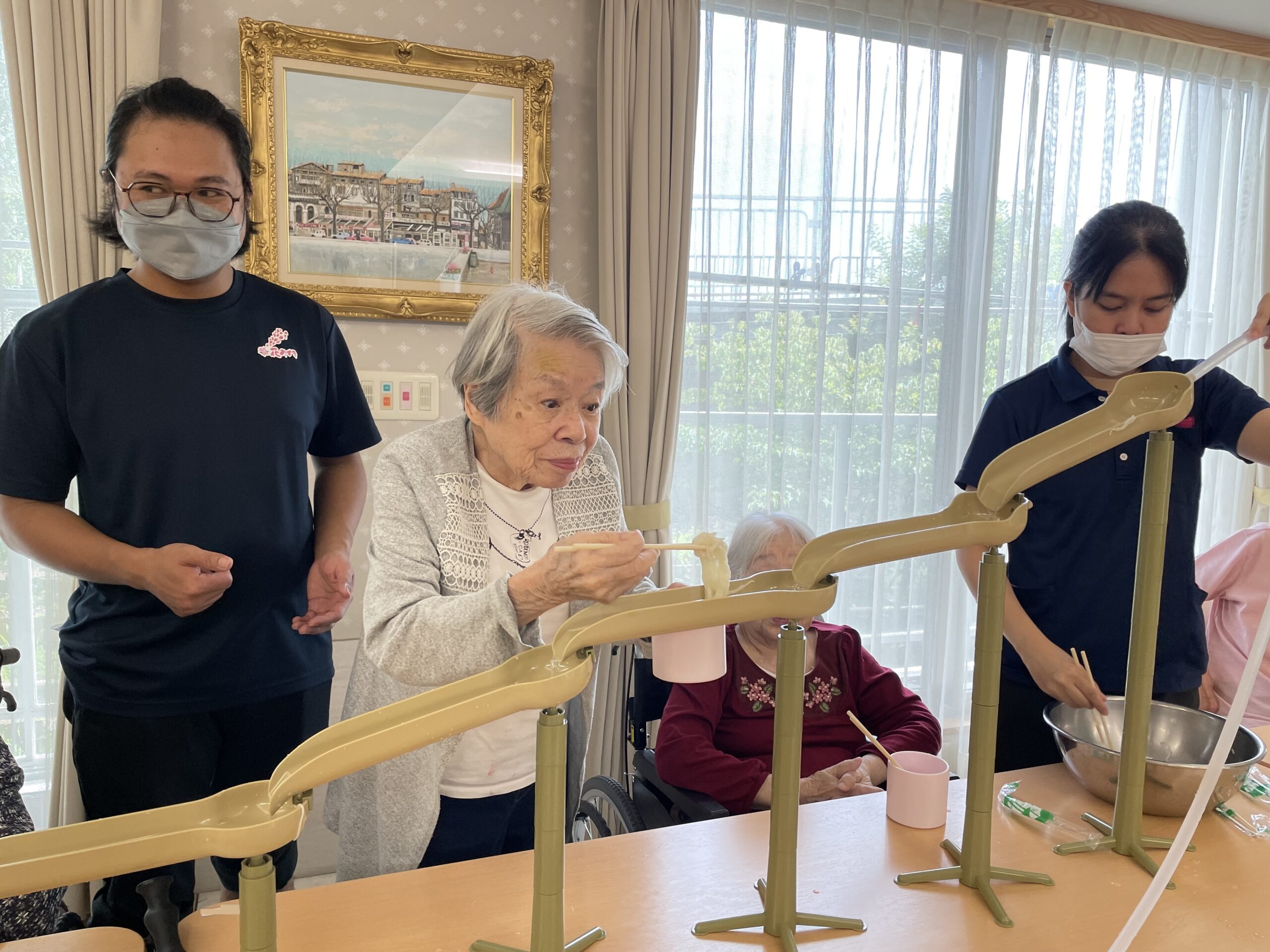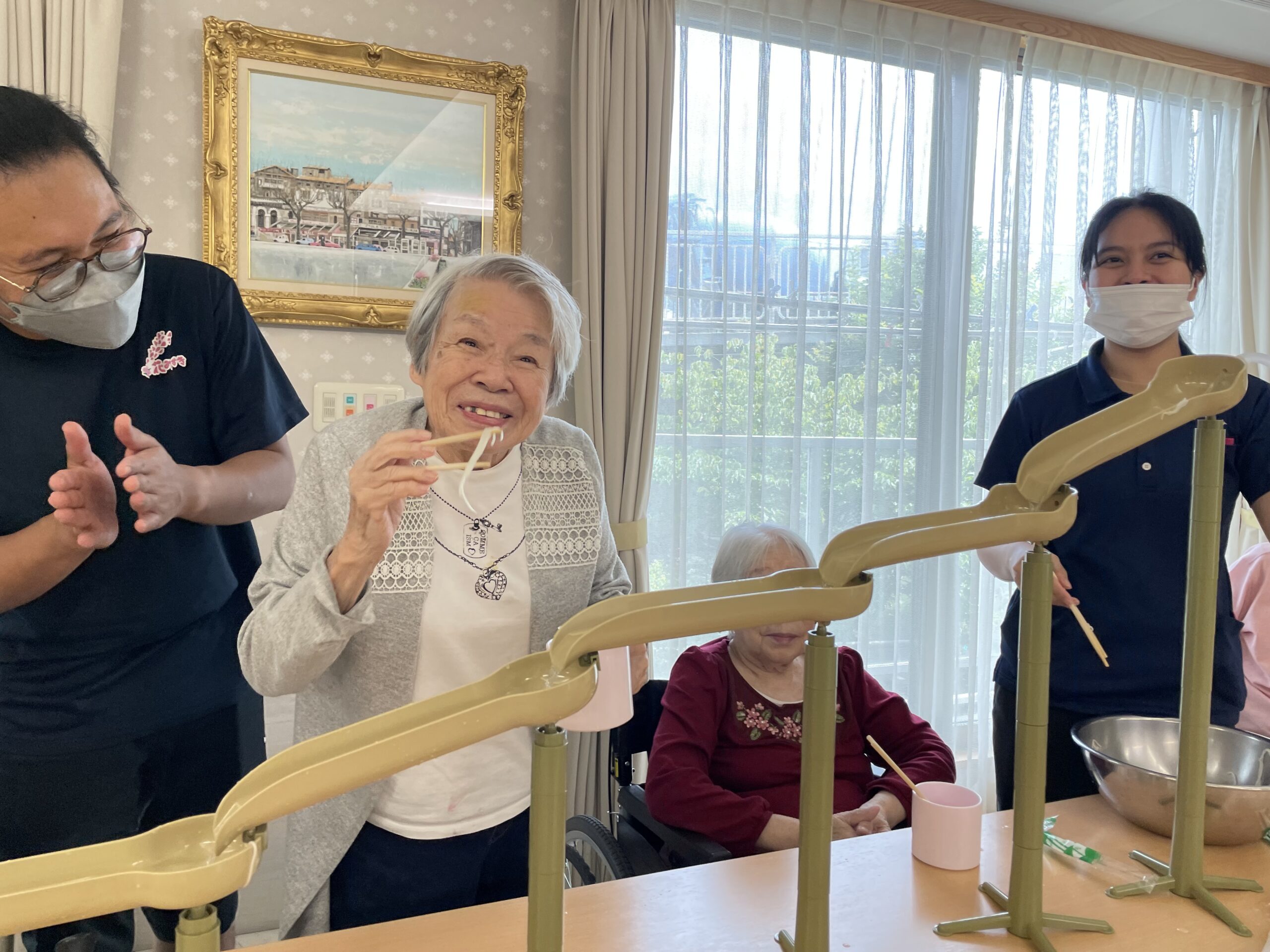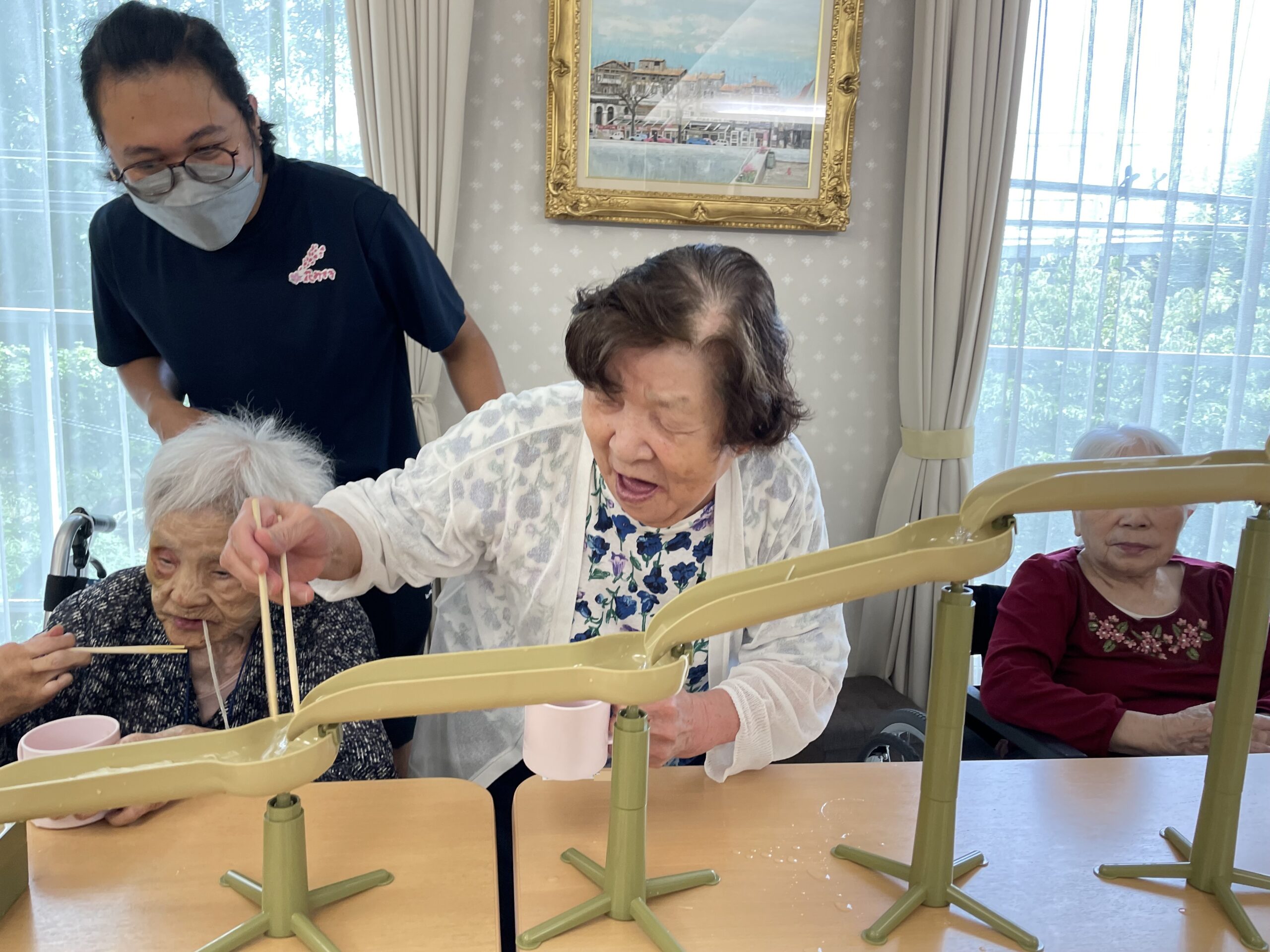 2回目のおかわりチャレンジをしていらっしゃるご入居者様の横で… なぜか流れてくるのをじっと見つめて待っていらっしゃる方が?! 果たして流しそうめんをキャッチできるのでしょうか??