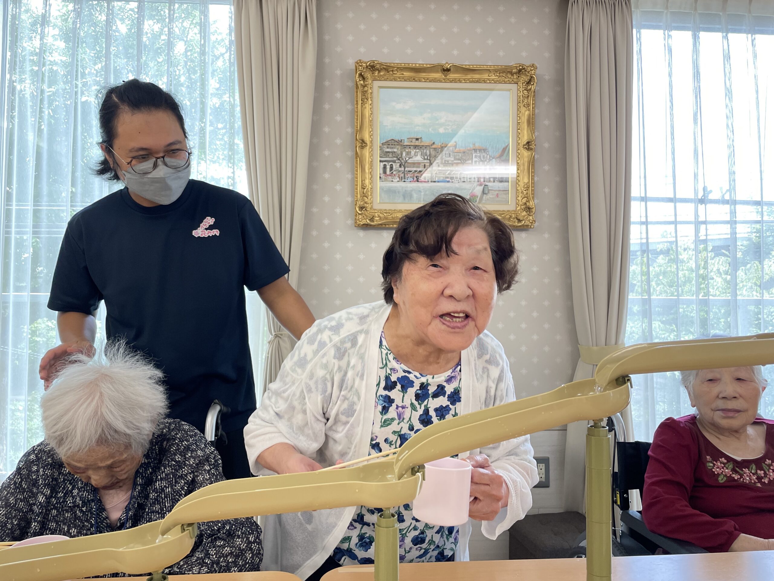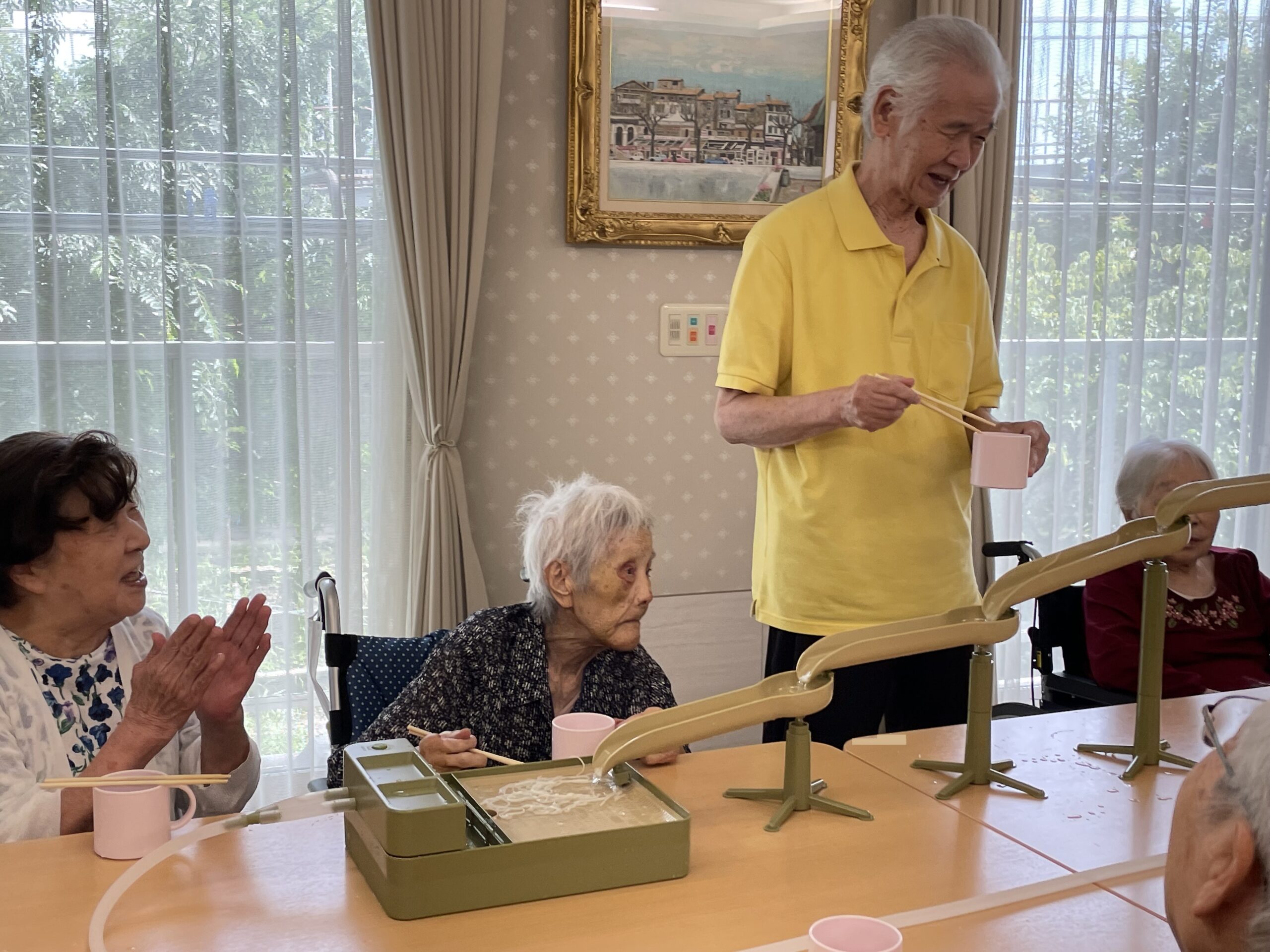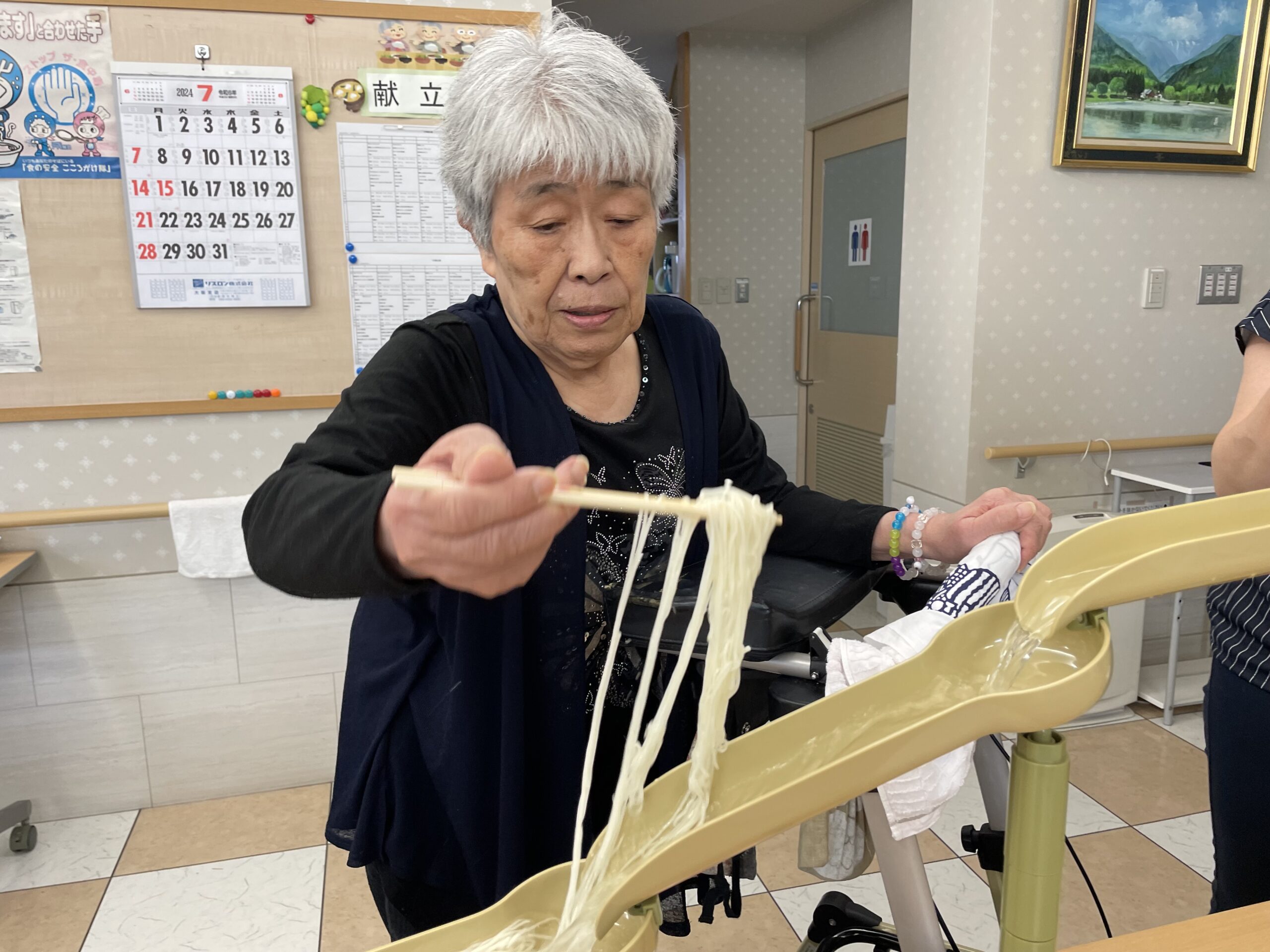 2回目のおかわりチャレンジをしていらっしゃるご入居者様の横で… なぜか流れてくるのをじっと見つめて待っていらっしゃる方が?! 果たして流しそうめんをキャッチできるのでしょうか??