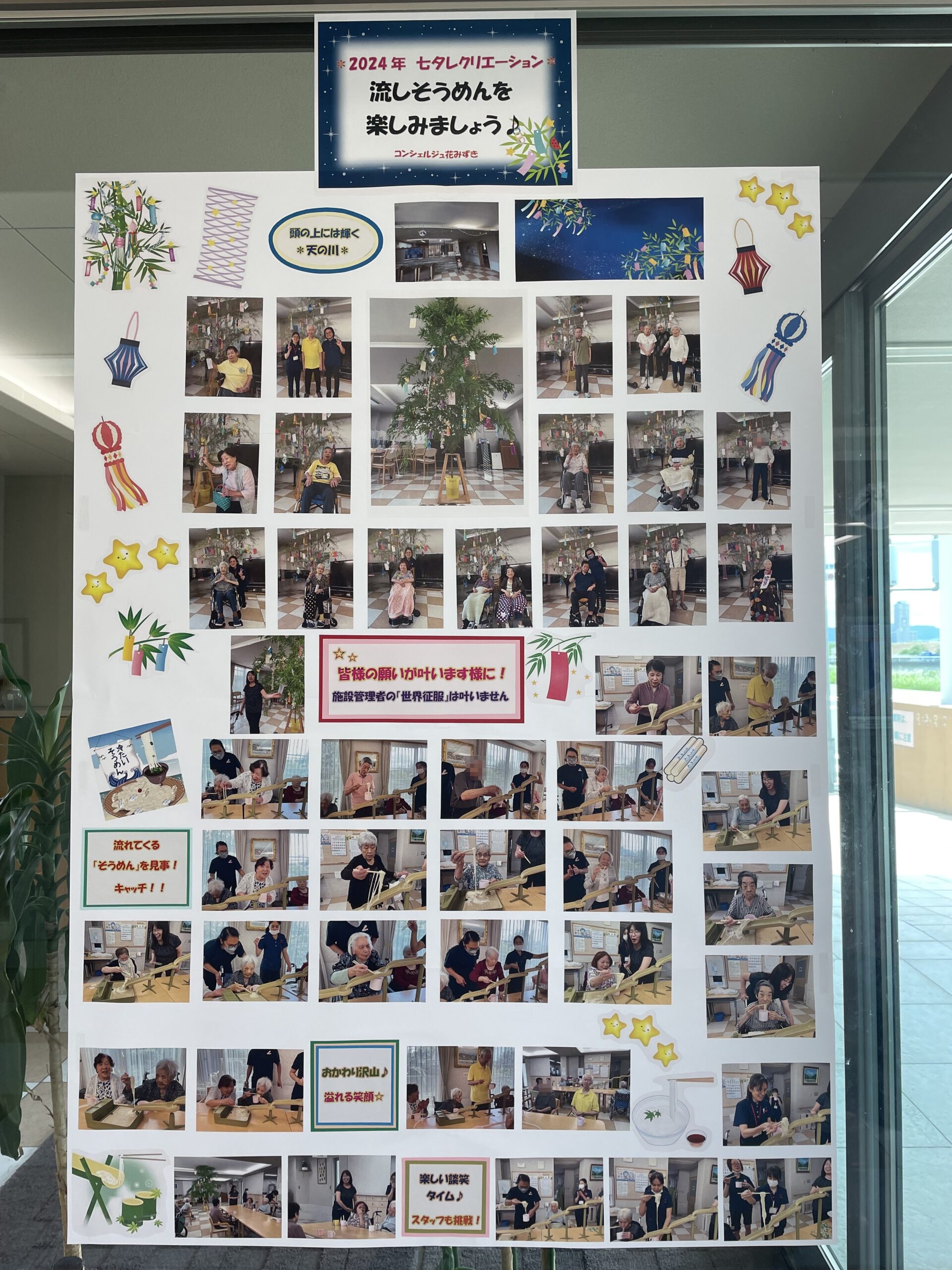 施設2階ロビーでは、七夕レクリエーションにご参加いただいた皆様のご様子をポスターにして掲示致しました ♪
