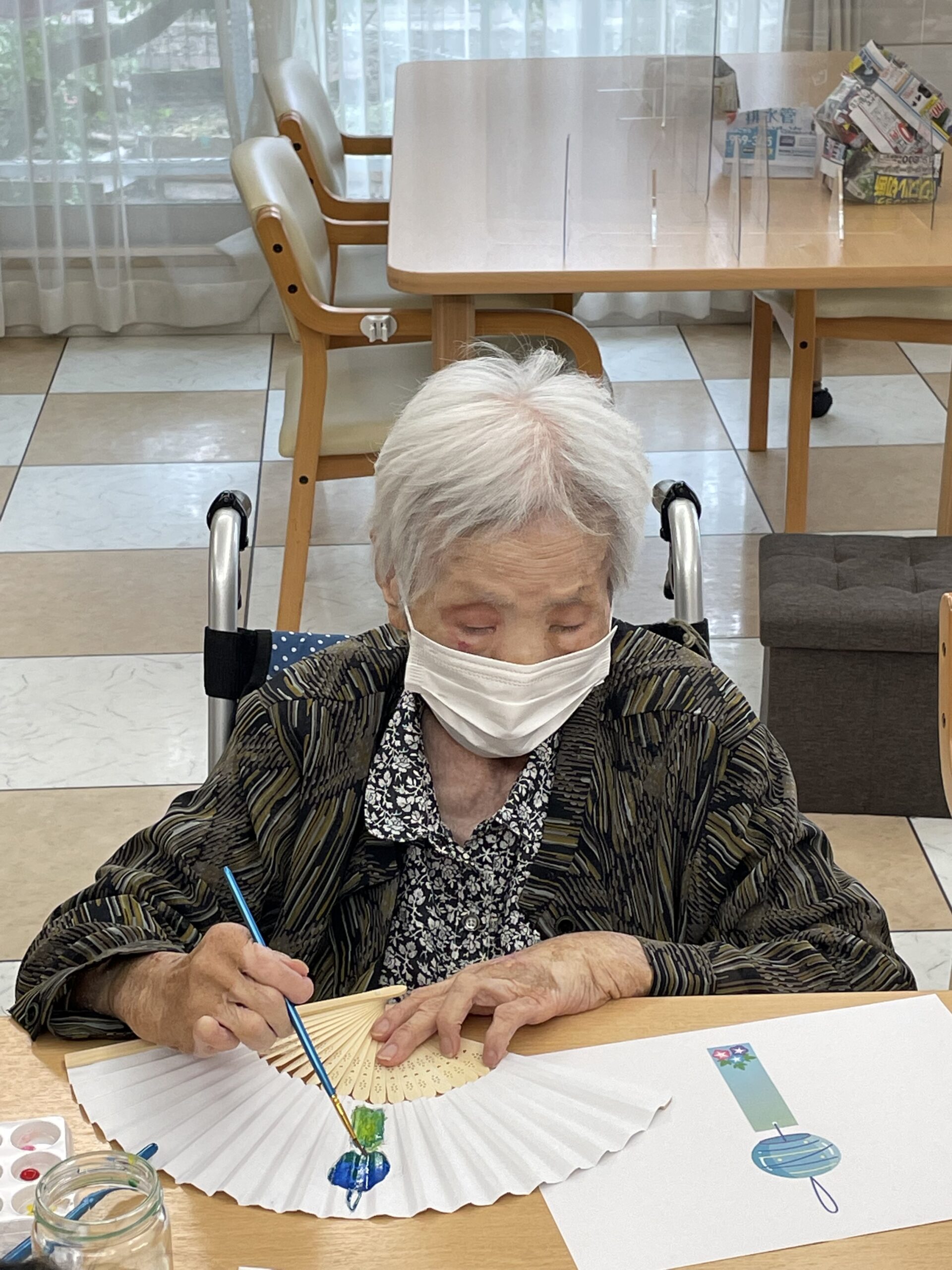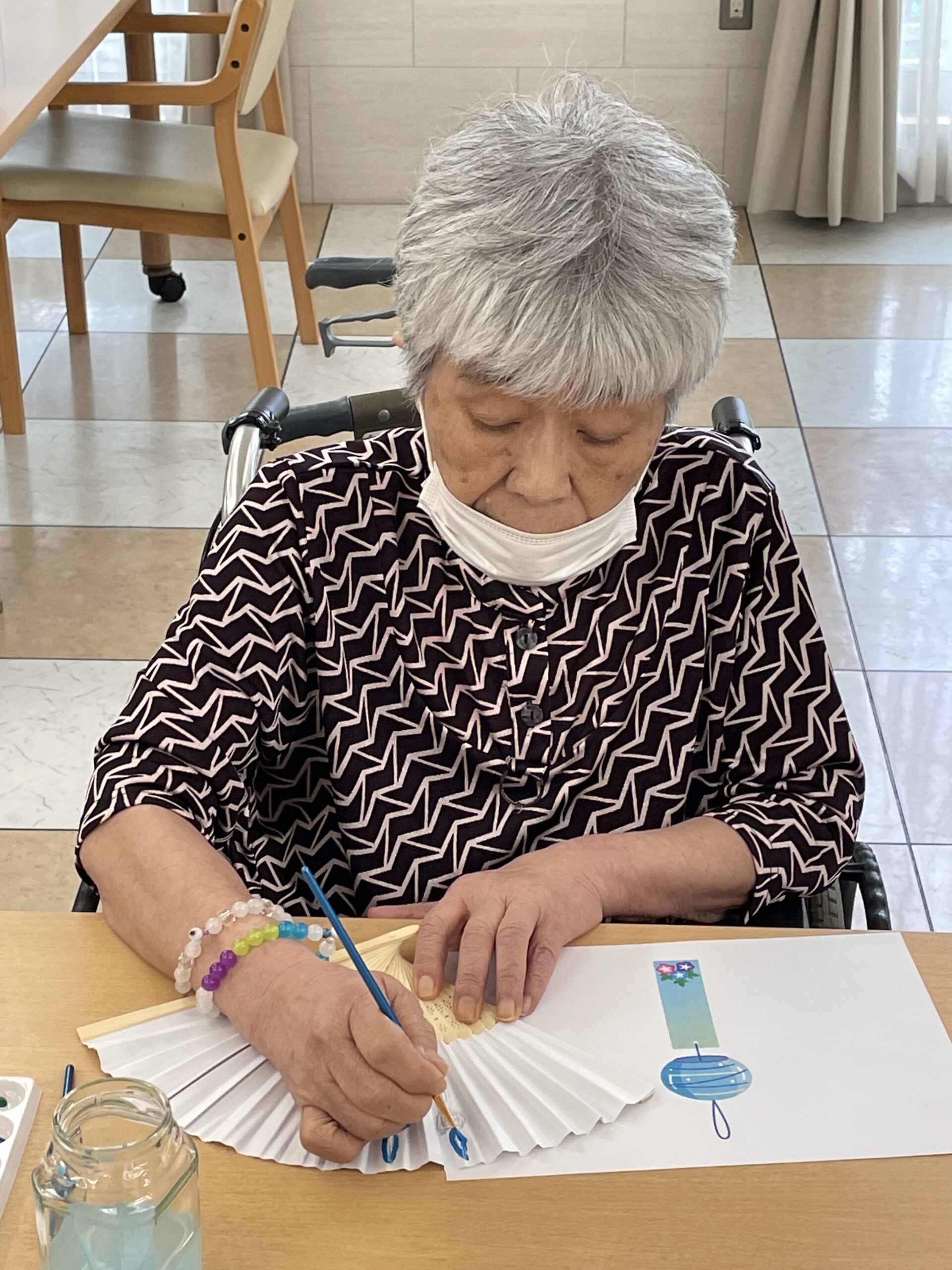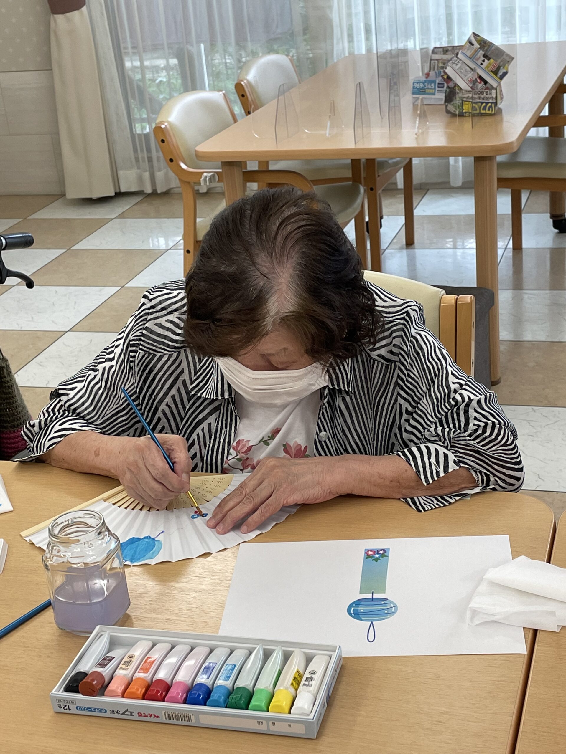 夏らしいイラストのお見本をご用意して、無地の扇子にお好きな絵柄を描いていただきました ♪ 絵を描くことが難しいご入居者様の分は、スタッフが心を込めてお手伝いをさせていただきました☆