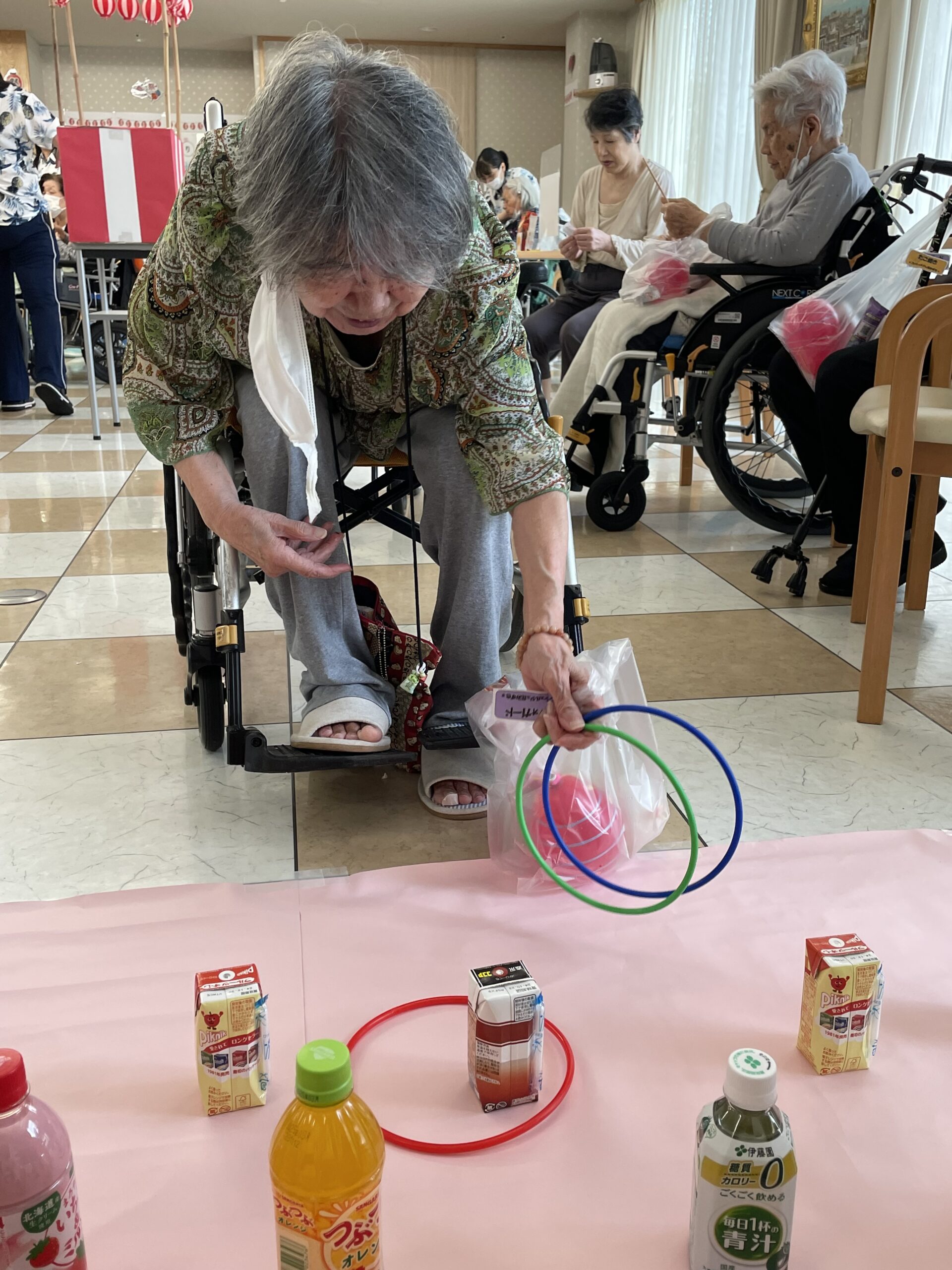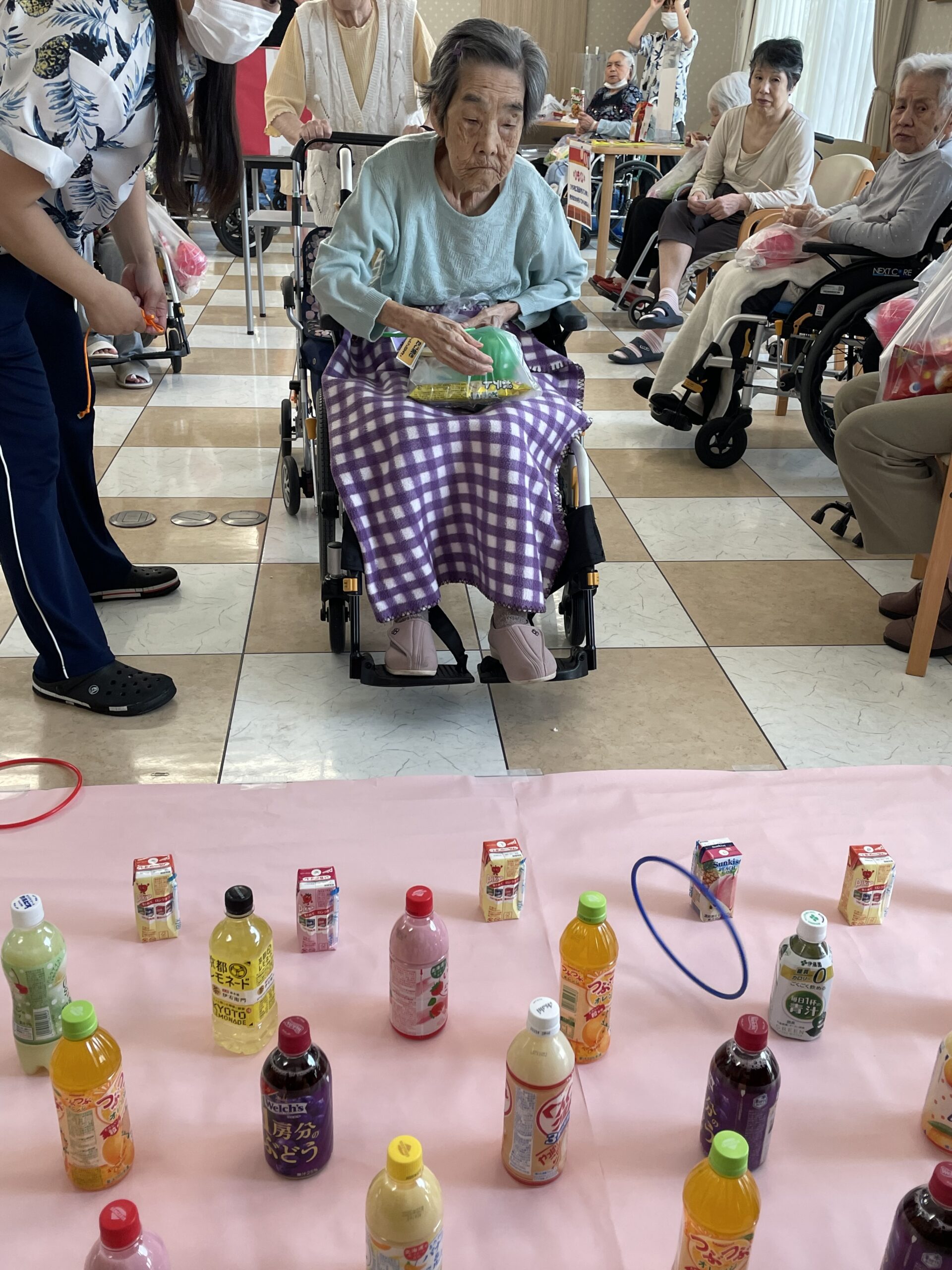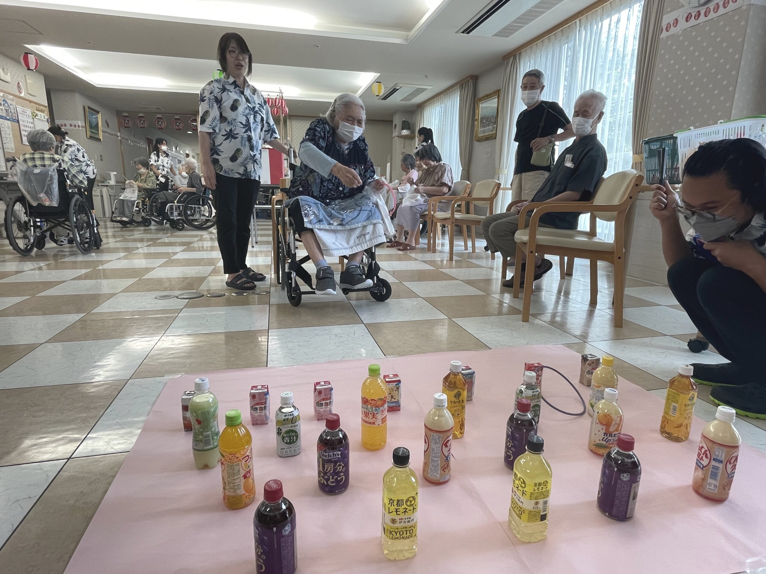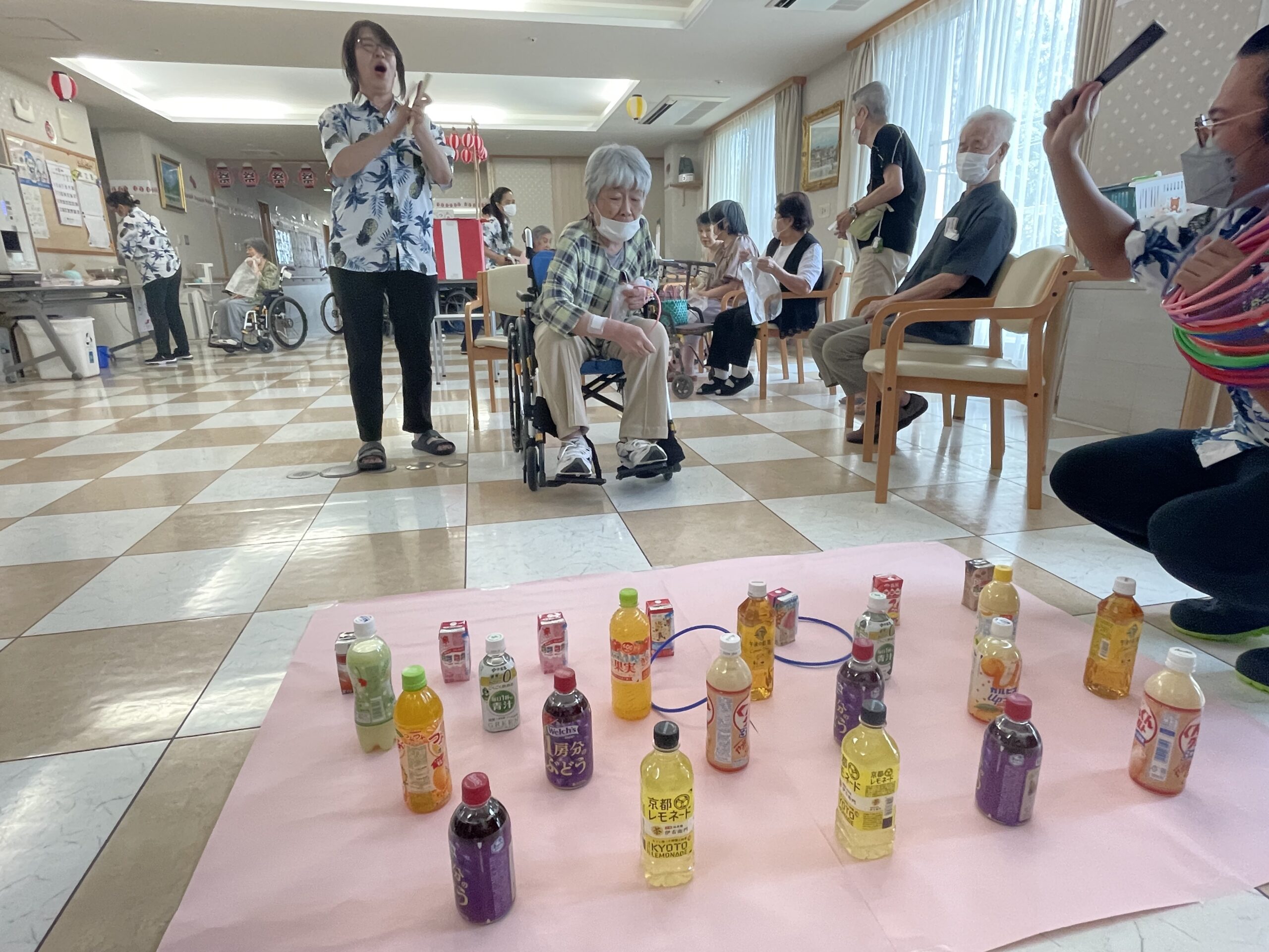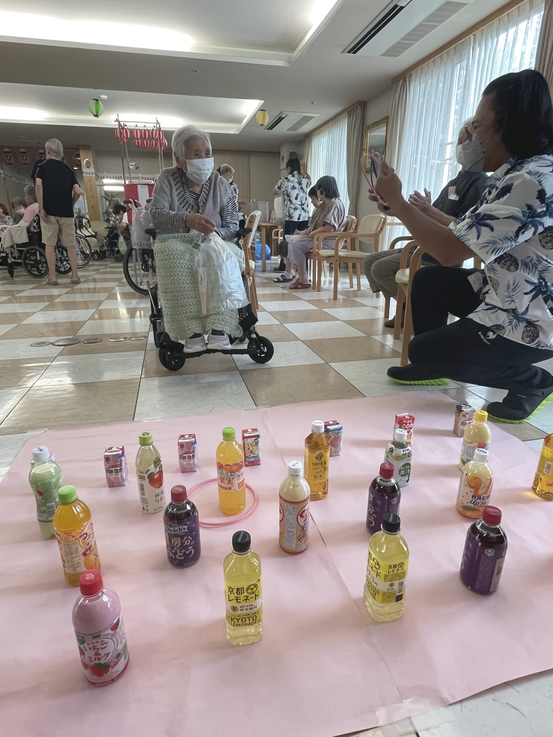 皆様の笑顔が沢山溢れた『ペットボトル輪投げ』になりました。次回のコンシェルジュ花みずき通信は…『千本お菓子くじ☆』に挑戦していただいた皆様のご様子をお届け致します。お楽しみに…☆