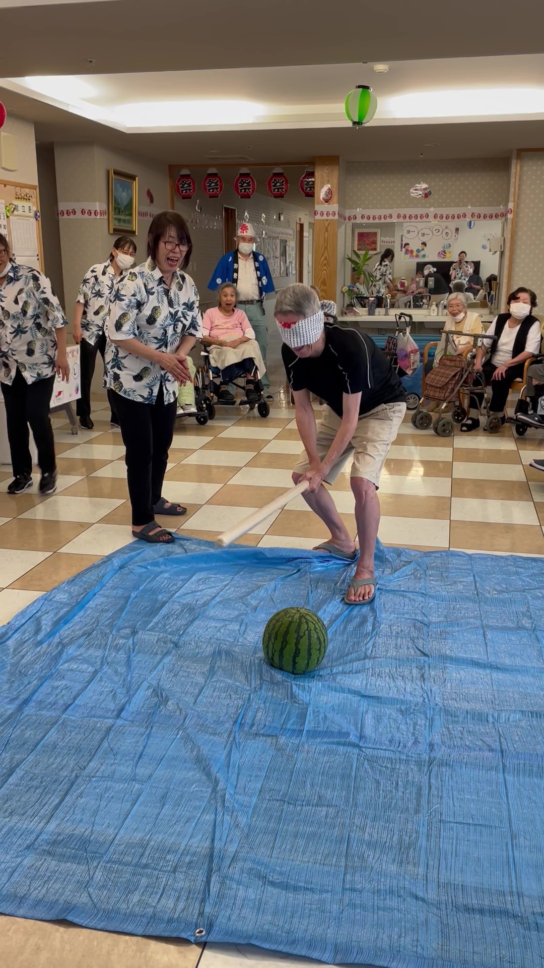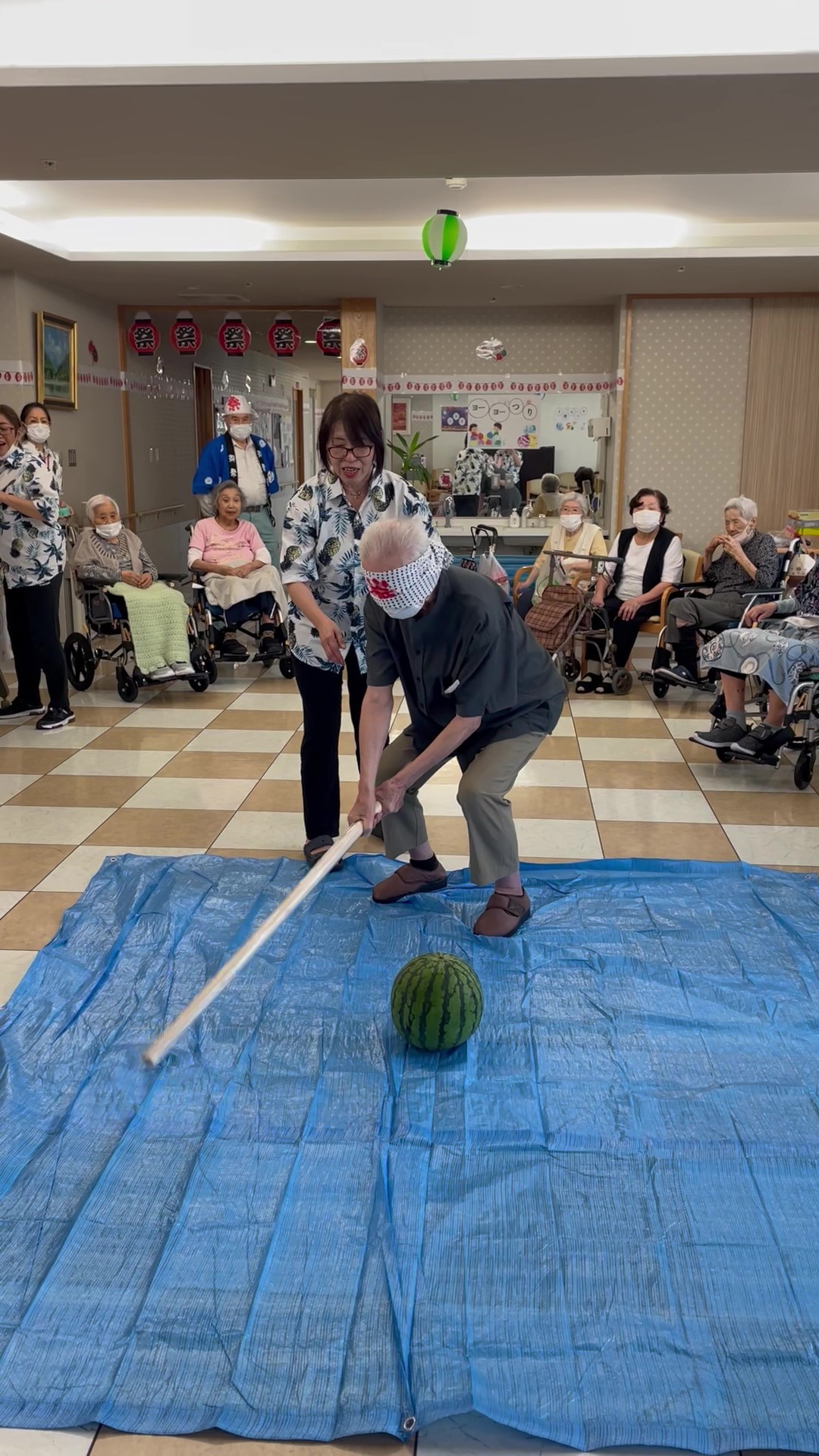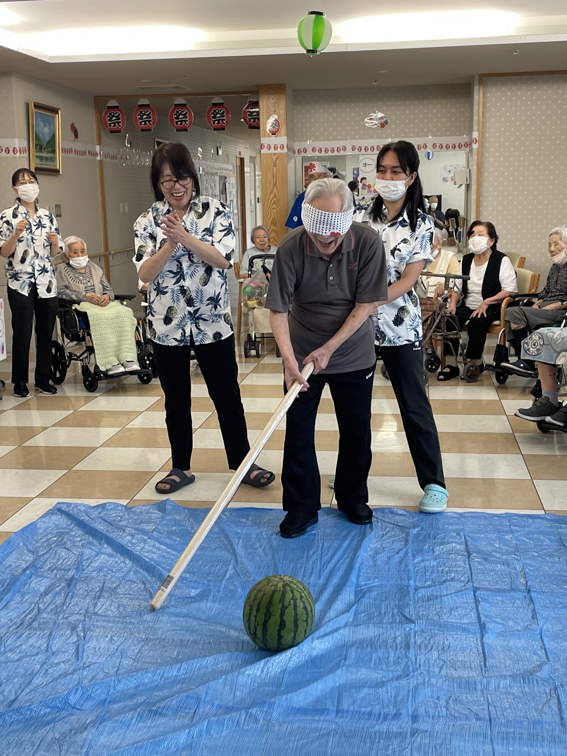 よ~く冷した大玉のスイカをご用意して ♪ 力自慢の男性の入居者の皆様に『スイカ割り』にチャレンジしていただきました☆