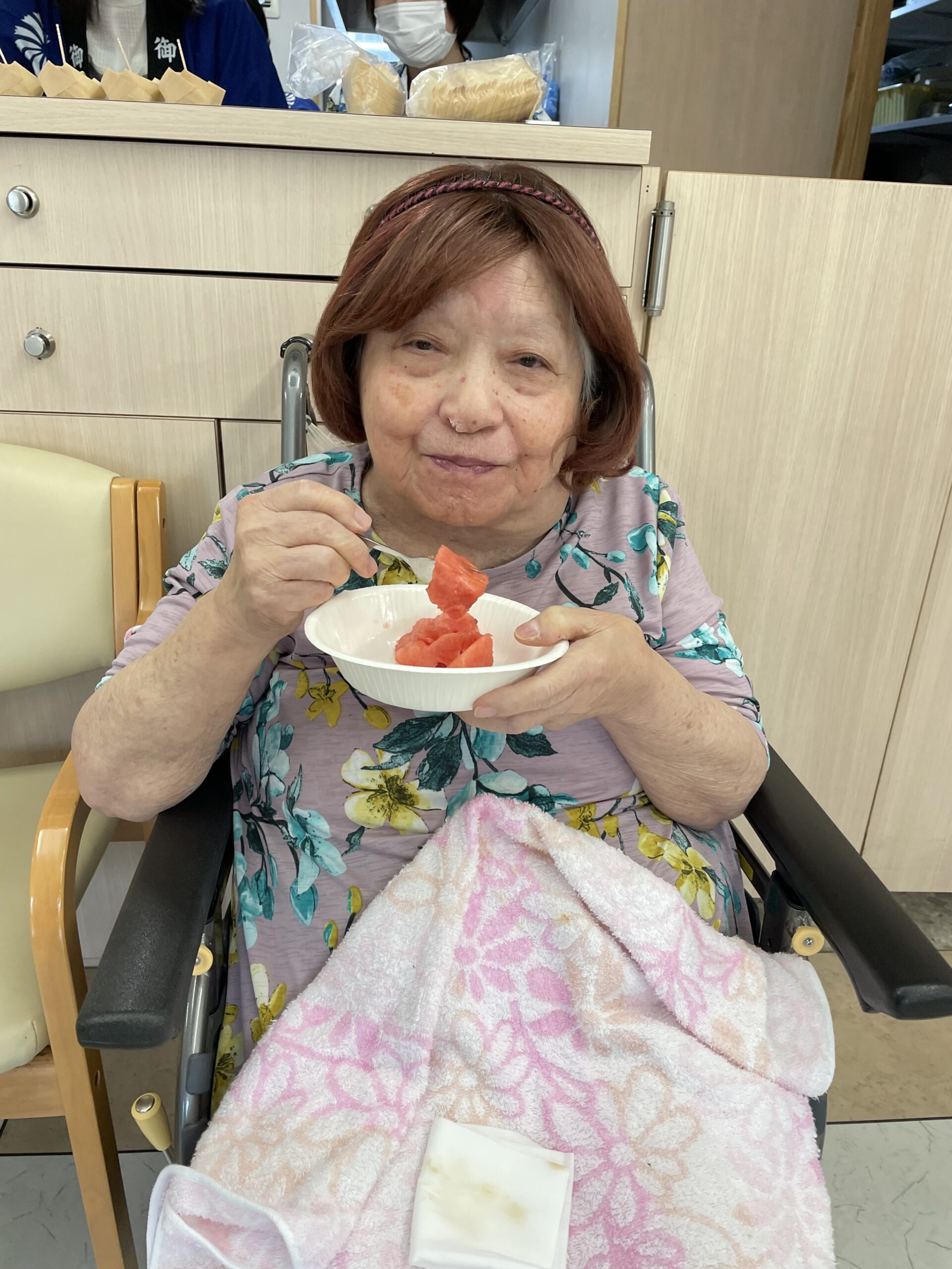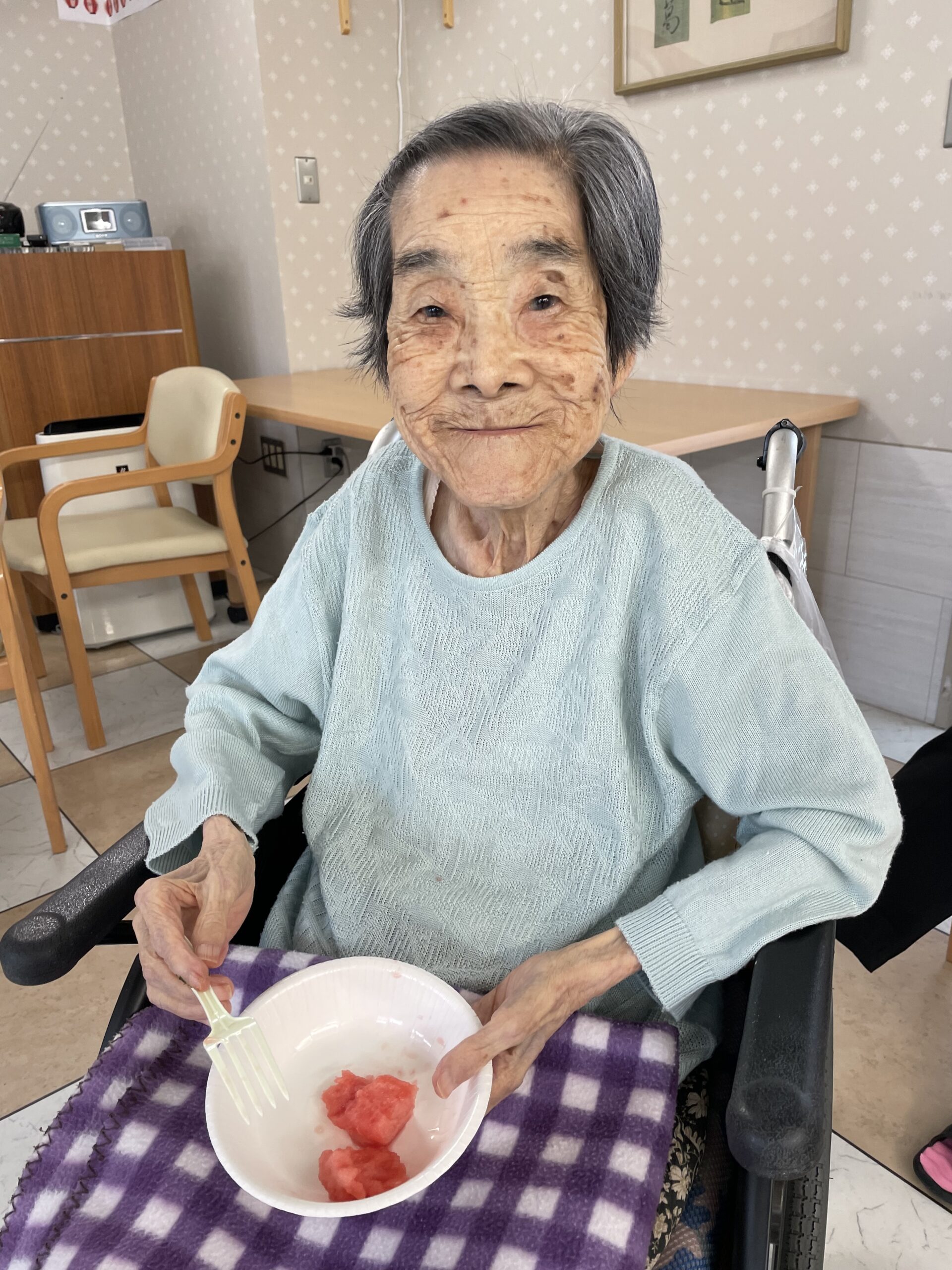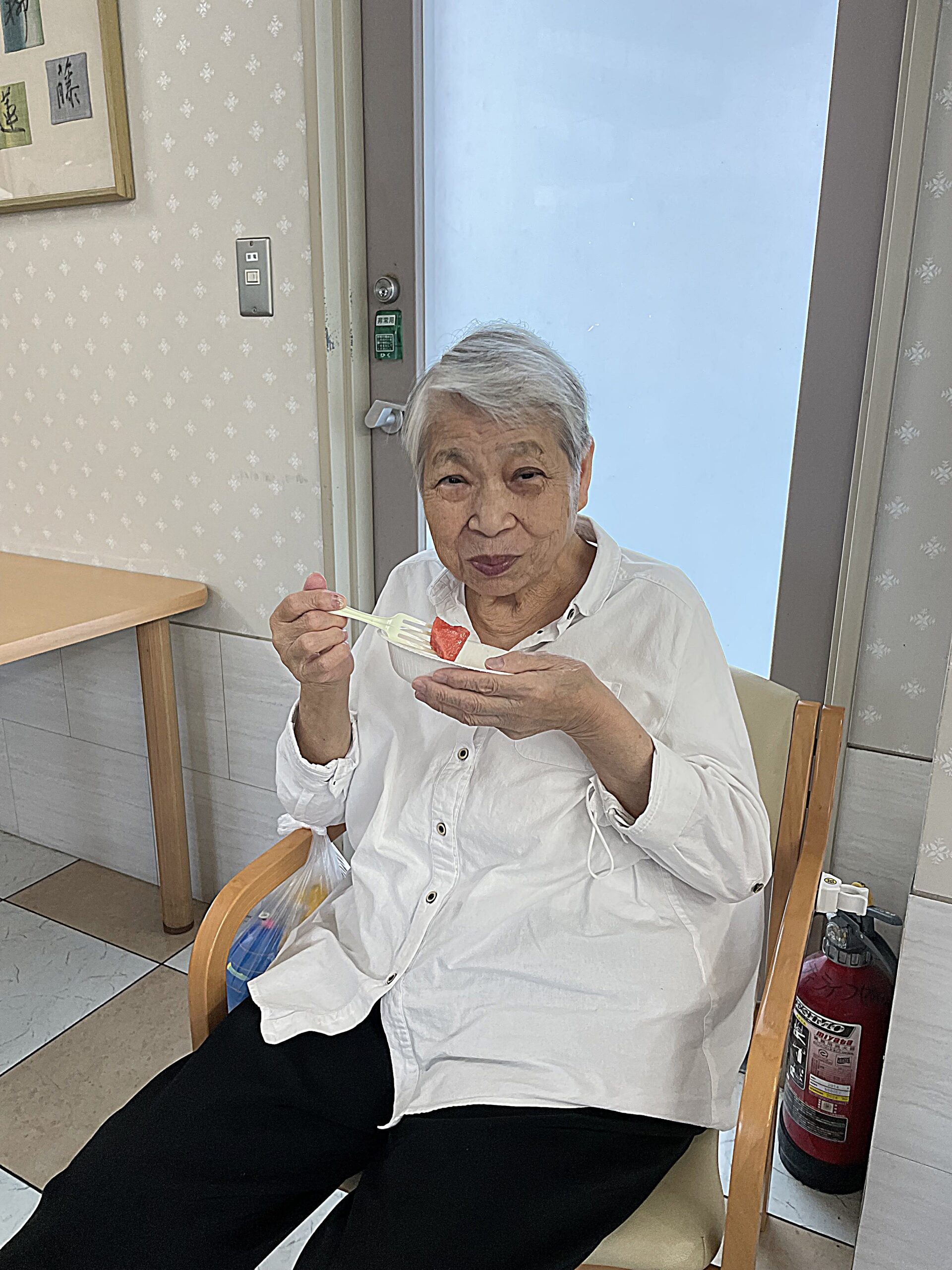 仲良しのご入居者様と楽しそうにお話しながらスイカを召し上がっていらっしゃいました ♪ お二人で「美味しいですね ♪ このスイカ!」とお話をされていらっしゃいました。