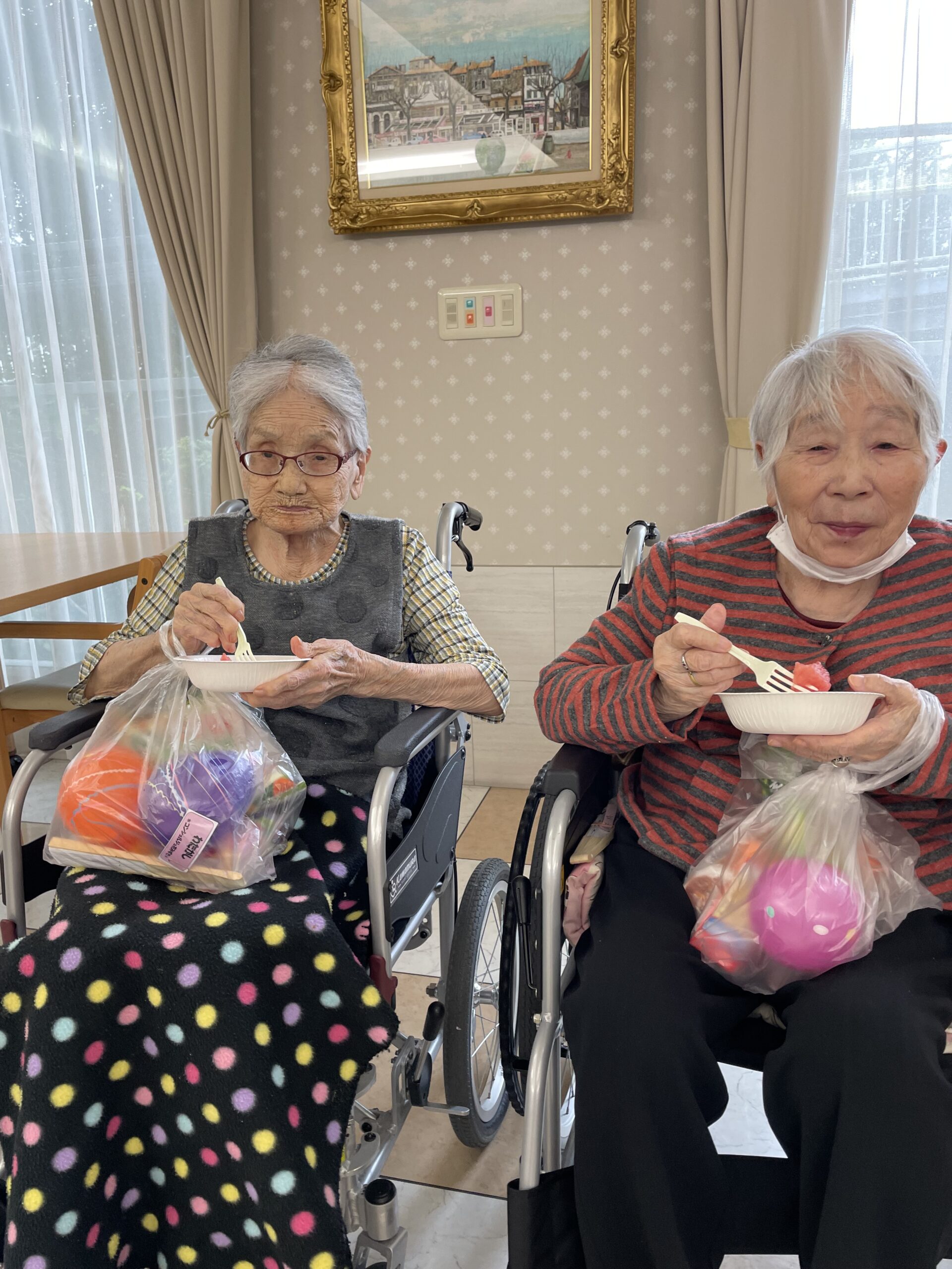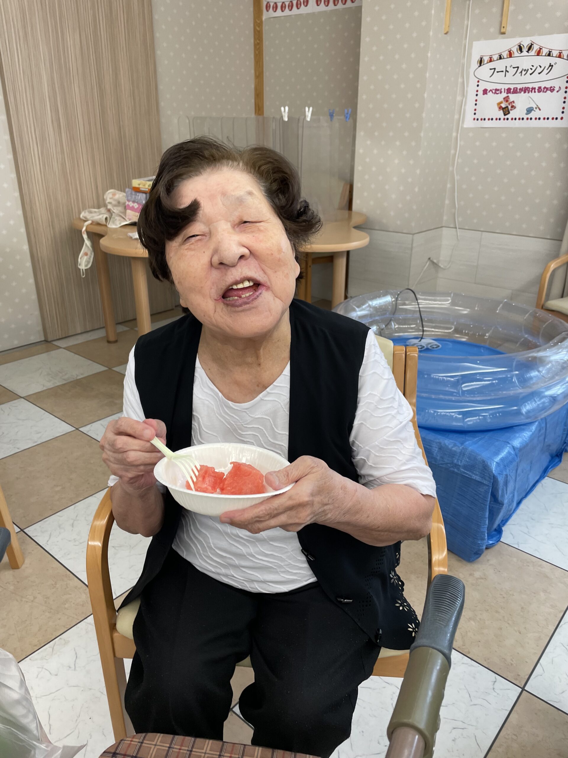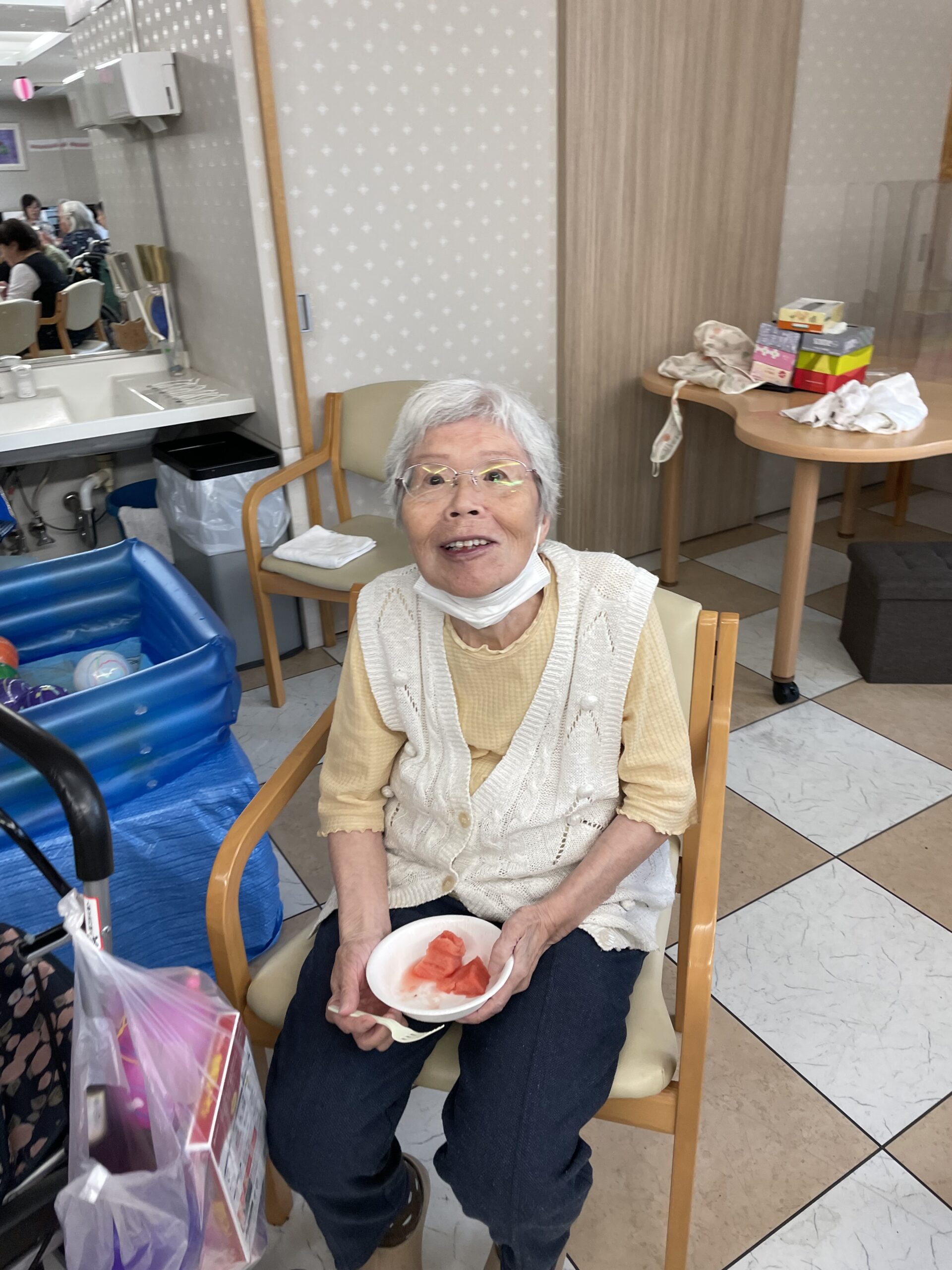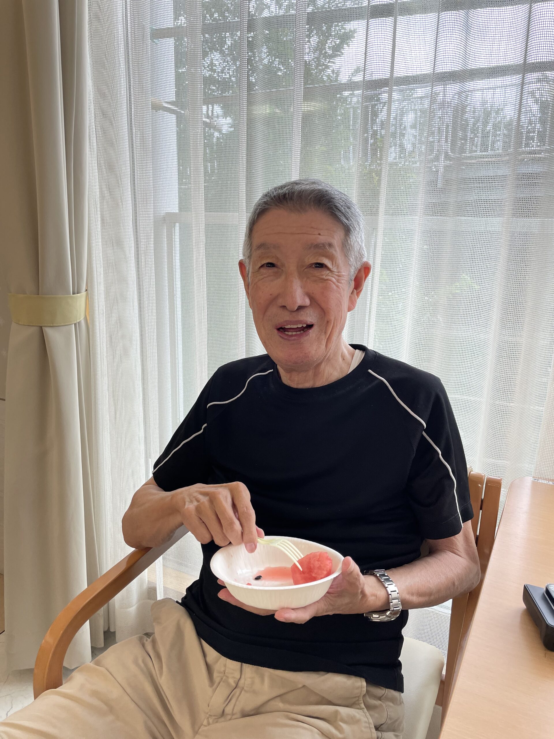 仲良しのご入居者様と楽しそうにお話しながらスイカを召し上がっていらっしゃいました ♪ お二人で「美味しいですね ♪ このスイカ!」とお話をされていらっしゃいました。