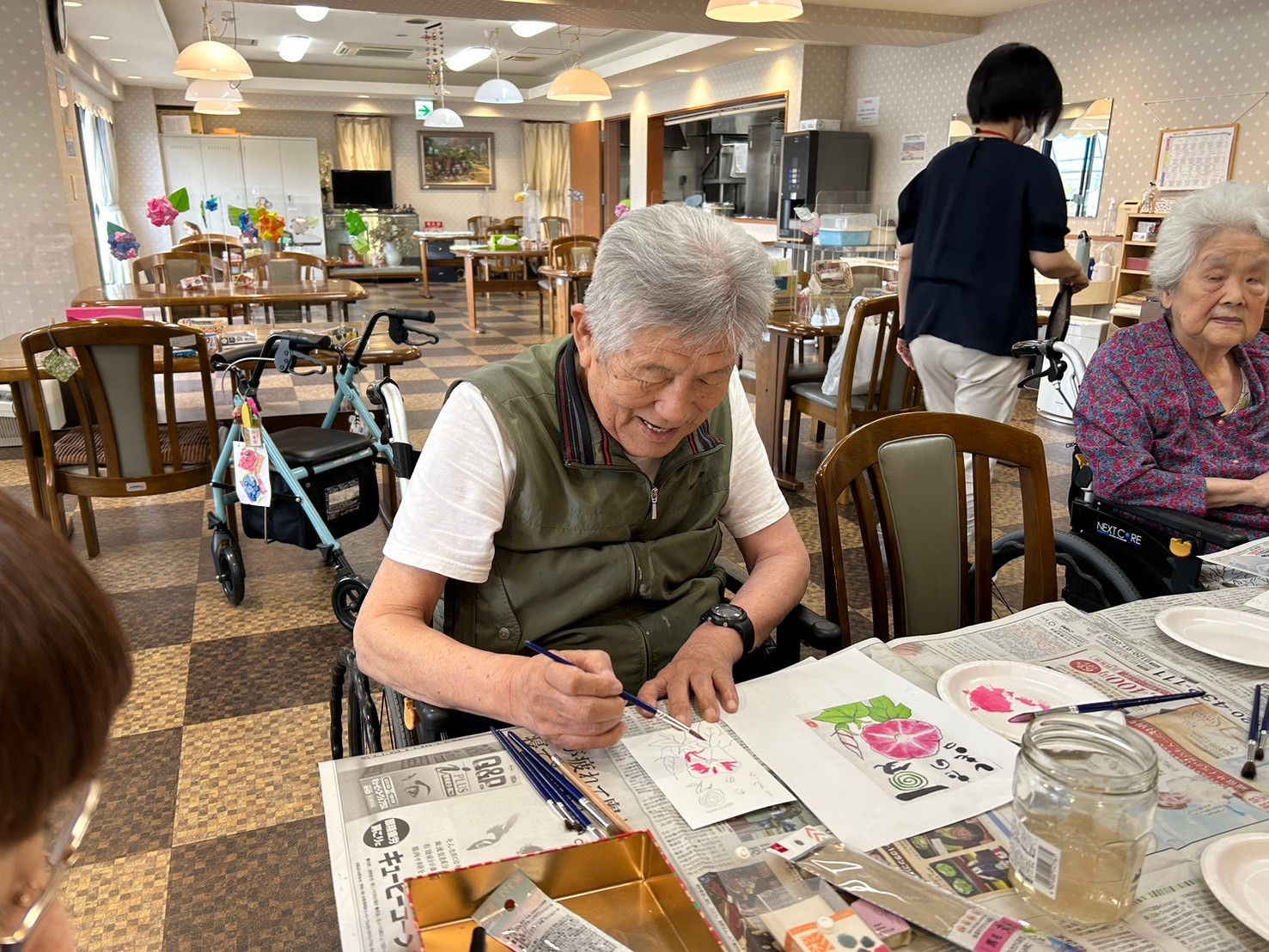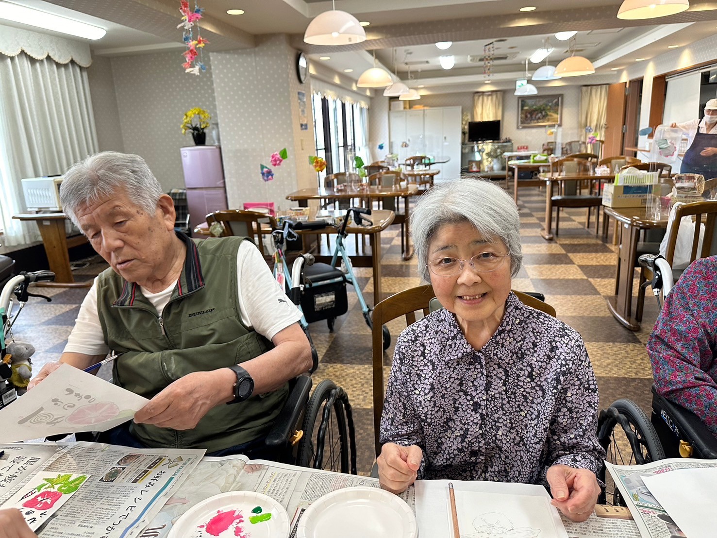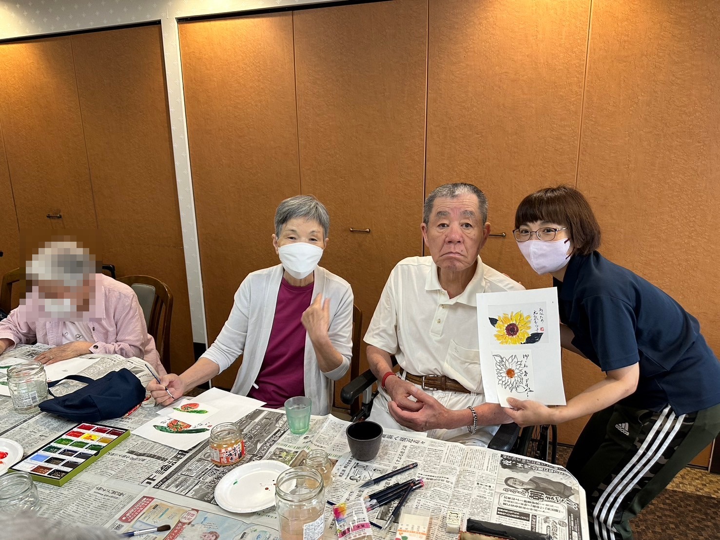 絵を描くのが苦手なご入居者様はスタッフが下書きをお手伝いさせていただきました。ぬり絵感覚で色付をしていただきます ♪