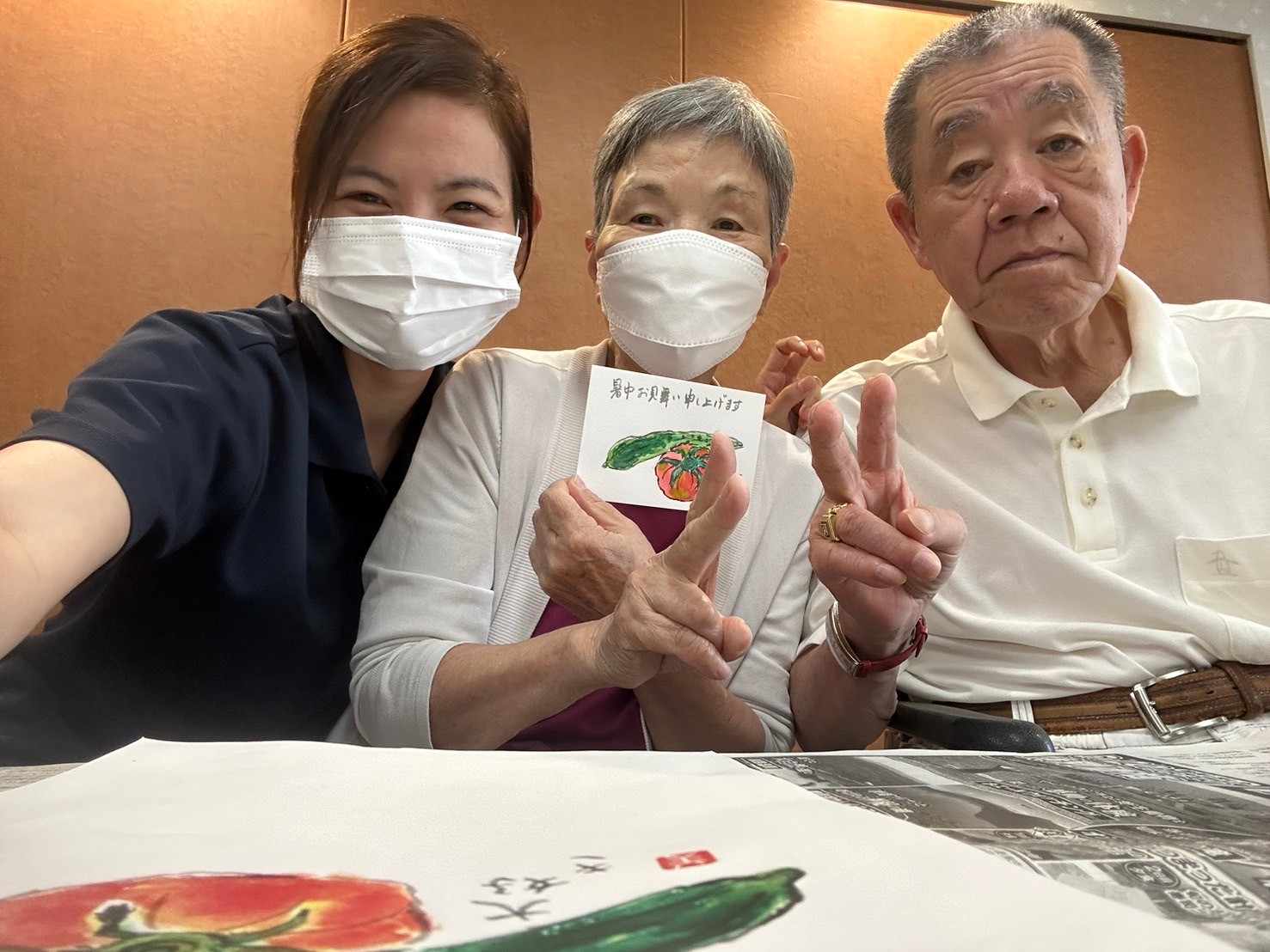 こちらのご入居者様の夏野菜の絵手紙はプロも顔負けなほどです☆ 周りの皆様からも「あんた、上手いな~!」と大絶賛でした ♪