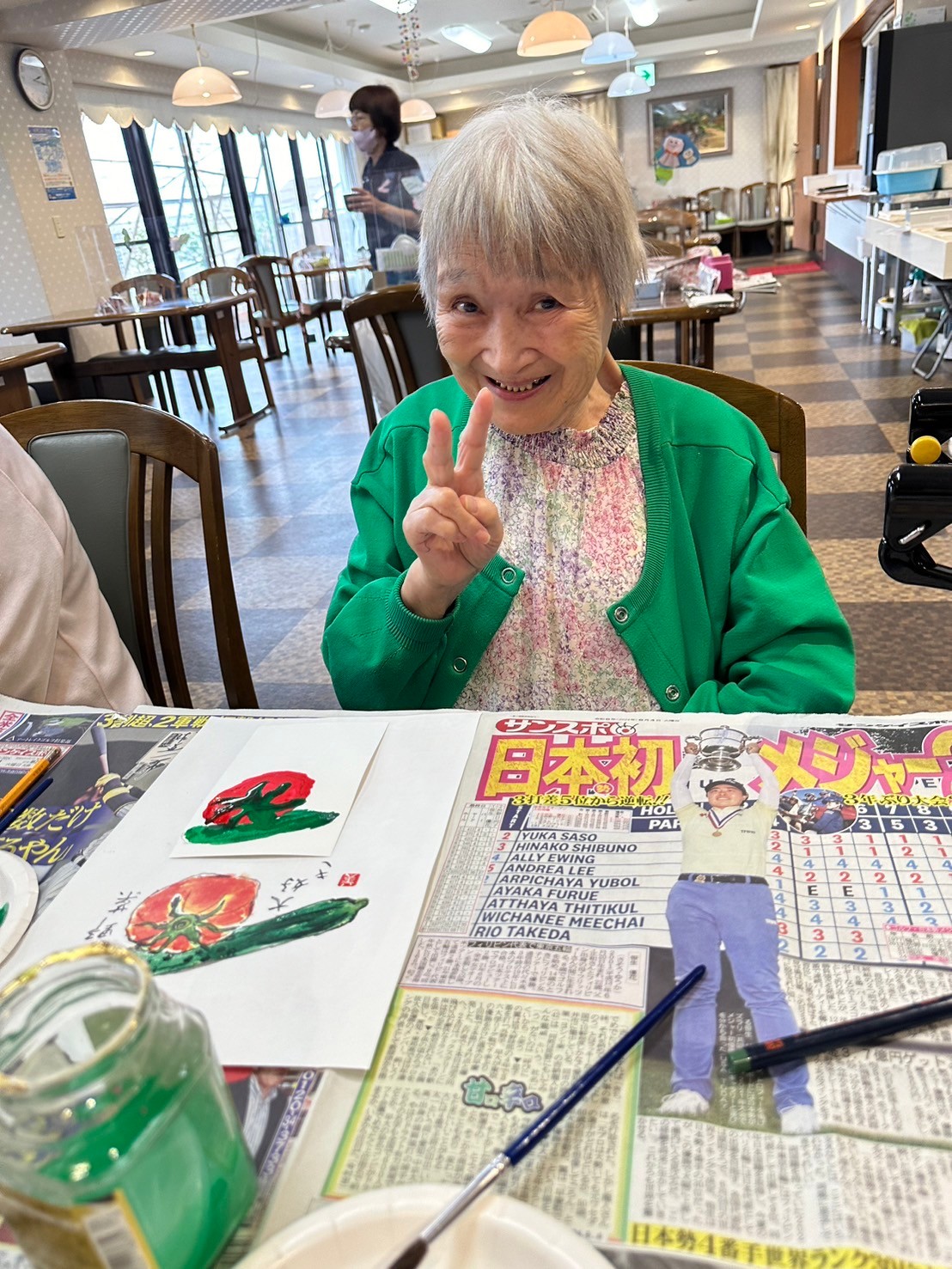 鮮やかな緑色のカーディガンをお召になっているこちらのご入居者様☆ 夏野菜のきゅうりのビタミンカラーとマッチしていますね☆ とっても素敵な笑顔を有難うございます☆