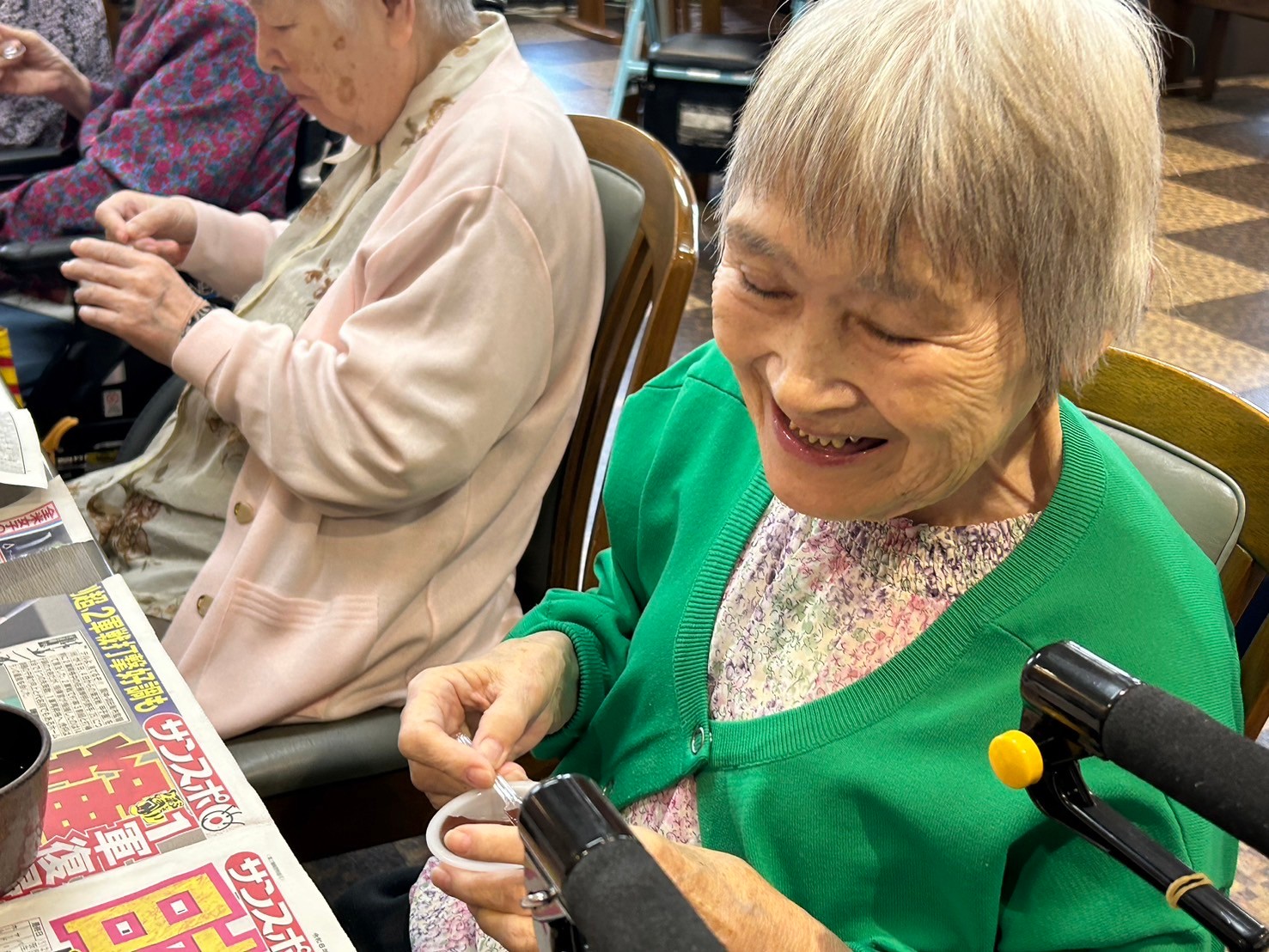 いつも優しい笑顔が素敵なこちらのご入居者様☆ 周りのお席の皆様とも会話が弾んでいらっしゃいました ♪