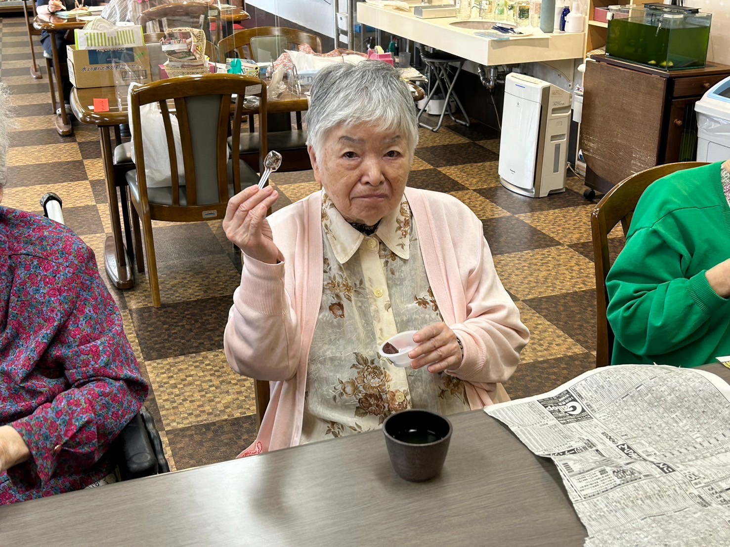 「お味はどうですか?」とお声がけすると「うん!美味しい!」とばっちり決めポーズをとってくださいました☆ チャーミングなご入居者様です ♪