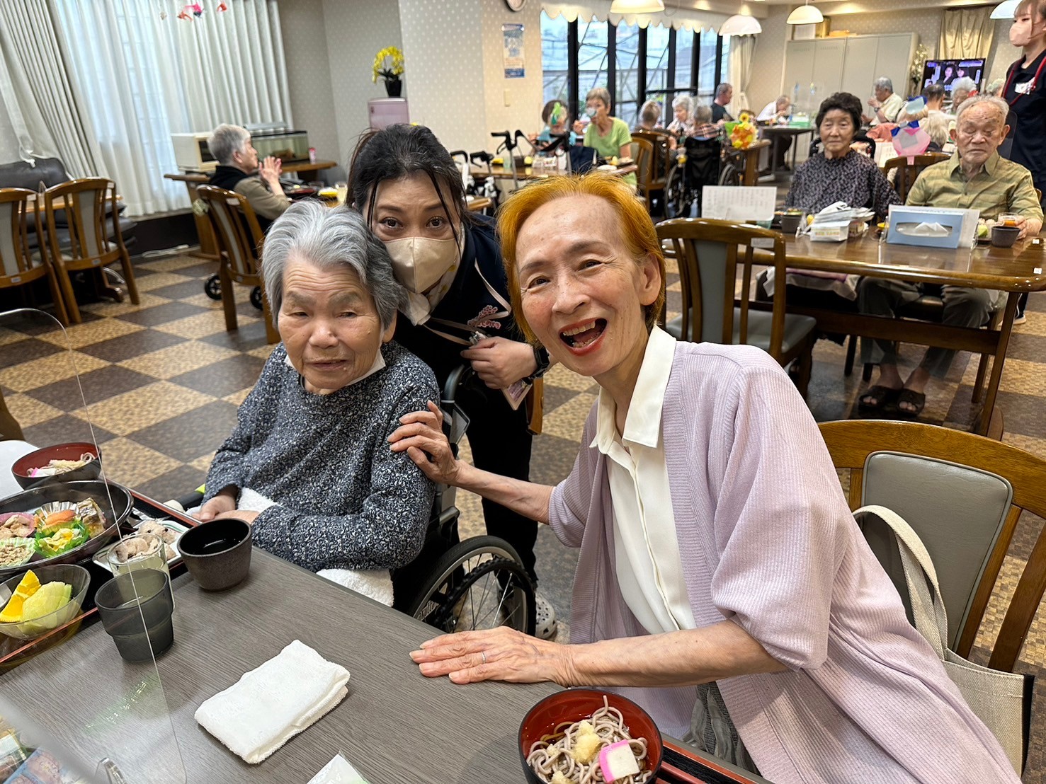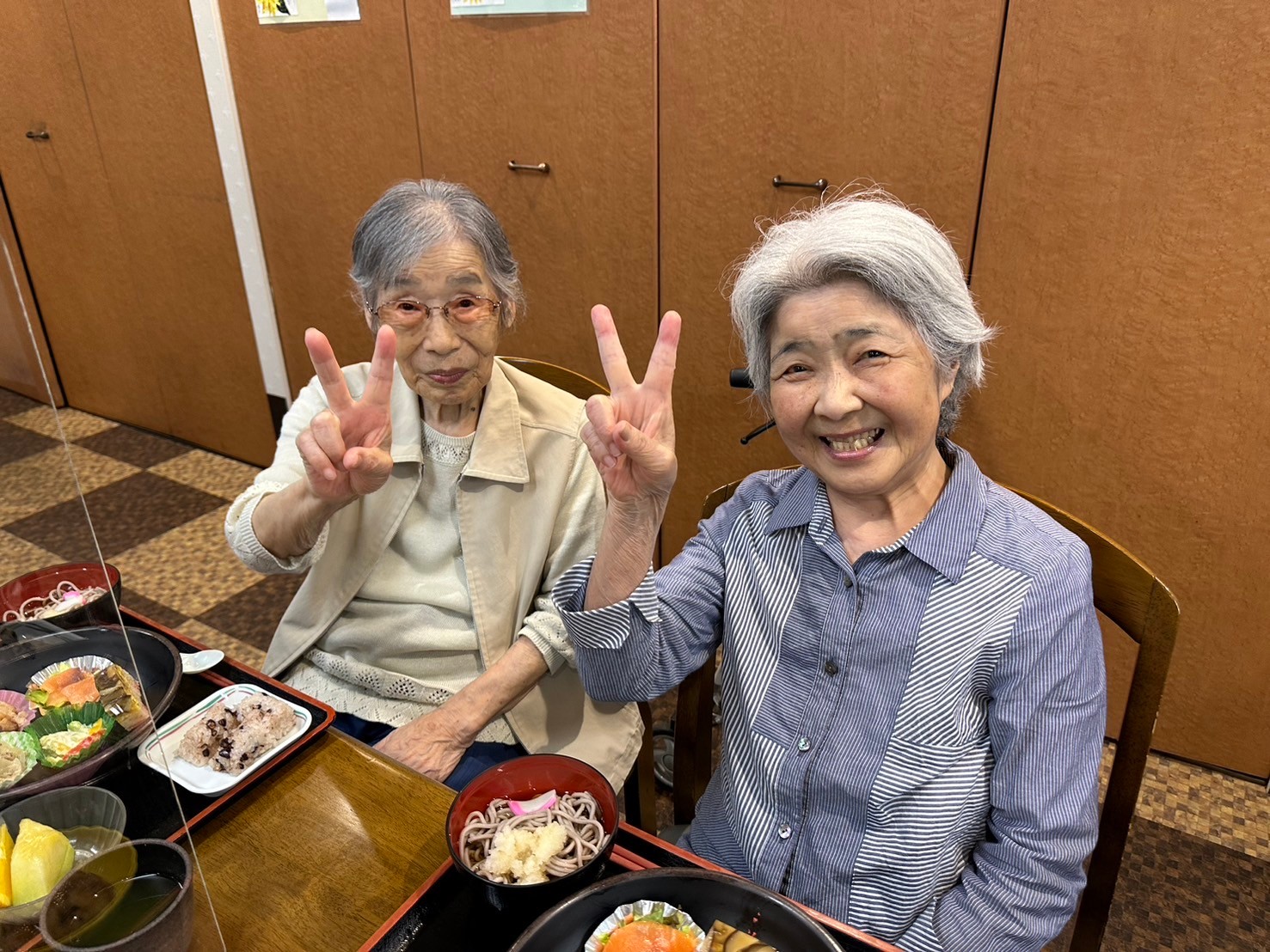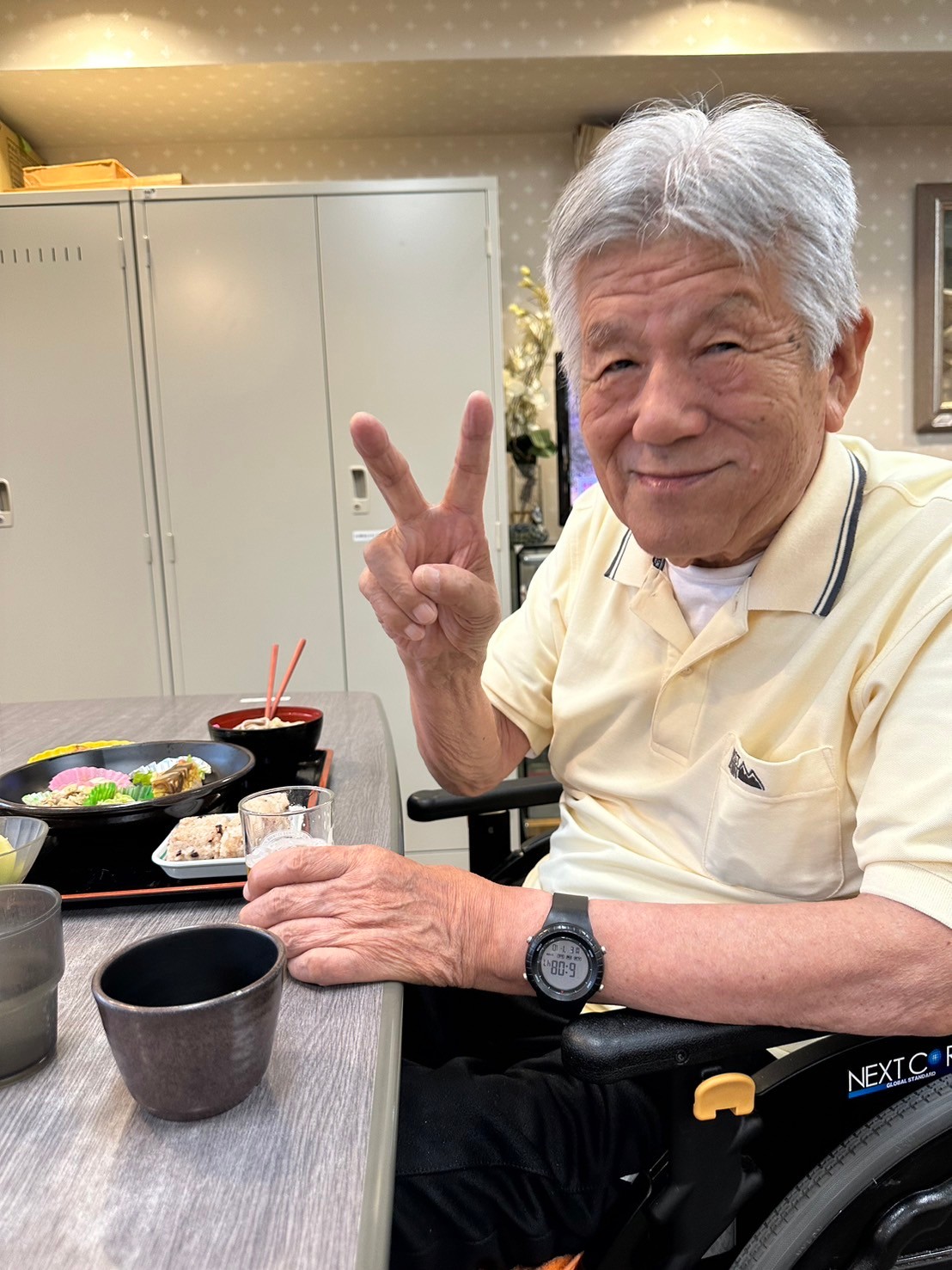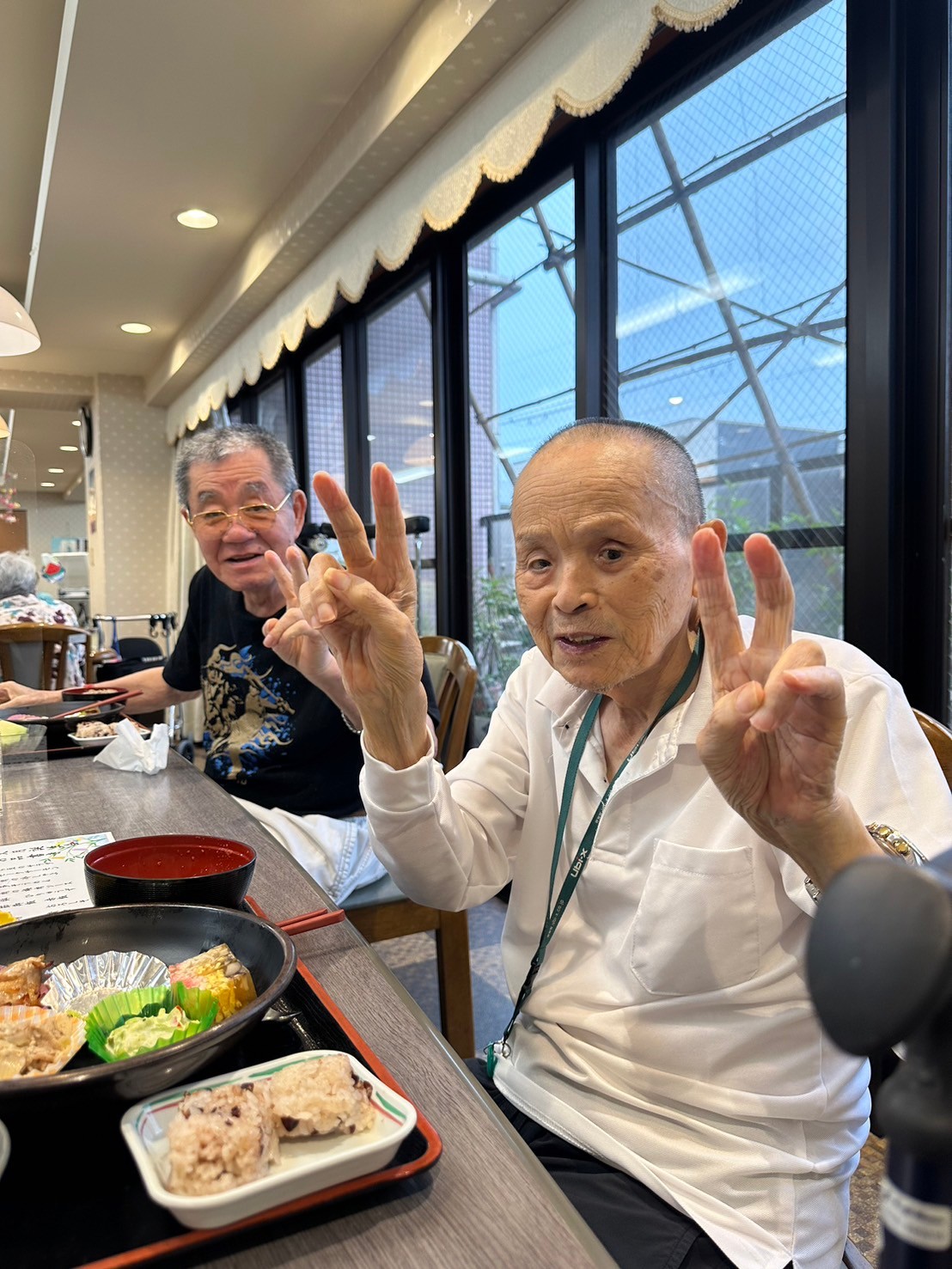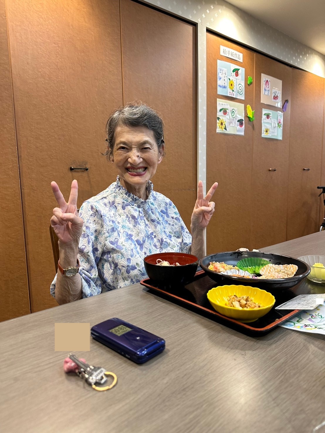 普段のお食事も美味しいのですが、お誕生日会の特別食はやっぱり特別☆ 自然とカメラに向かってピースサイン☆ご入居者様の沢山の笑顔のお写真が撮れました ♪