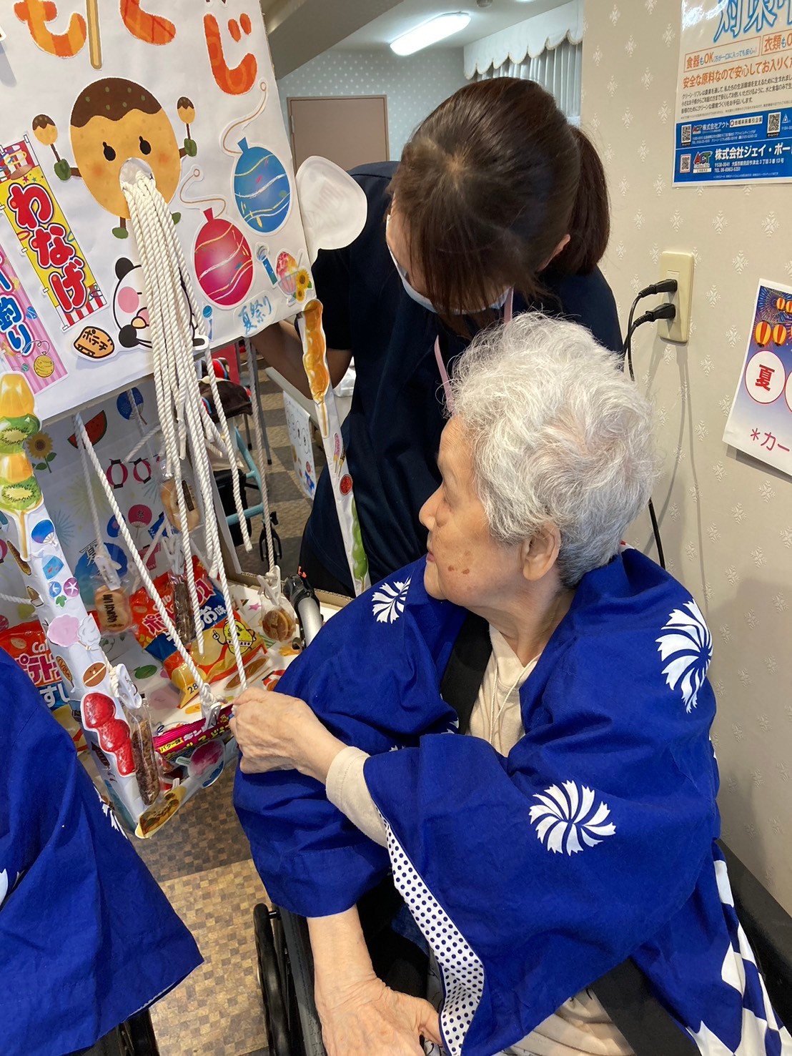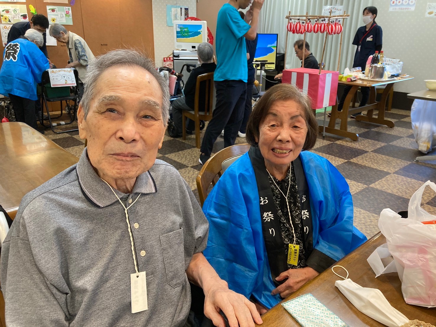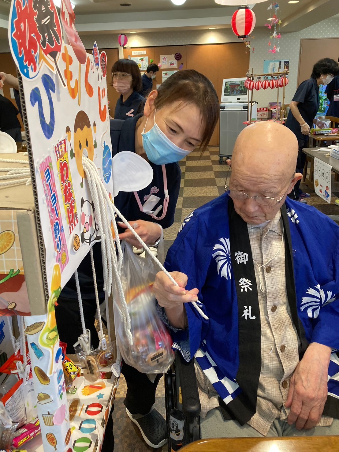 袋の中にゲームの景品が沢山入っています。「夏祭りはどうですか?」とお声がけすると「楽しいよ!ありがとう☆」とおっしゃってくださいました☆夏祭りもお二人仲良くご一緒にご参加くださっていました ♪