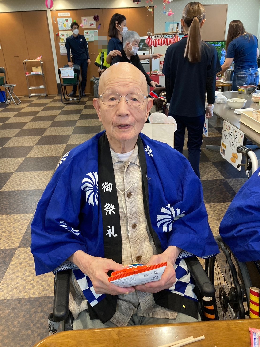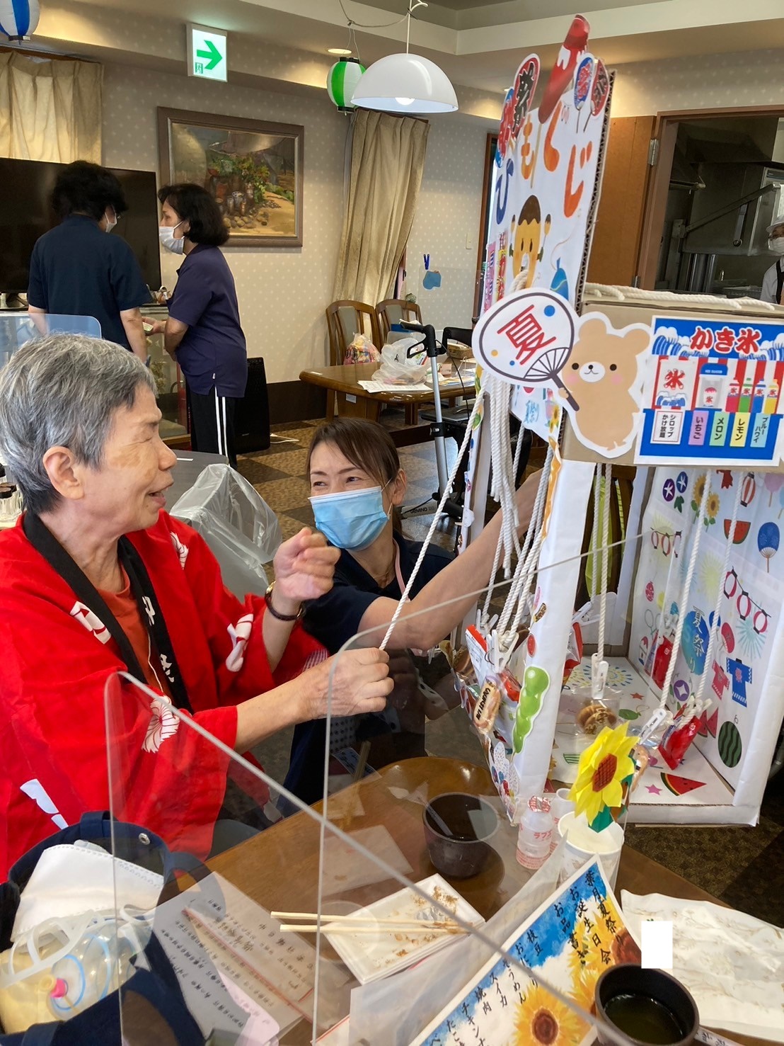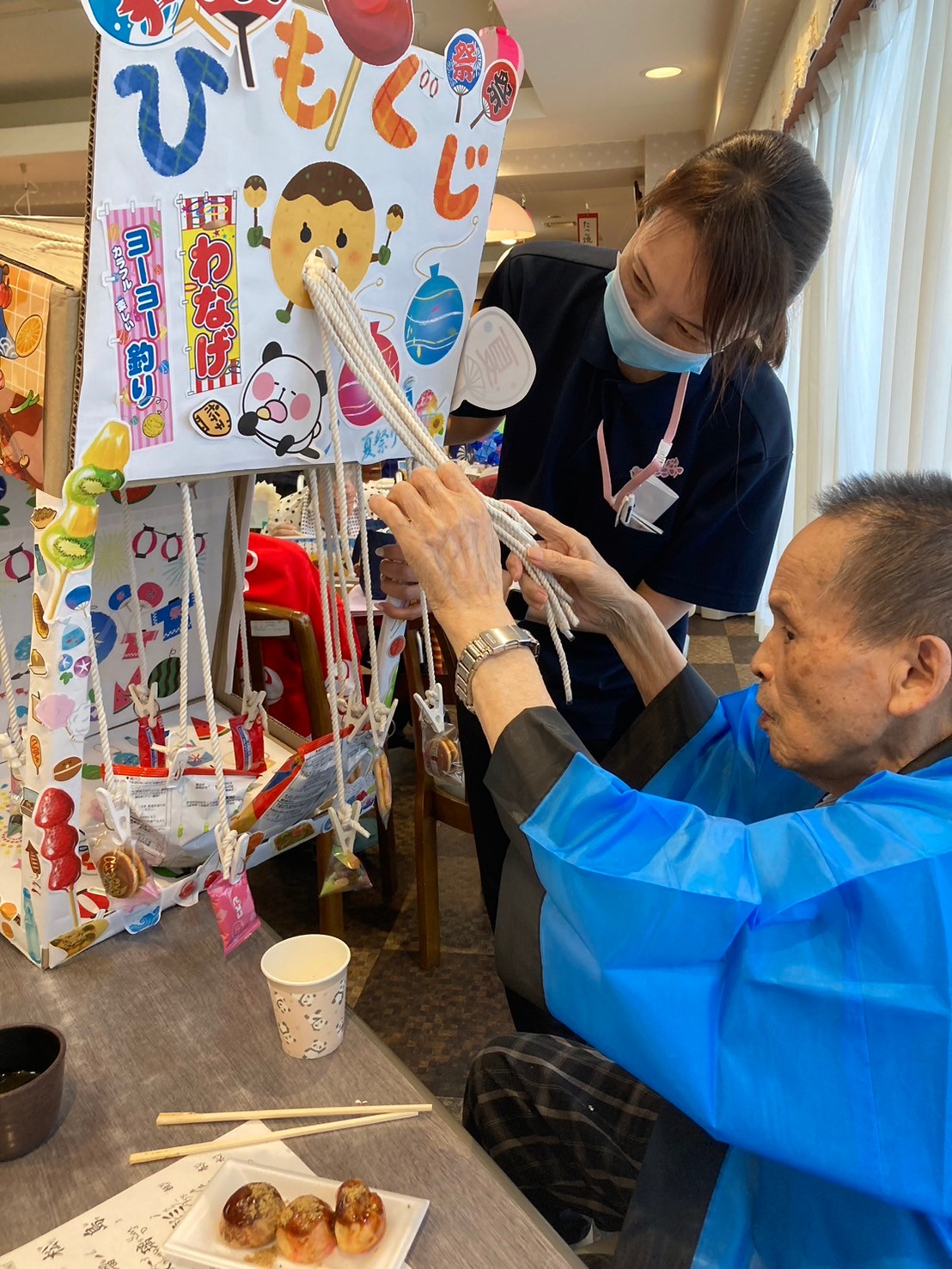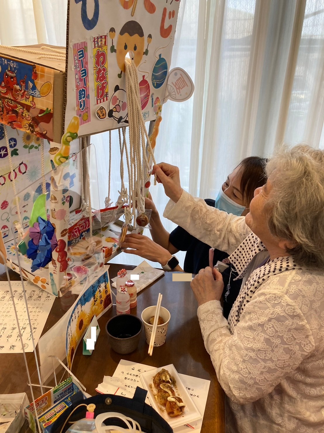 袋の中にゲームの景品が沢山入っています。「夏祭りはどうですか?」とお声がけすると「楽しいよ!ありがとう☆」とおっしゃってくださいました☆夏祭りもお二人仲良くご一緒にご参加くださっていました ♪