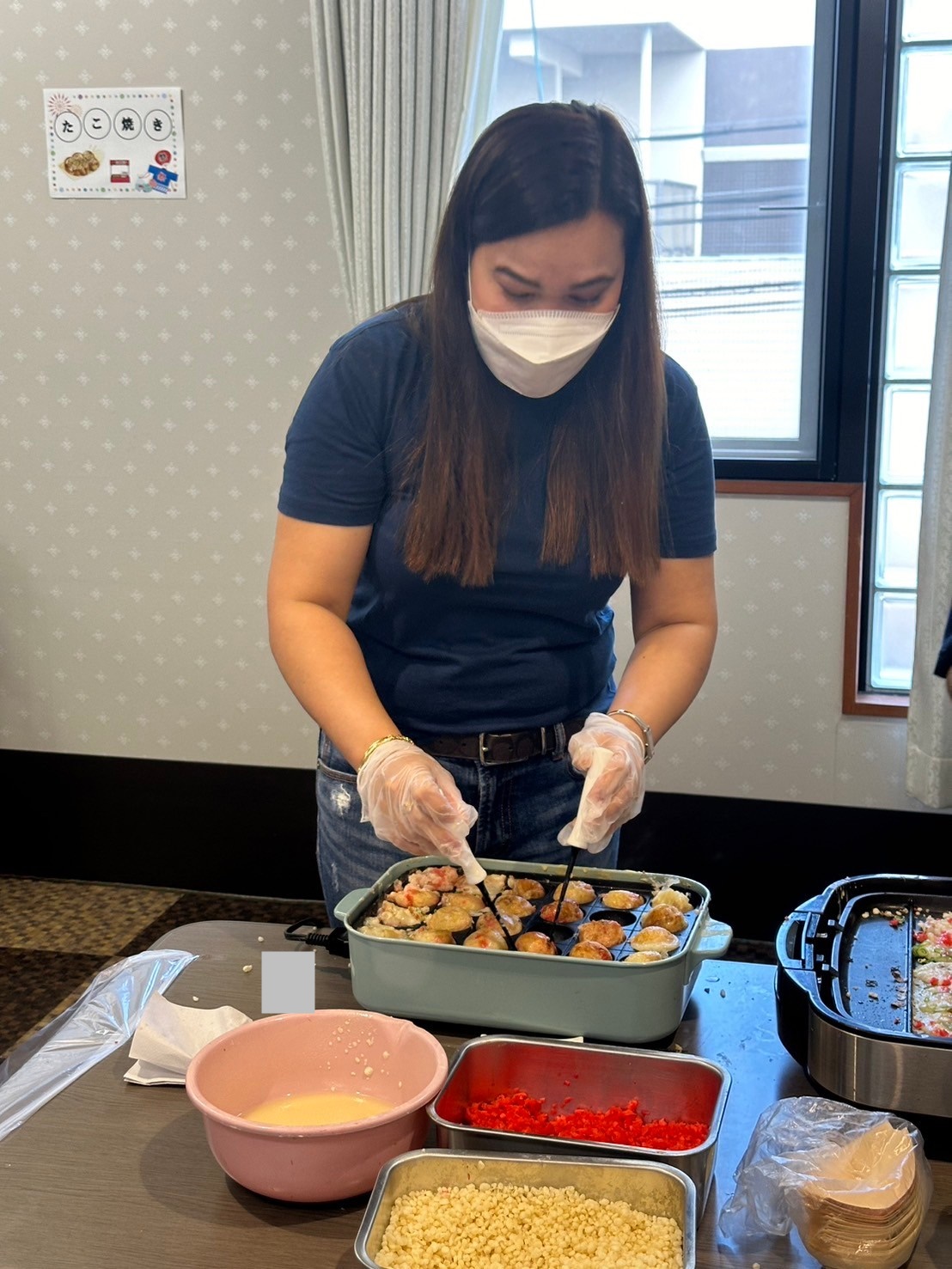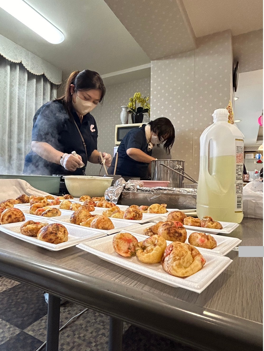 たこ焼きの横では他のスタッフがベビーカステラを皆様の為に一生懸命作っています☆ 美味しそうなたこ焼きが並んでいますね ♪