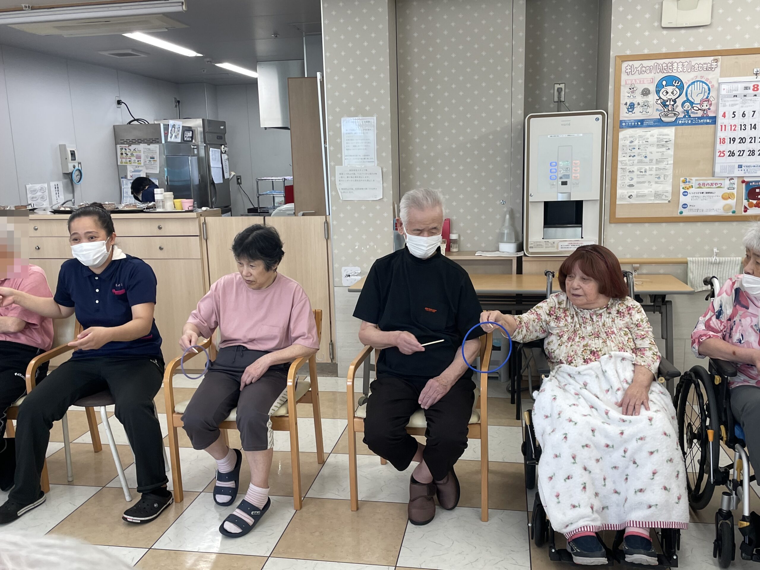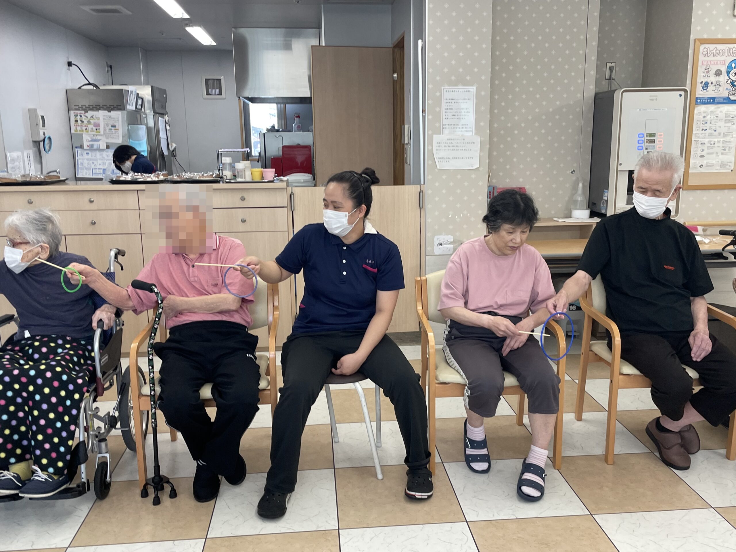 お写真にある輪っかは輪投げ用の輪っかです!つるつるしていて少し滑るのが難点!慎重にお隣の方へパスをしていらっしゃいます。皆様お上手です☆