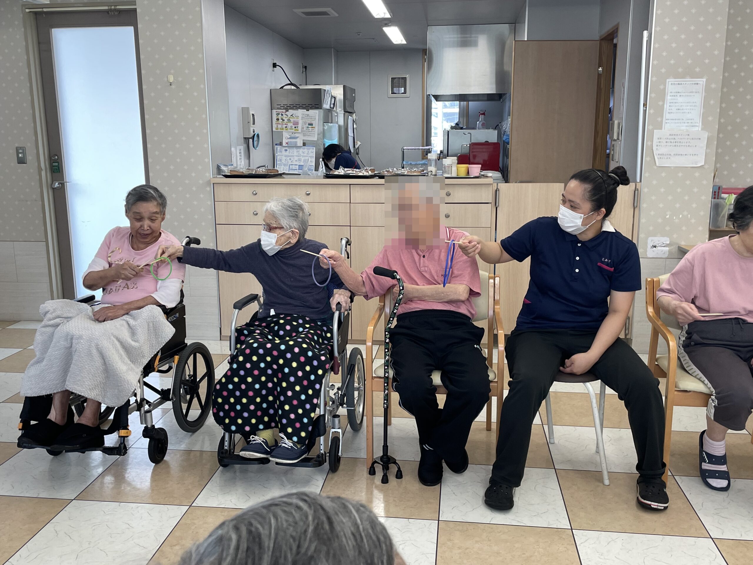 最後の方へ順調にパスが回っています!後はゴールのスタッフに渡すだけです!! 次々と回ってくる輪っかに最後のご入居者様は笑いがこみ上げてきます(笑)「いっぱいや~!」と言いながら一生懸命ゴールに運んでいらっしゃいました☆