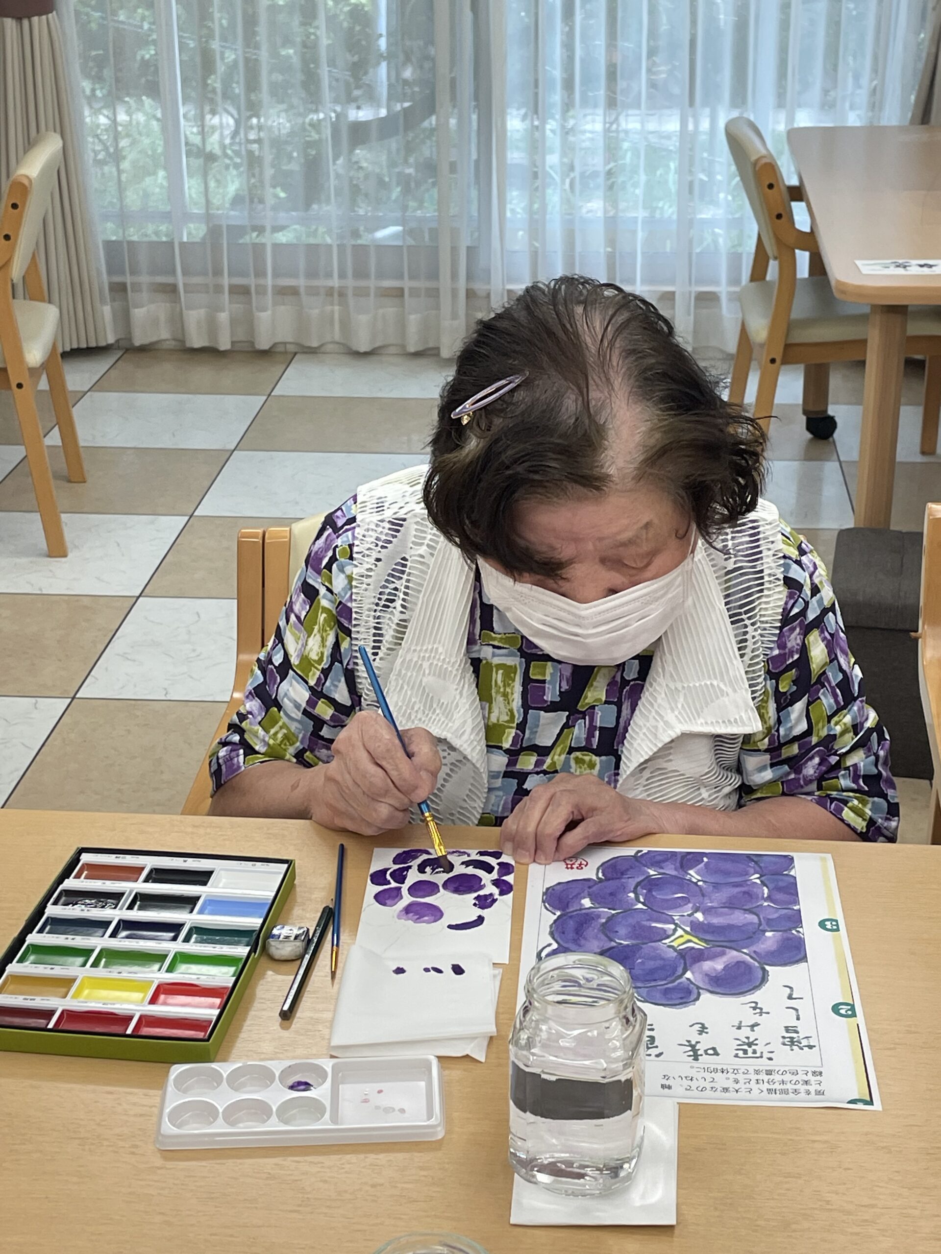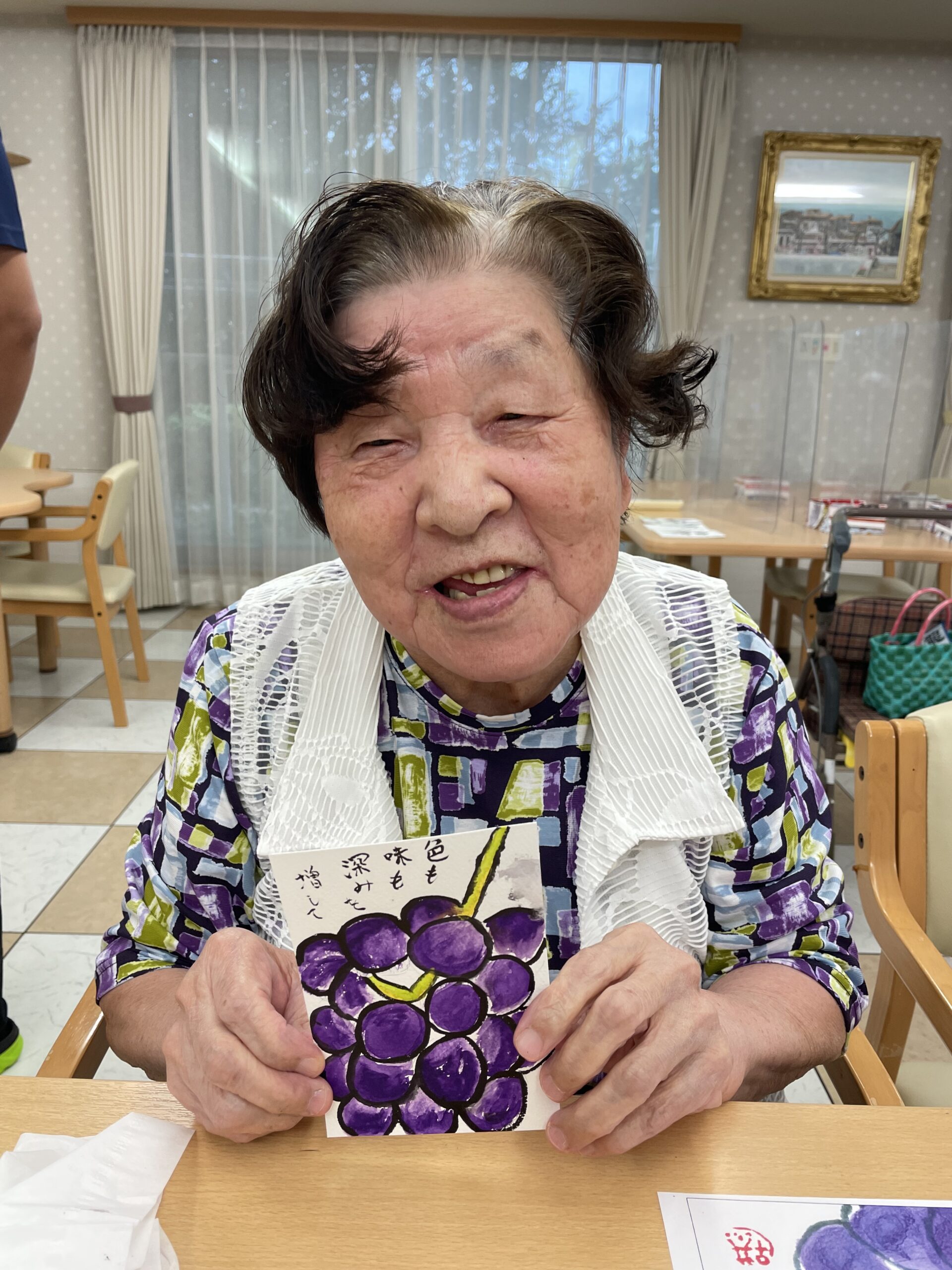 こちらのご入居者様は「葡萄」を描いていらっしゃいます☆ お手本通りに余白の白い部分も上手に残して描いていらっしゃいます ♪ もうこの段階で美味しそうです!