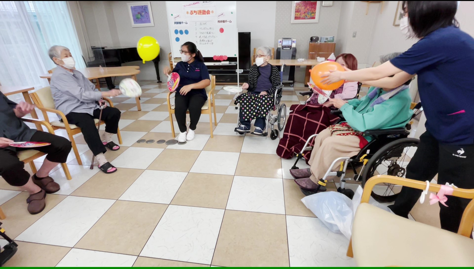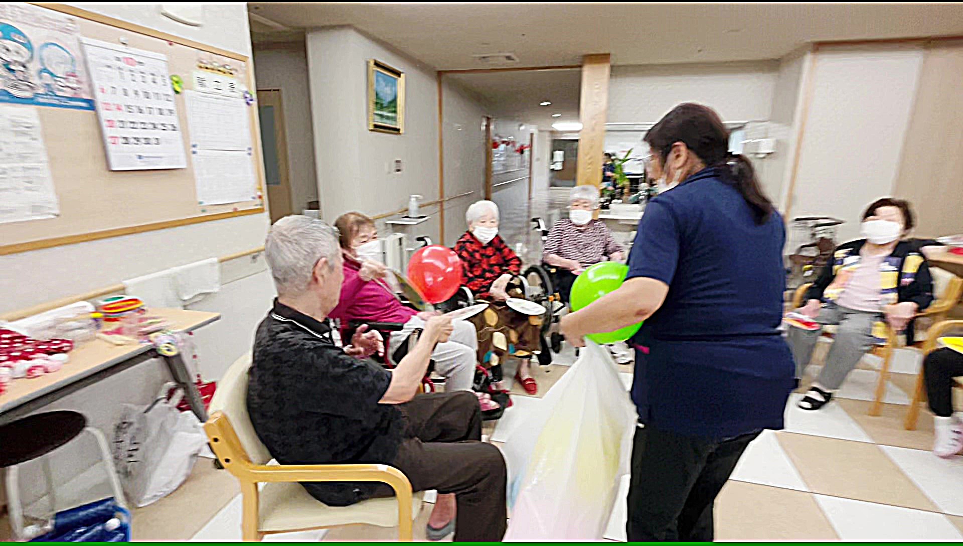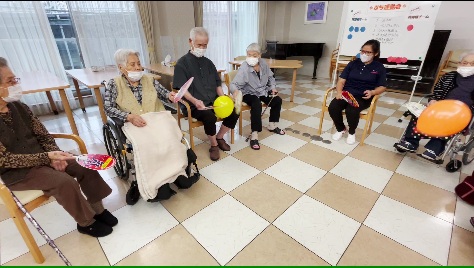 普段は風船を使用するレクリエーションと言えば… 風船バレーが多いのですが、今回はうちわの上に風船を乗せてお隣の方へ渡してリレーをしていただきました ♪