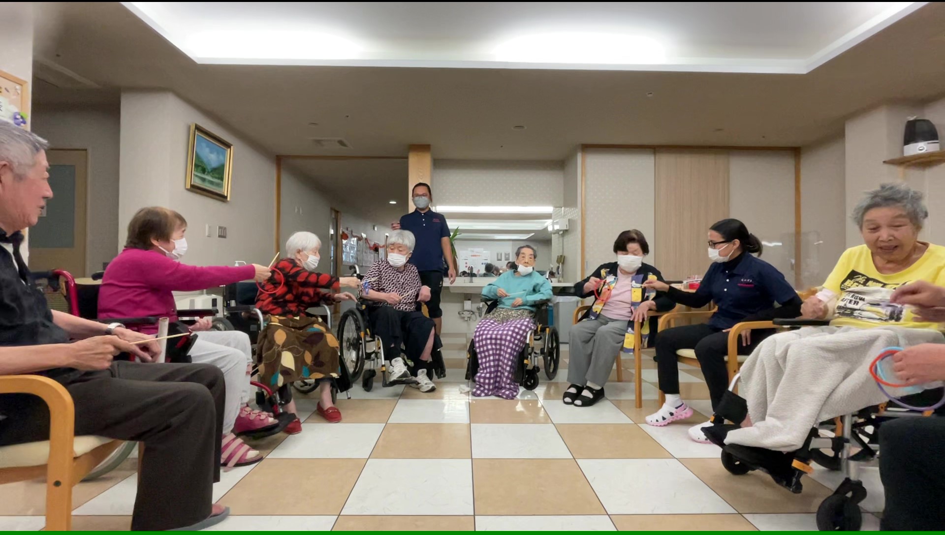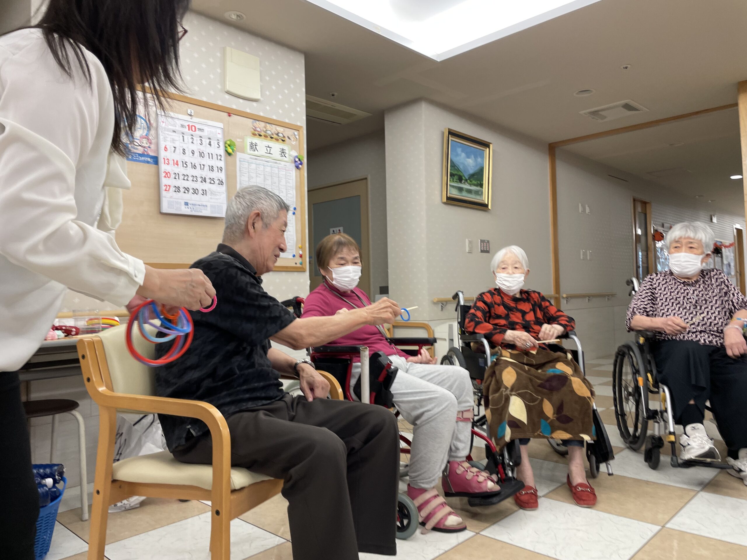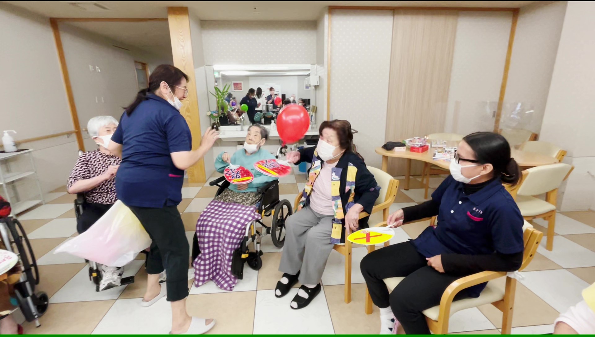 普段は風船を使用するレクリエーションと言えば… 風船バレーが多いのですが、今回はうちわの上に風船を乗せてお隣の方へ渡してリレーをしていただきました ♪