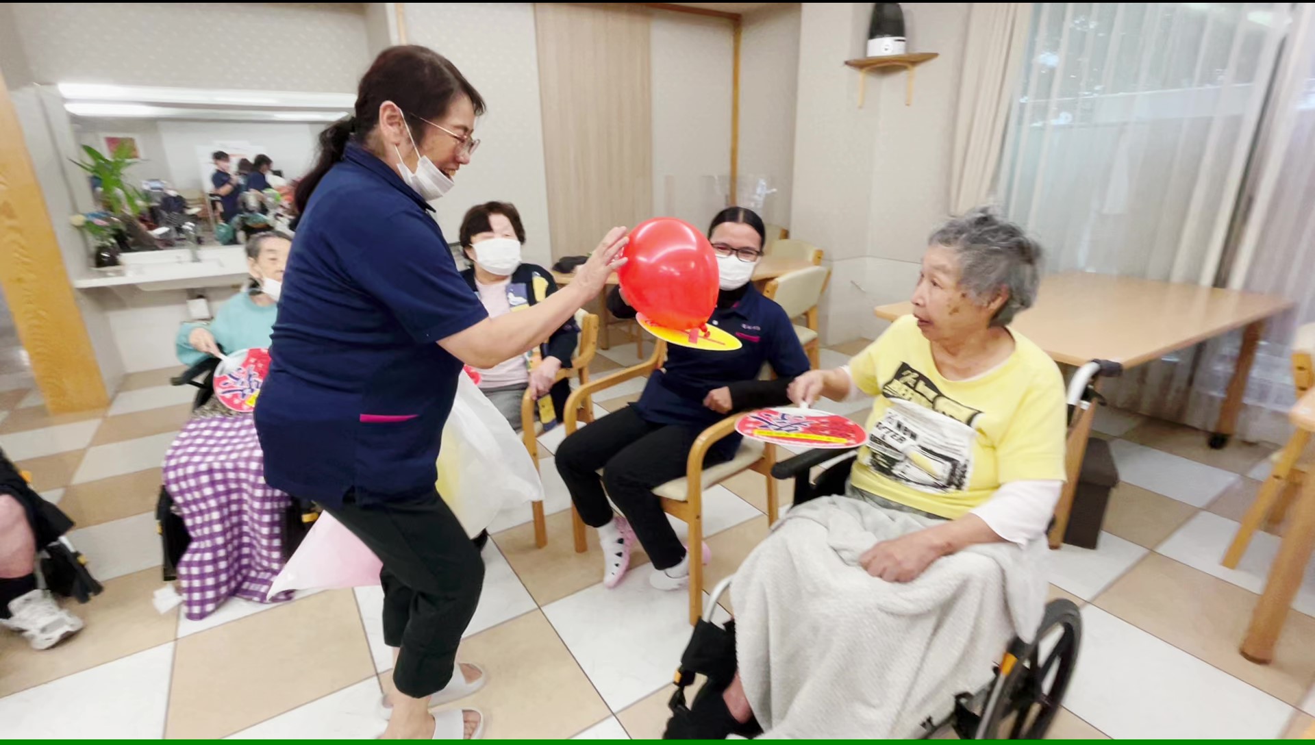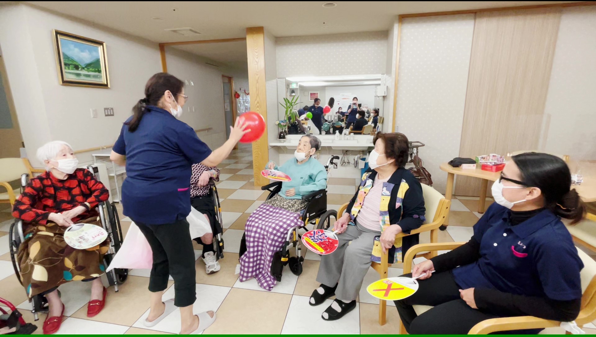 スタッフが「打たないで」とお声掛けすると「難しいですね!」と受け取ったご入居者様もうちわの上に乗せることに一生懸命チャレンジしてくださっています☆