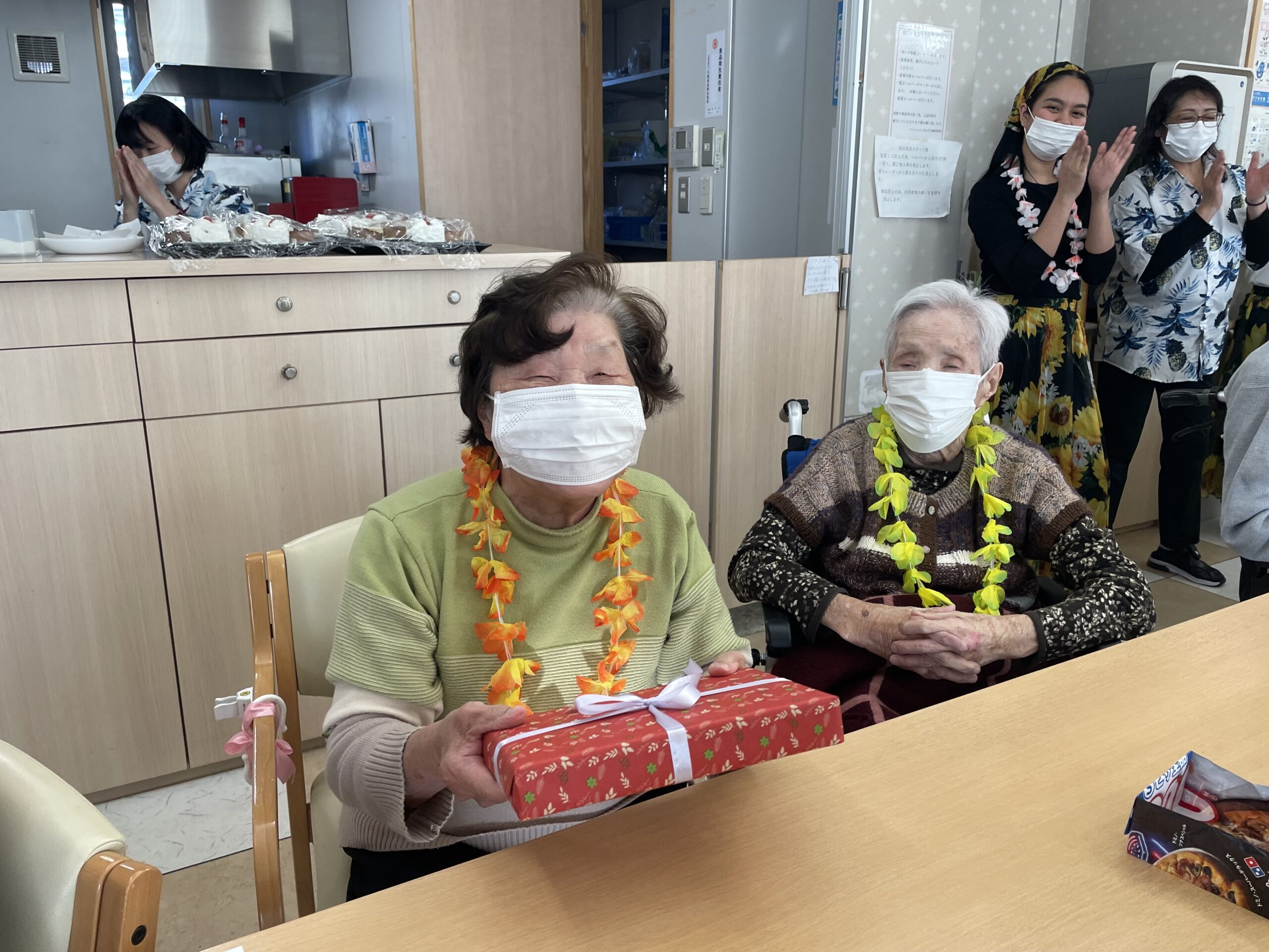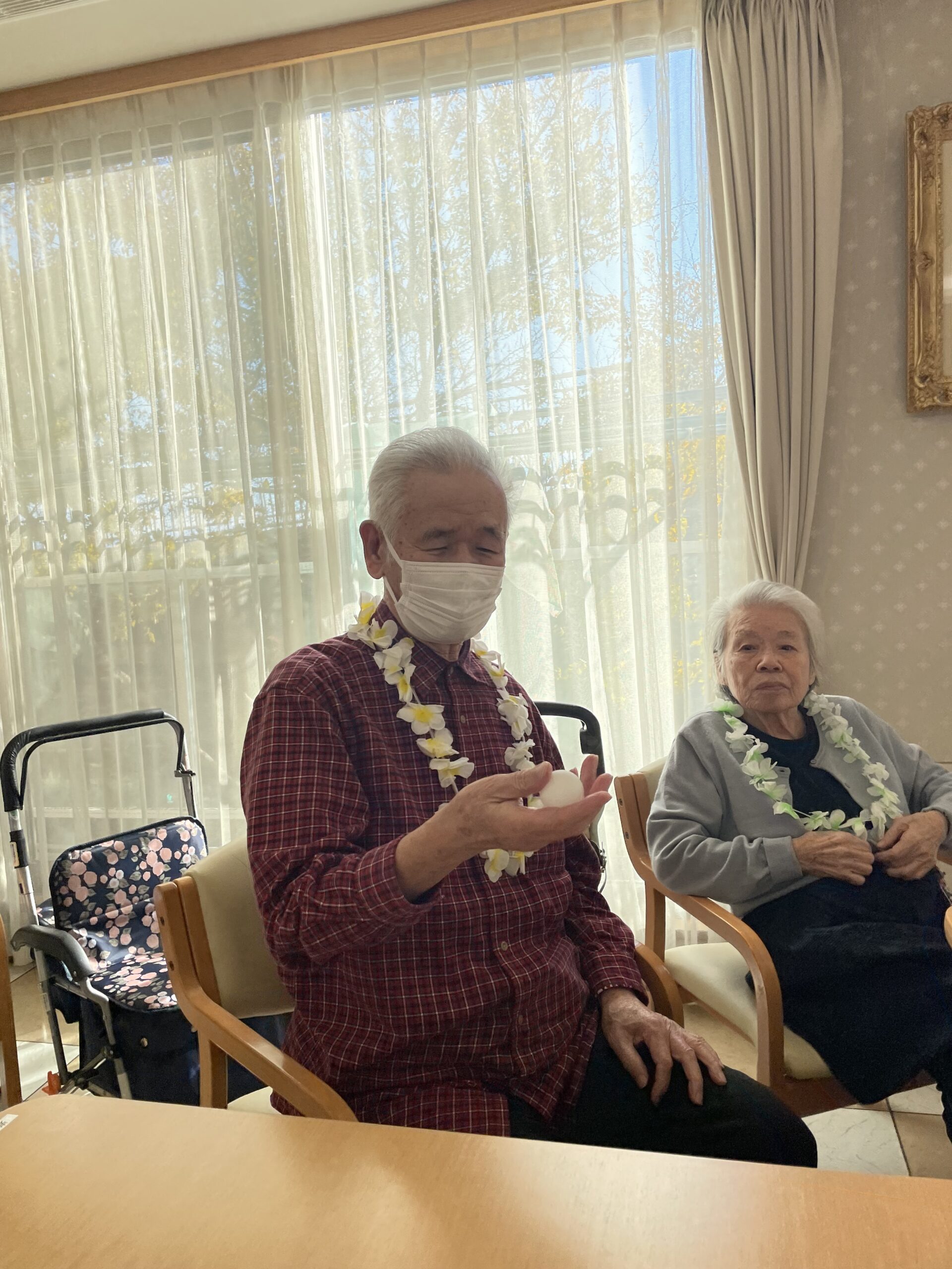 お部屋に飾っていただけるオシャレなランプが当たりましたね ♪ 普段もロビーにて「ここは温かくていいね!」と仲良しのご姉妹でお過ごしです。居室の中でも温かな光に癒されてくださいね☆