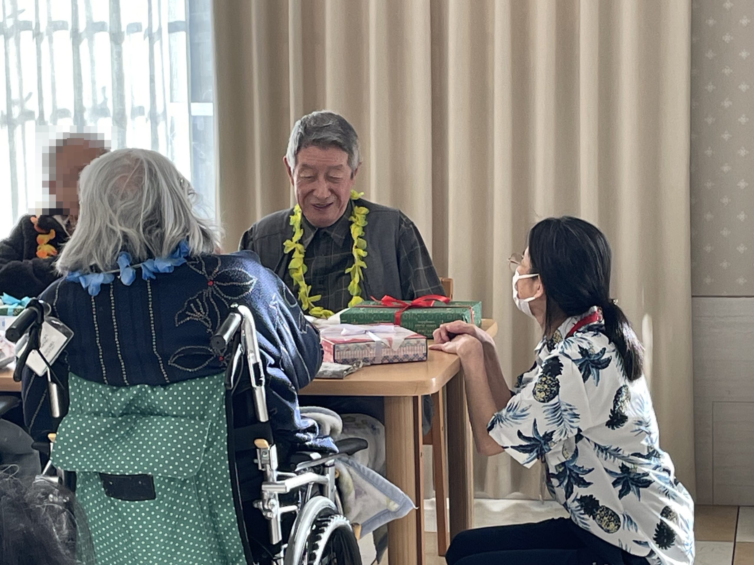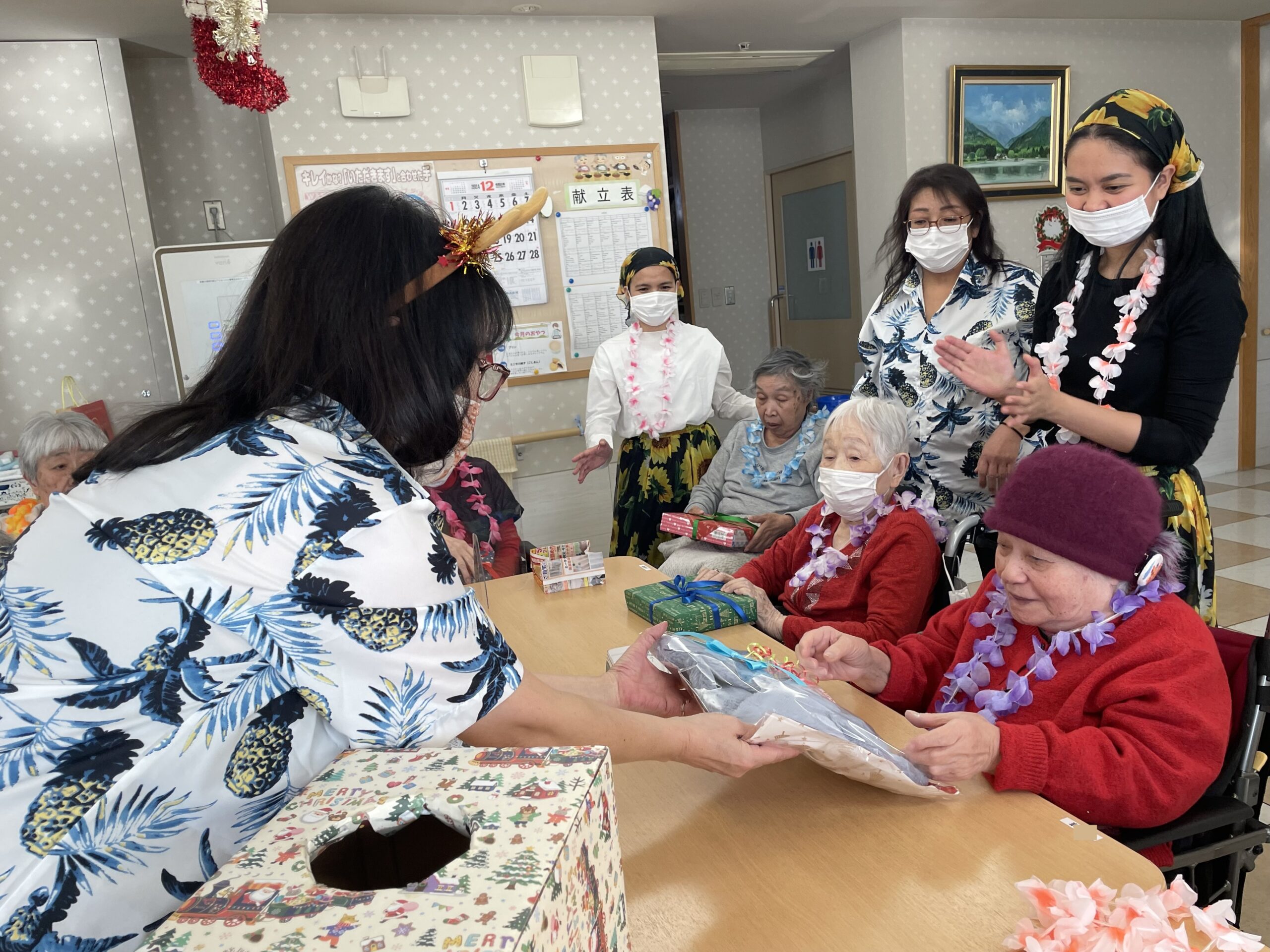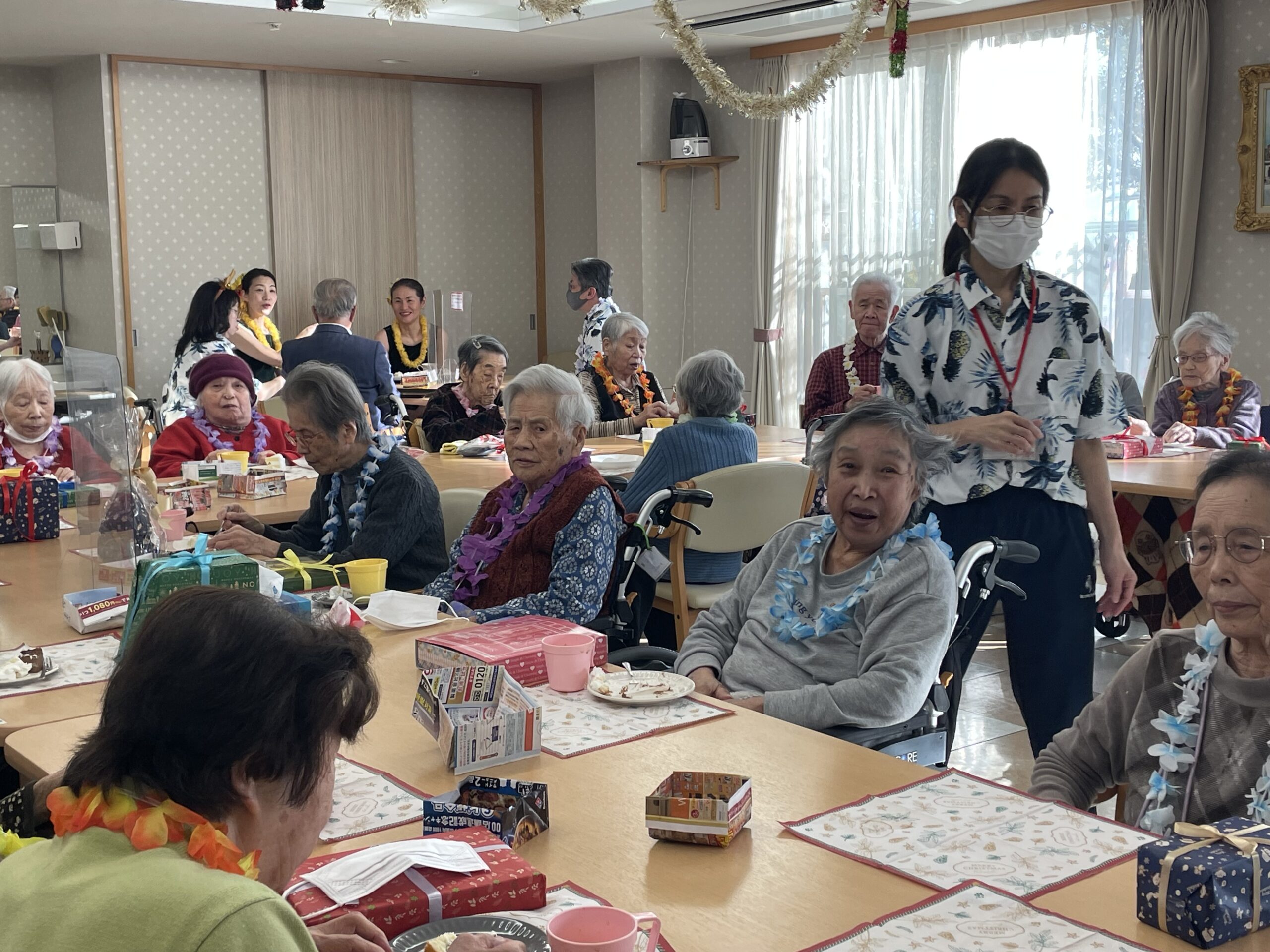 ハワイアンフラを披露してくださったお二人と本社のスタッフと当施設管理者たちもケーキをいただきました。沢山の人にご協力いただき、2024年コンシェルジュ花みずきクリスマス会も皆様の笑顔溢れる☆楽しい時間を過ごすことが出来ました。