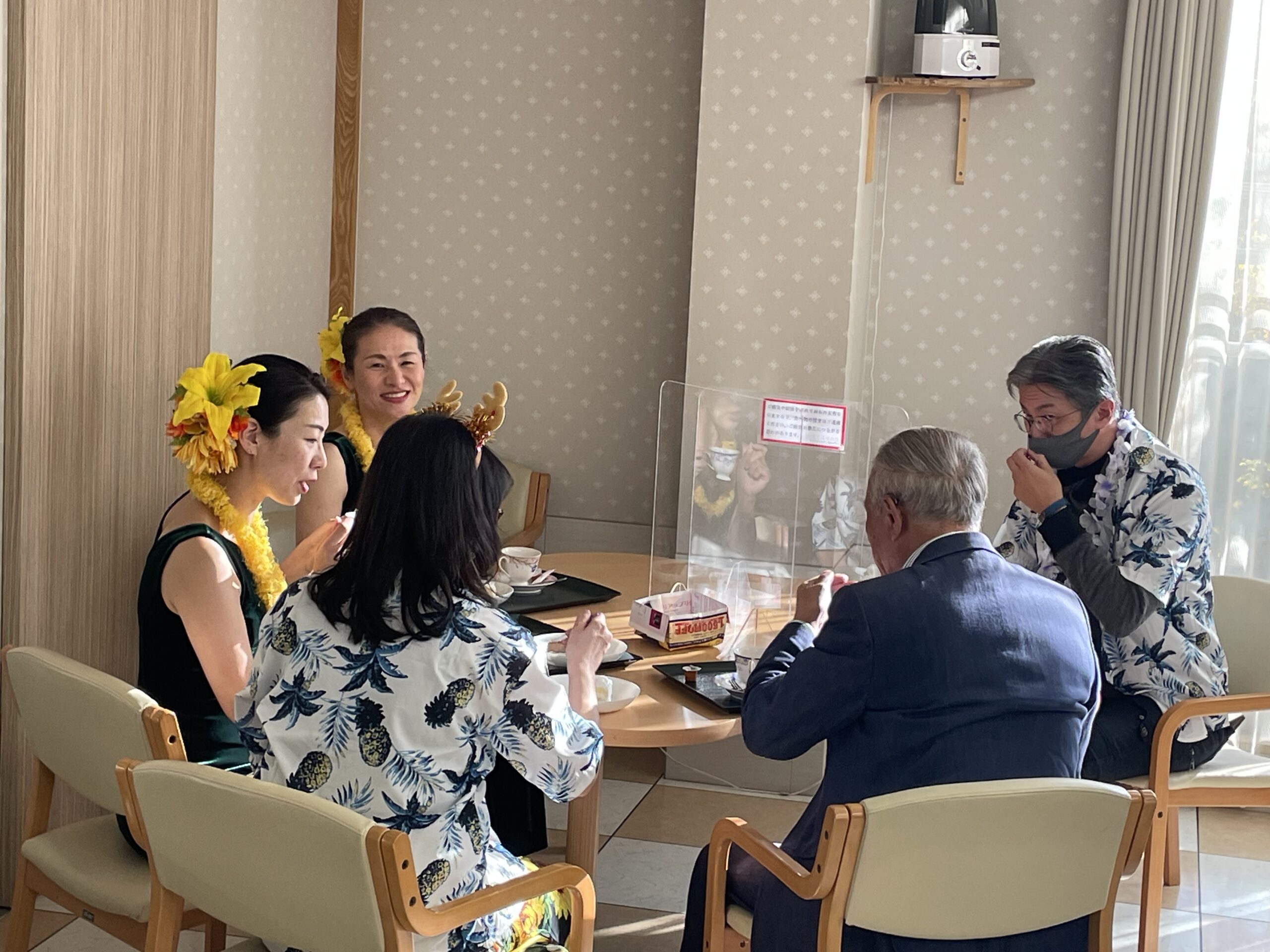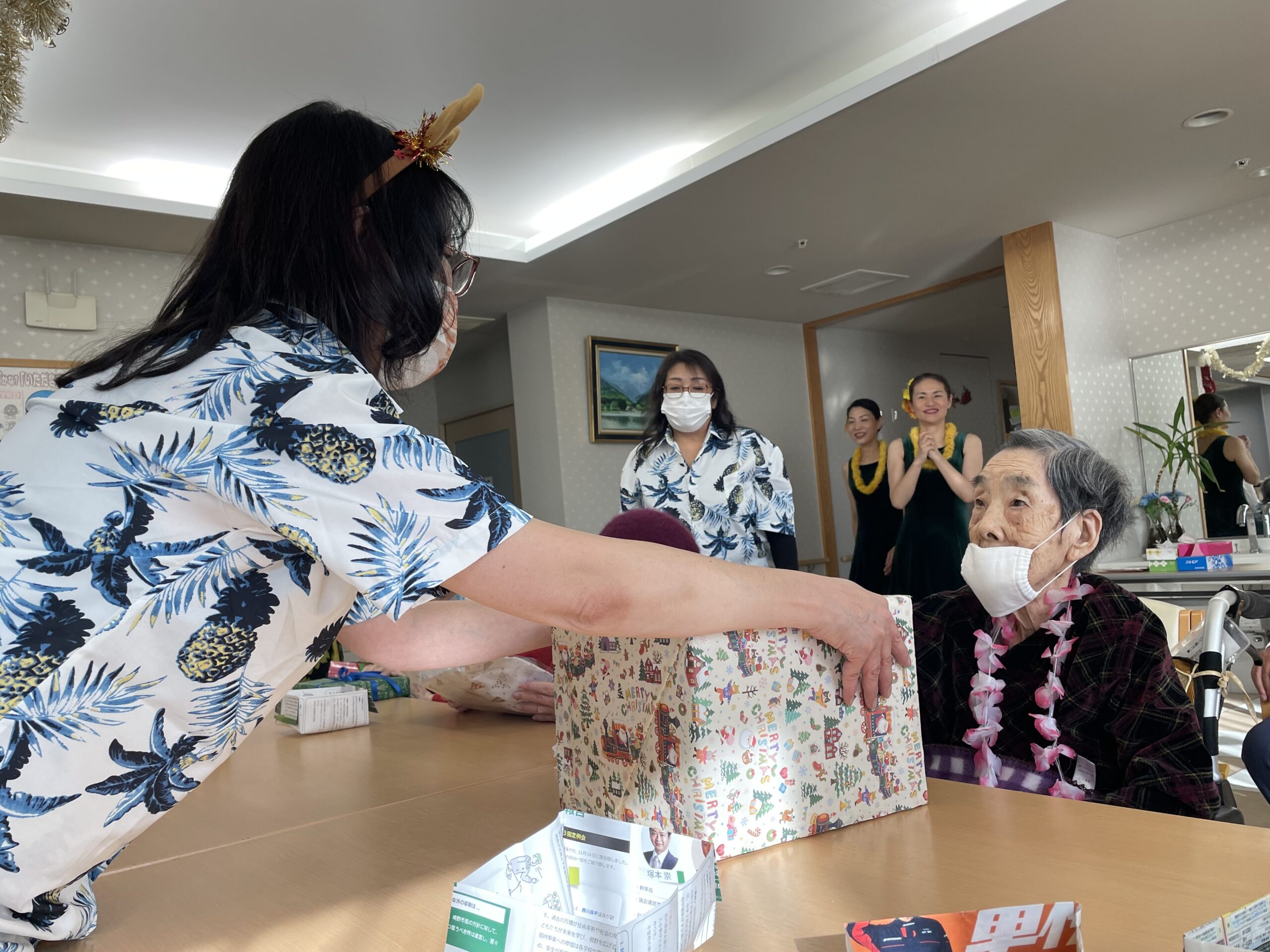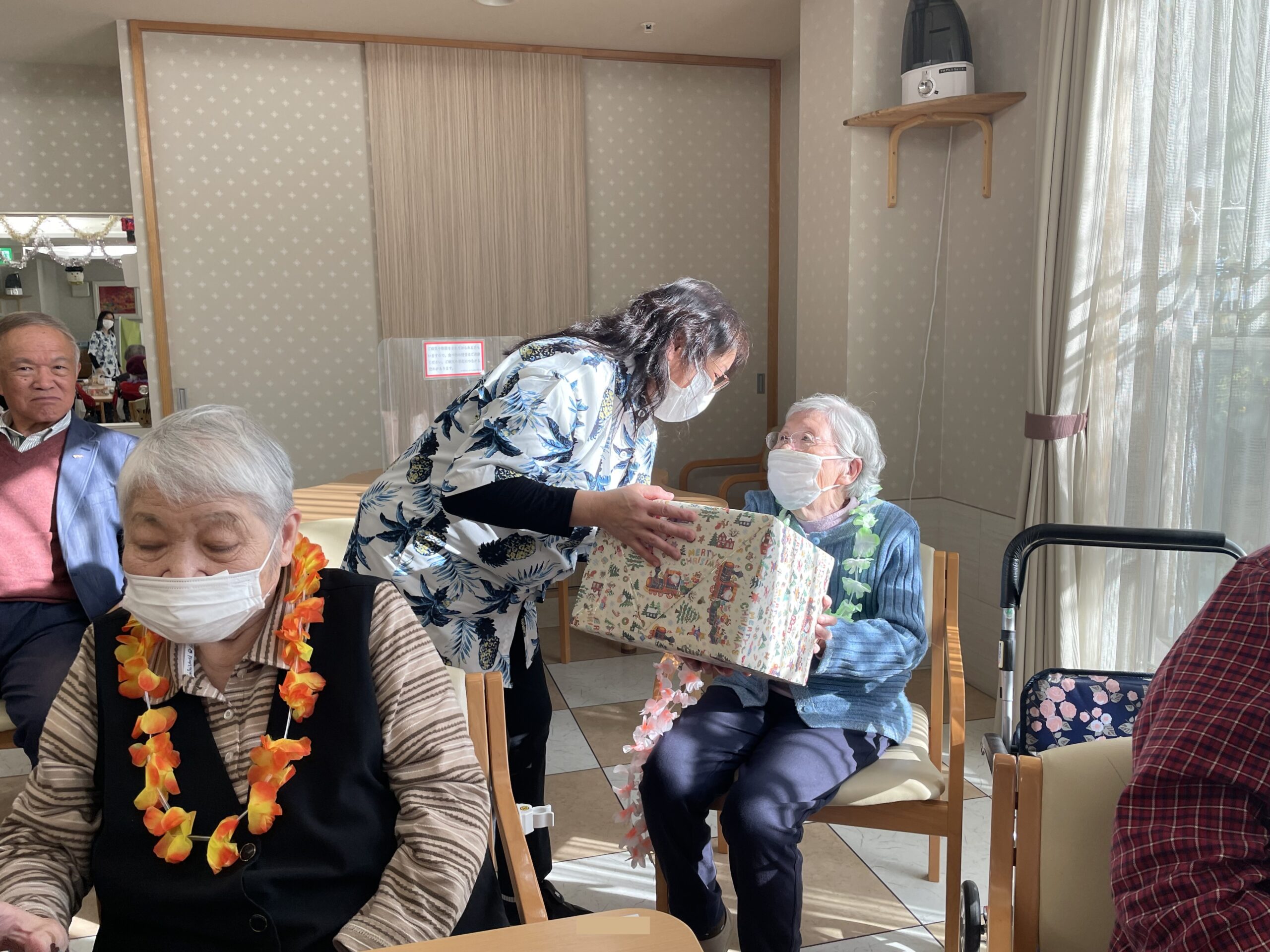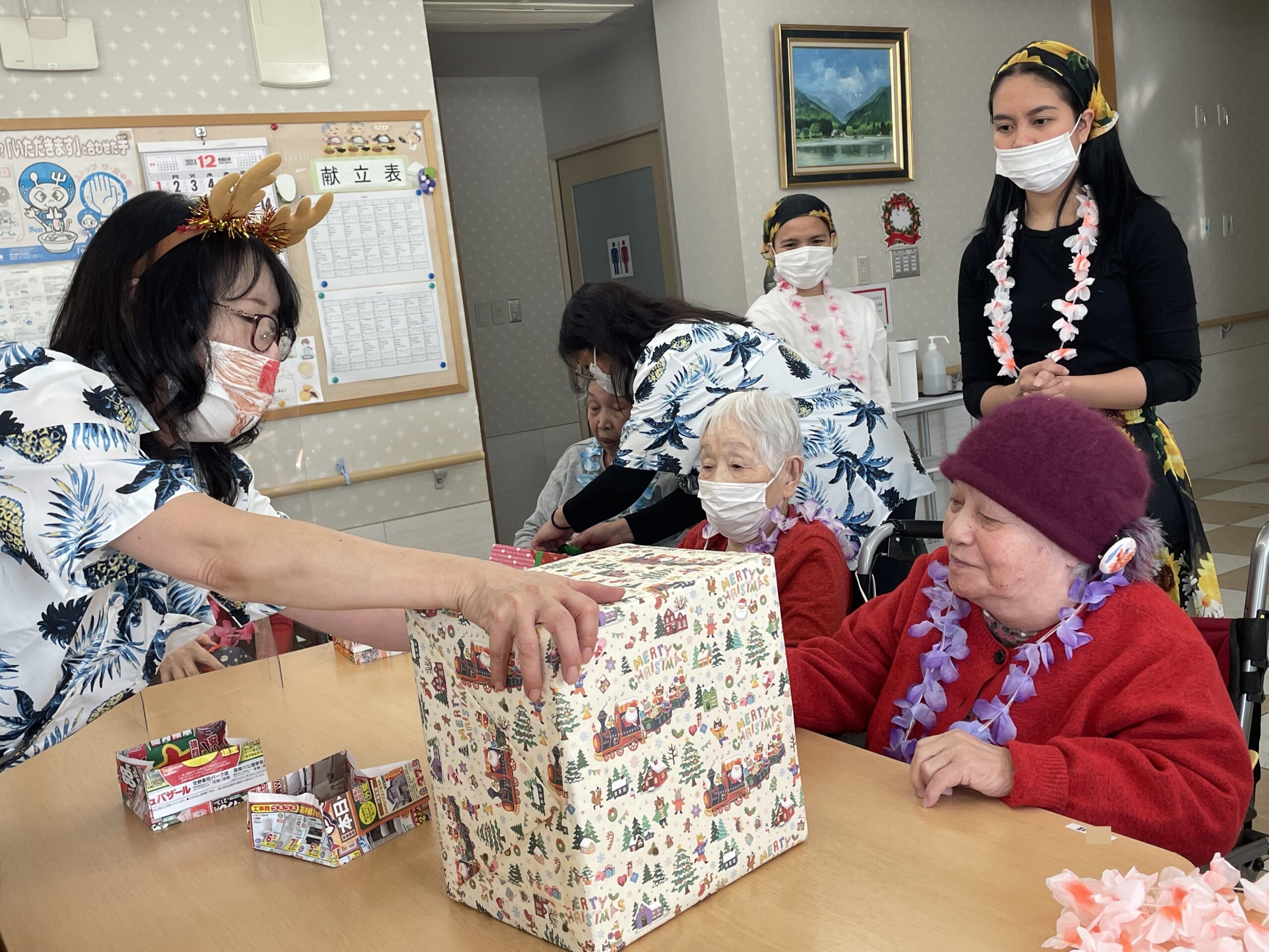 ハワイアンフラを披露してくださったお二人と本社のスタッフと当施設管理者たちもケーキをいただきました。沢山の人にご協力いただき、2024年コンシェルジュ花みずきクリスマス会も皆様の笑顔溢れる☆楽しい時間を過ごすことが出来ました。