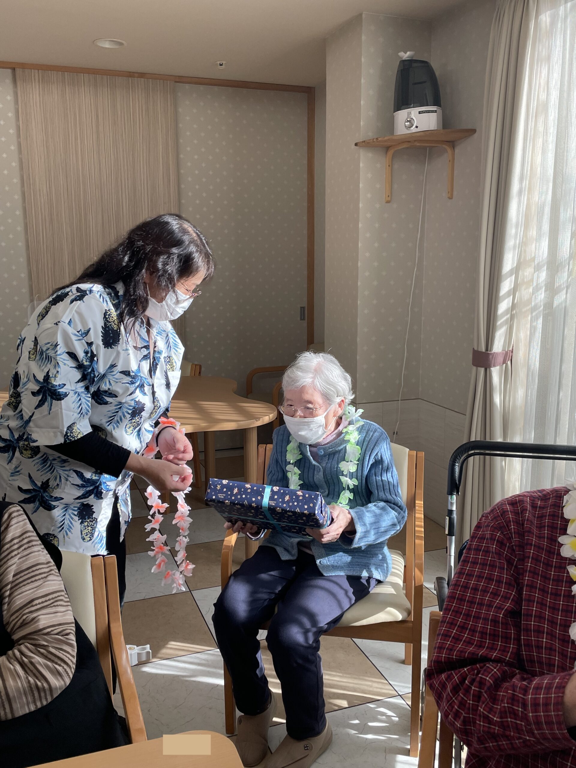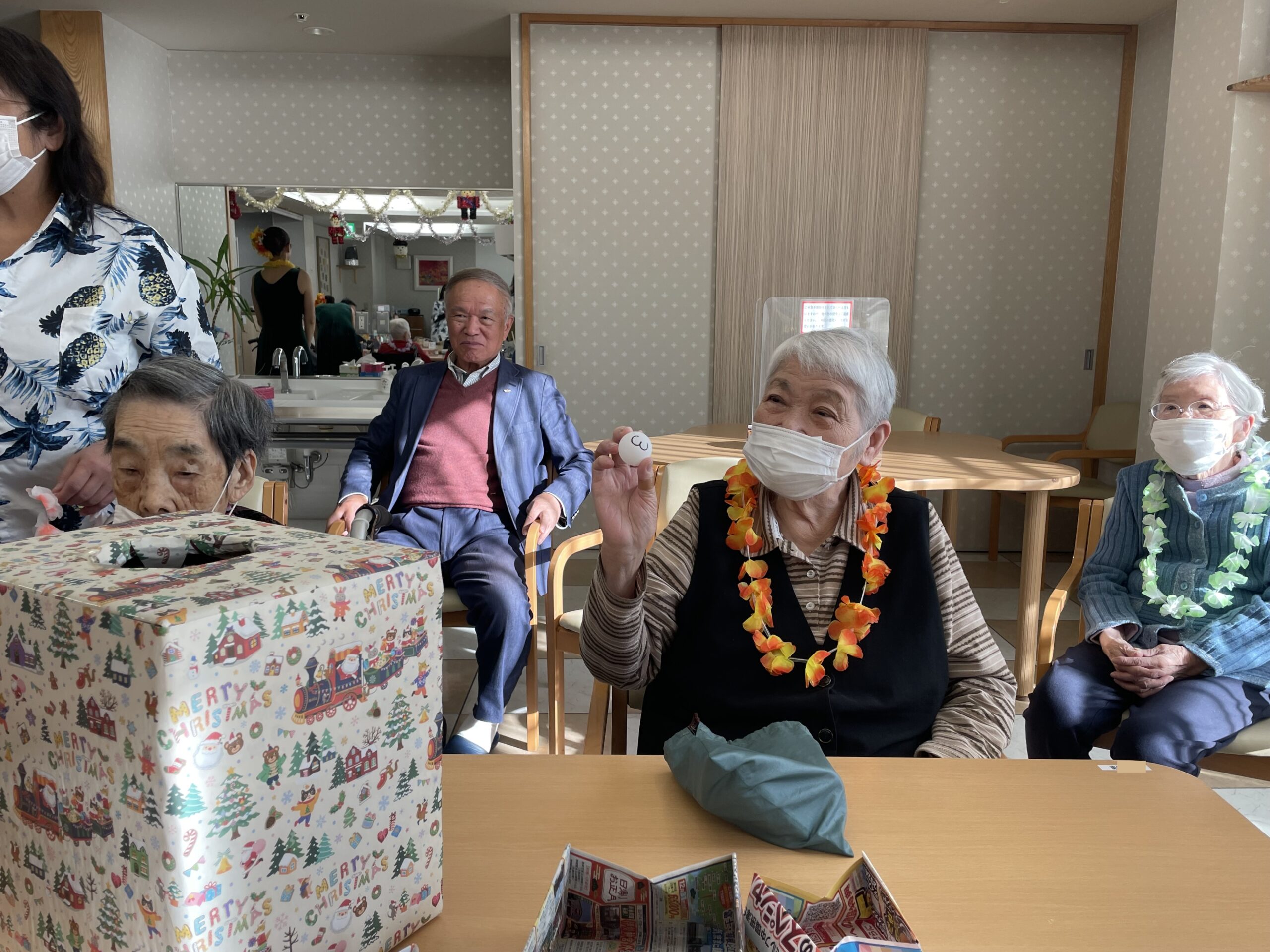 この日も赤色とピンク系のお洋服がとってもお似合いなこちらのご入居者様☆ どんなプレゼントが当たるのでしょうか…!?