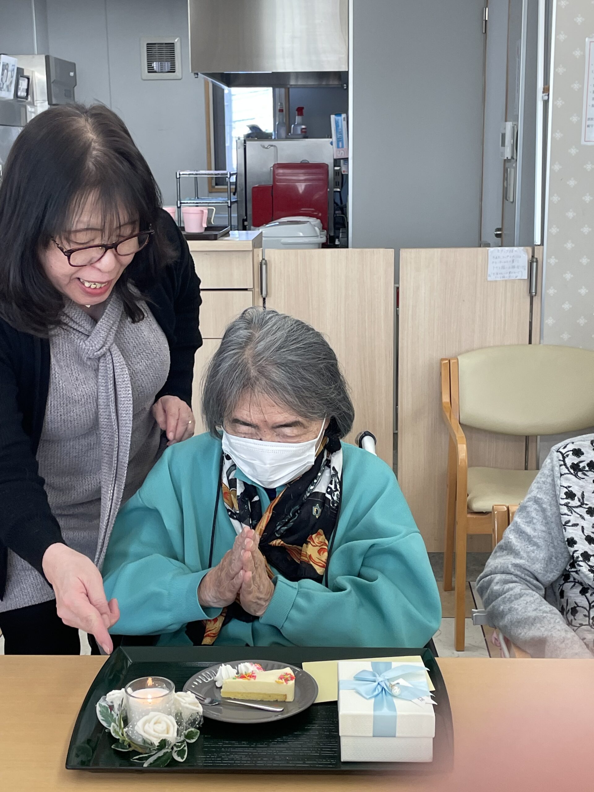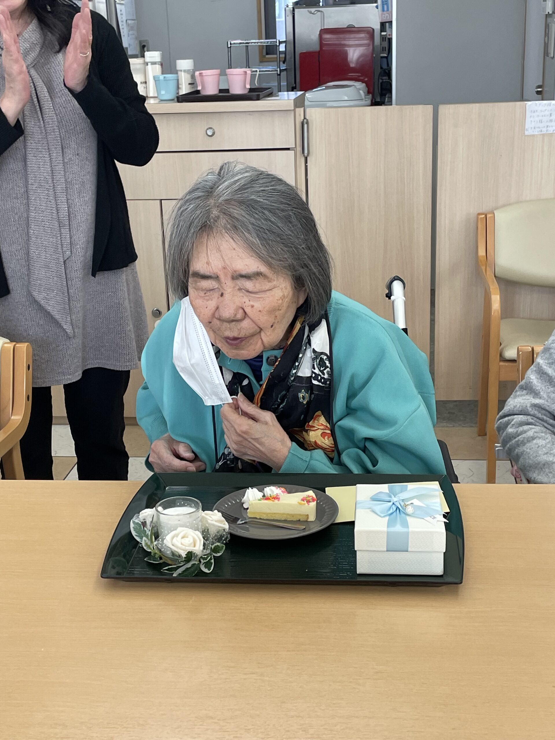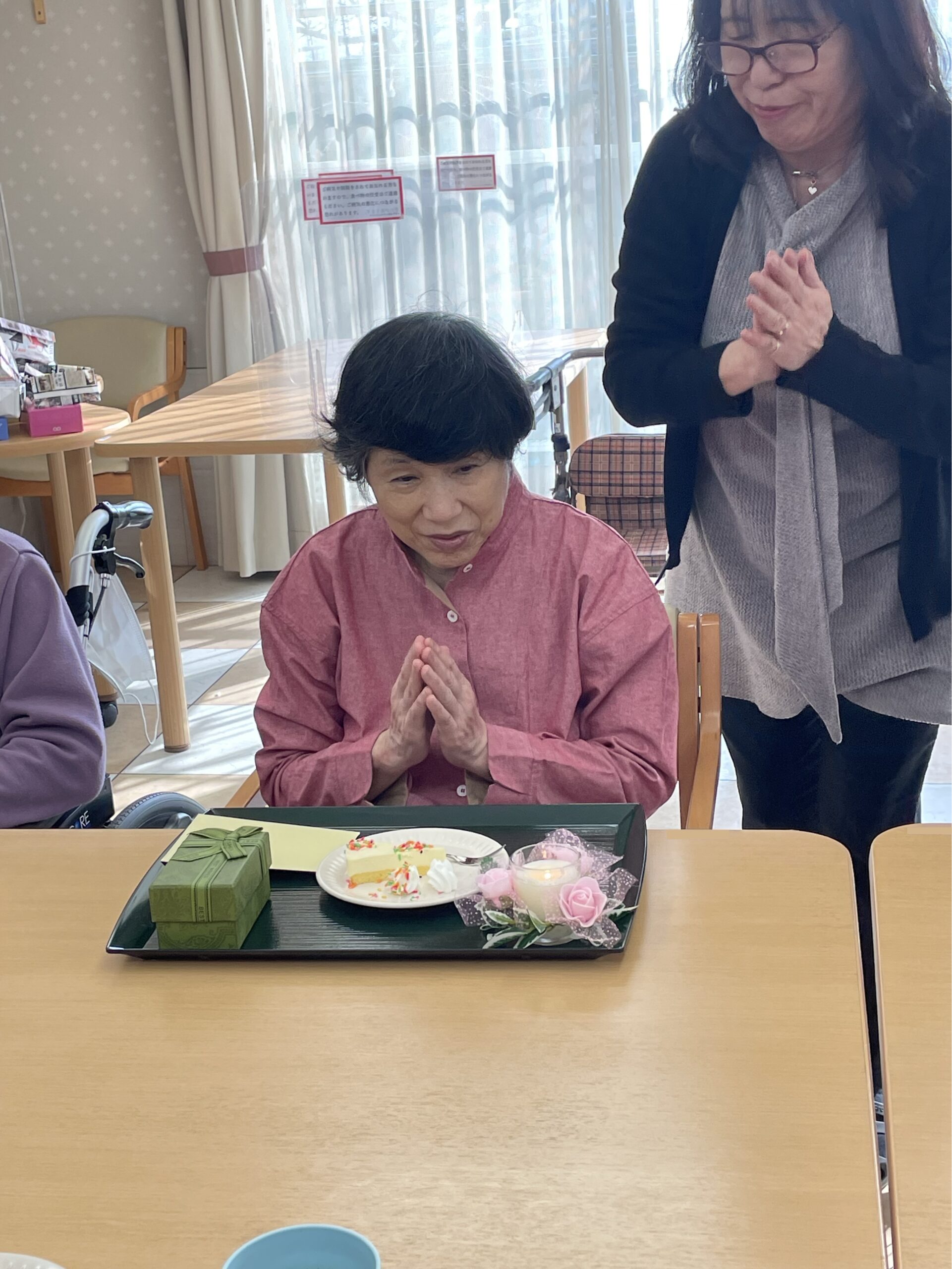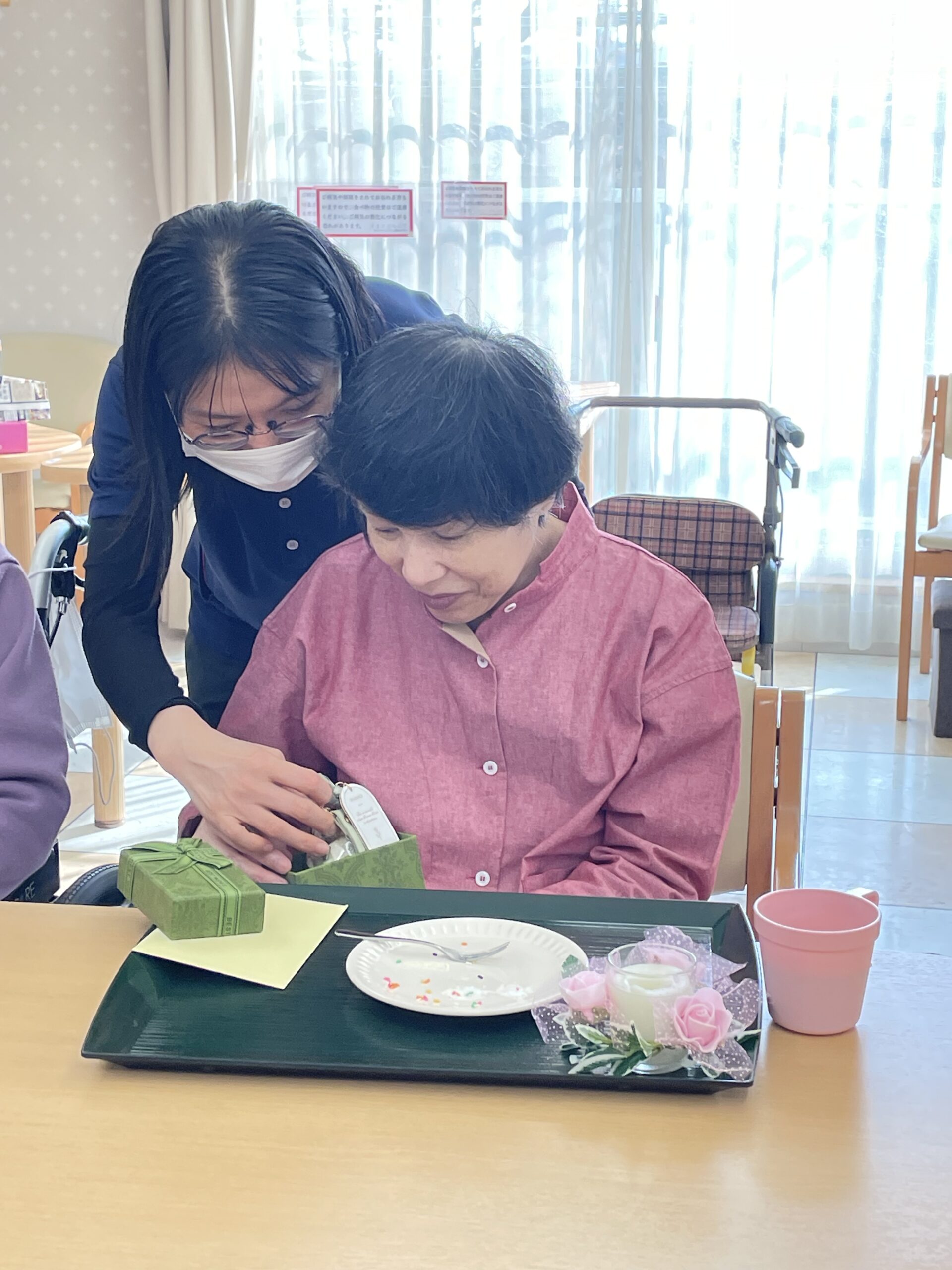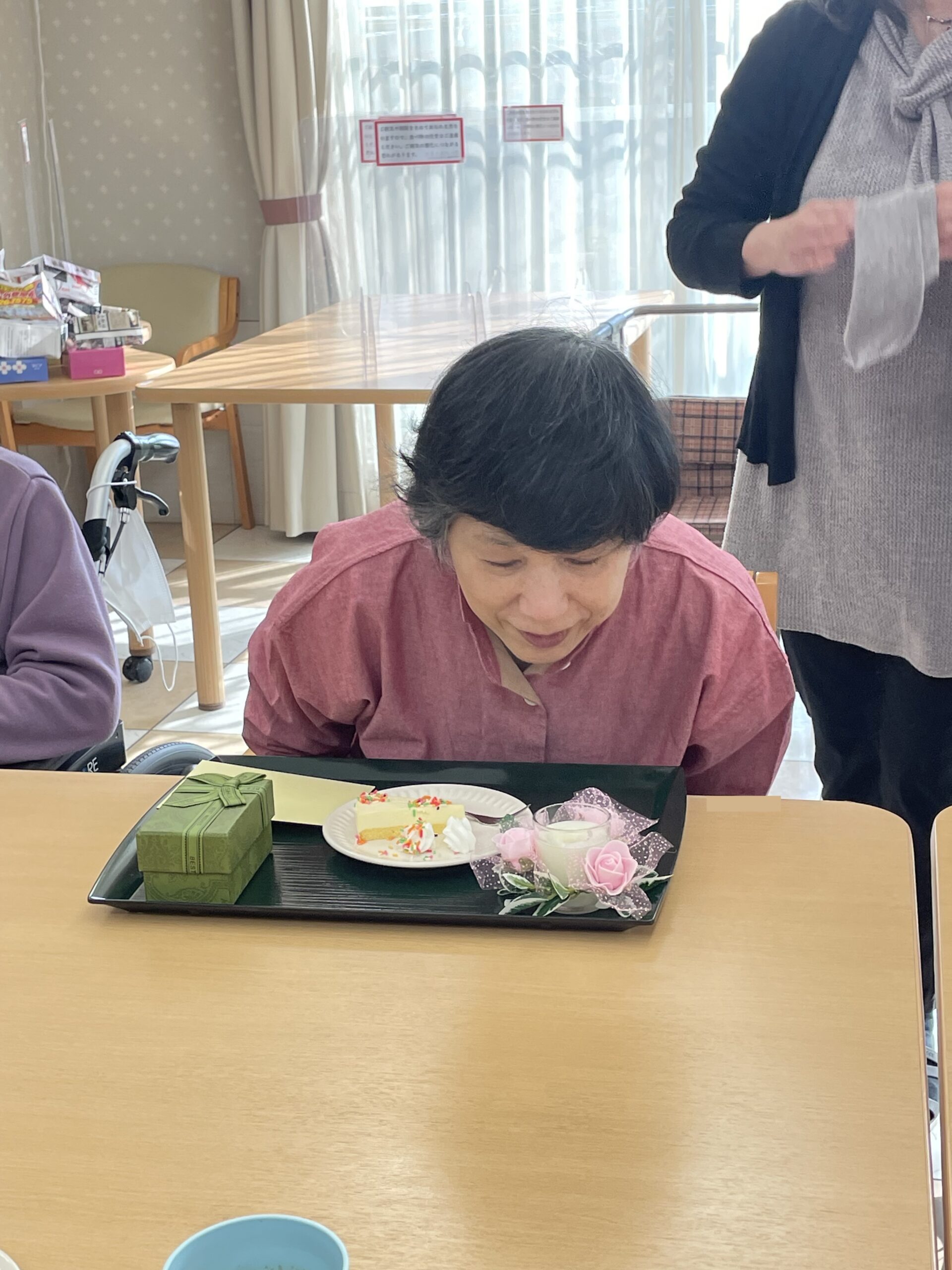 ハッピーバースデイの曲が流れる中、恥ずかしそうに「有難うございます」とおっしゃってくださいました☆ いつも物静かでお上品なお優しいご入居者様です。