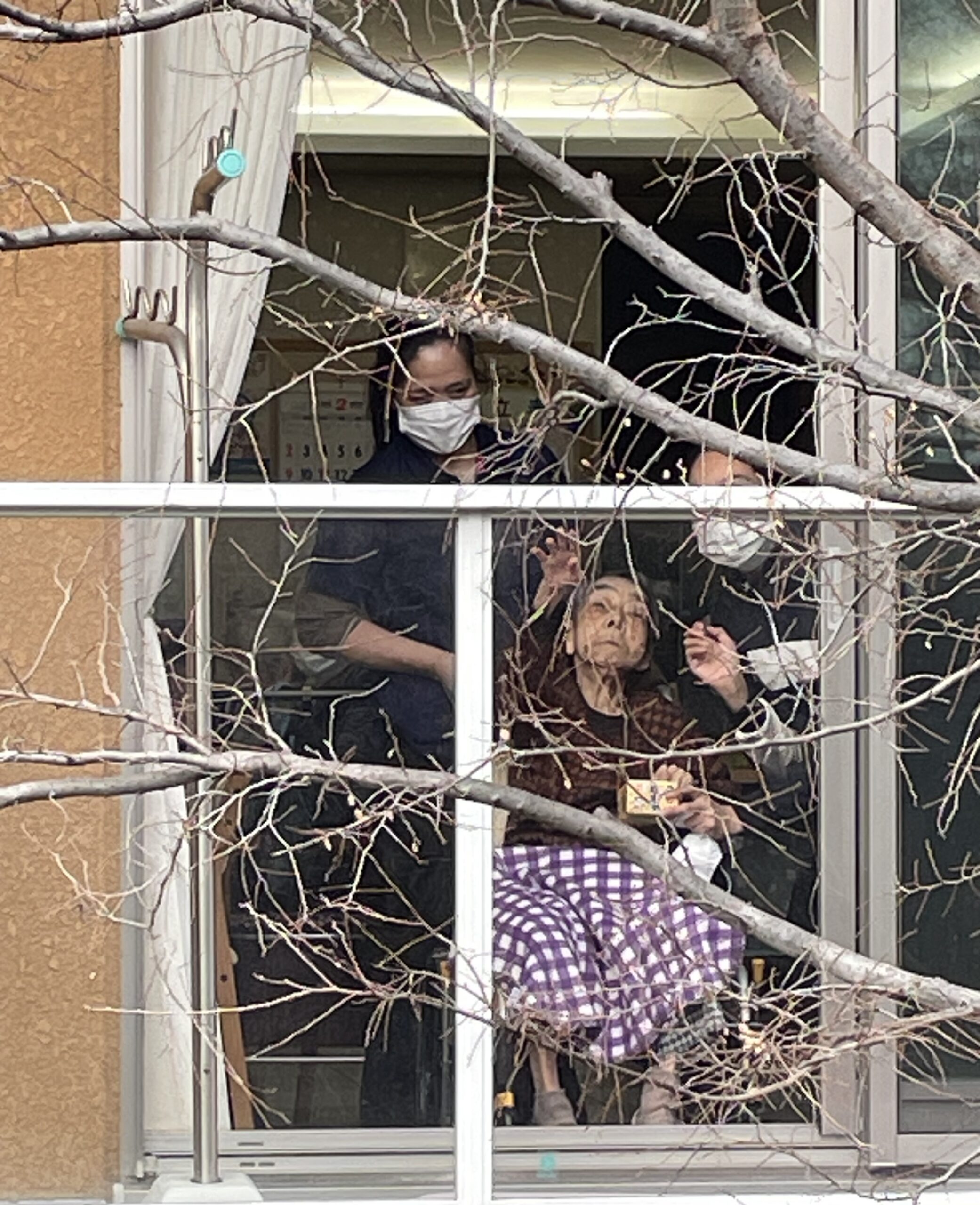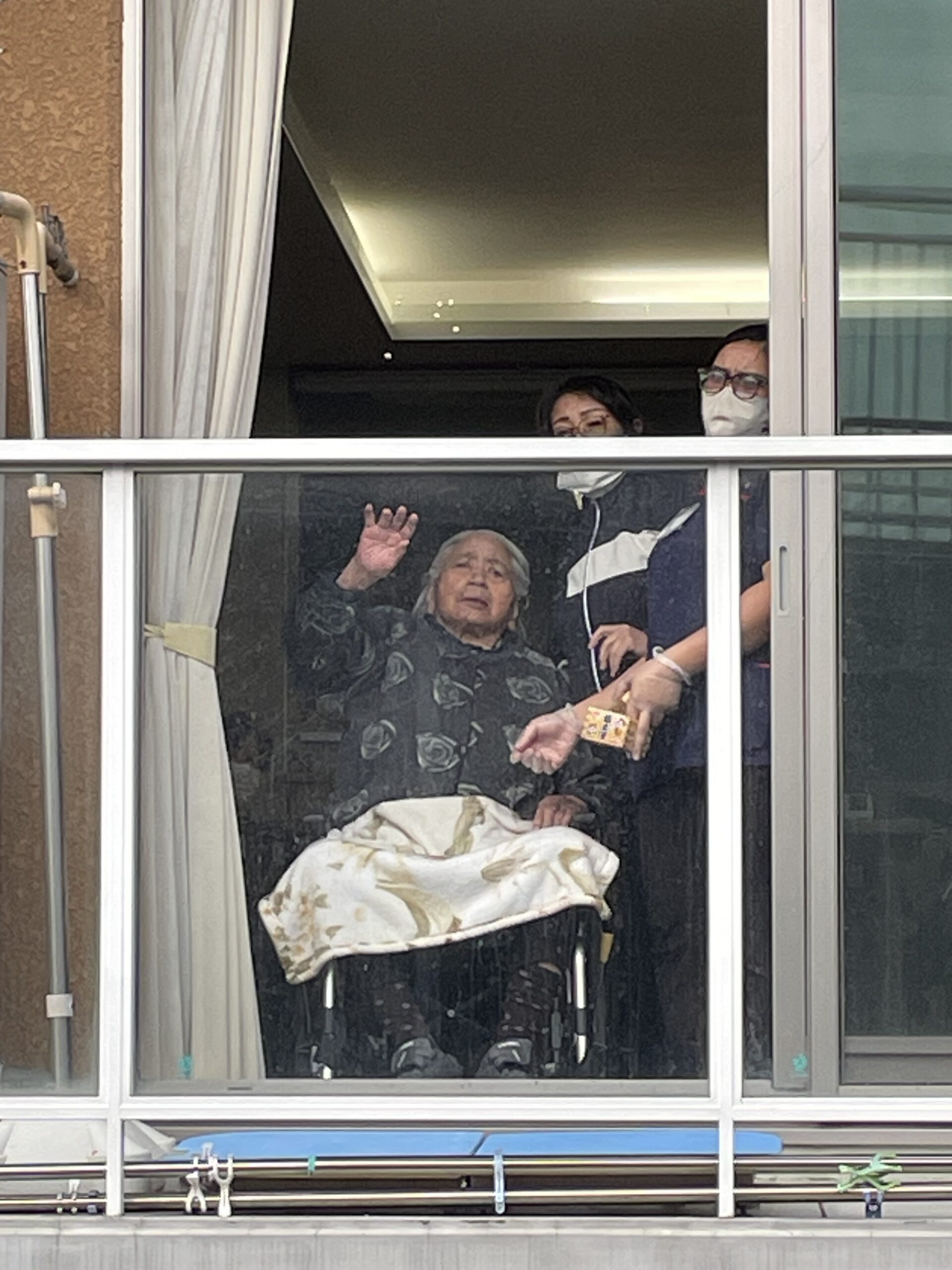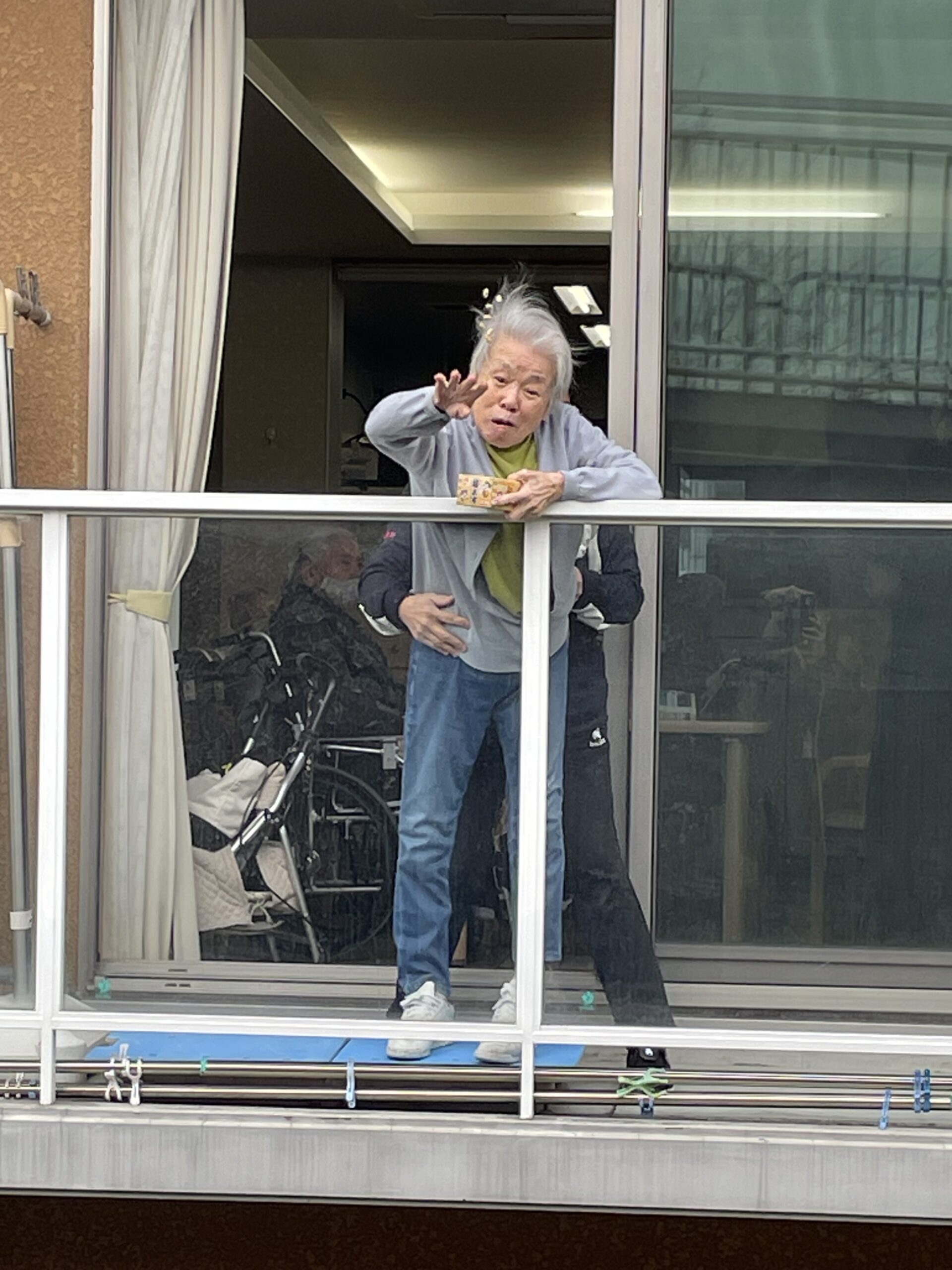先ほどのご入居者様の仲良しのお姉様です。「中からでいいわ!」と「届くやろか…?!」と頑張って手すりの外側に高~く!豆を投げてくださっていました ♪