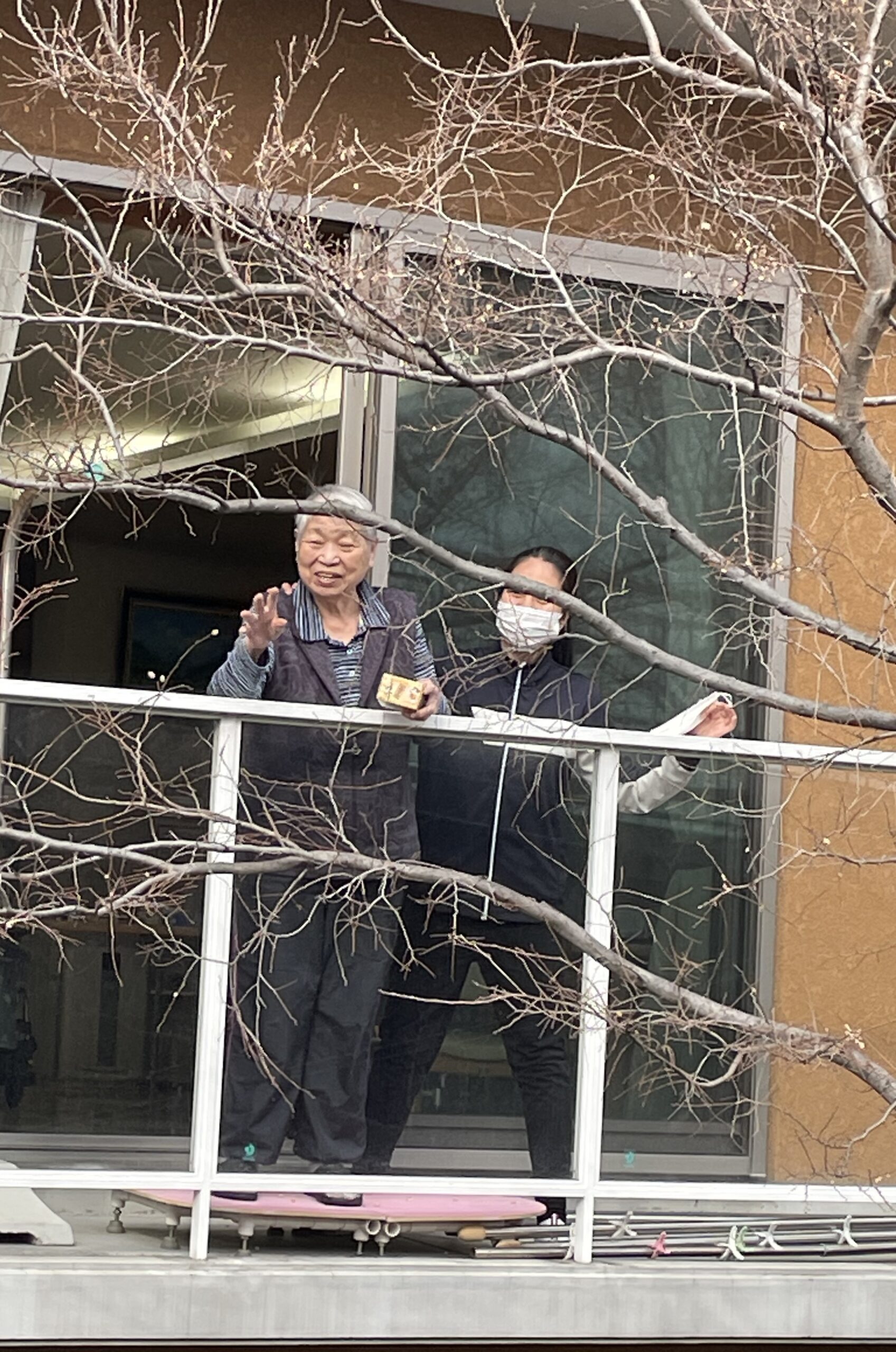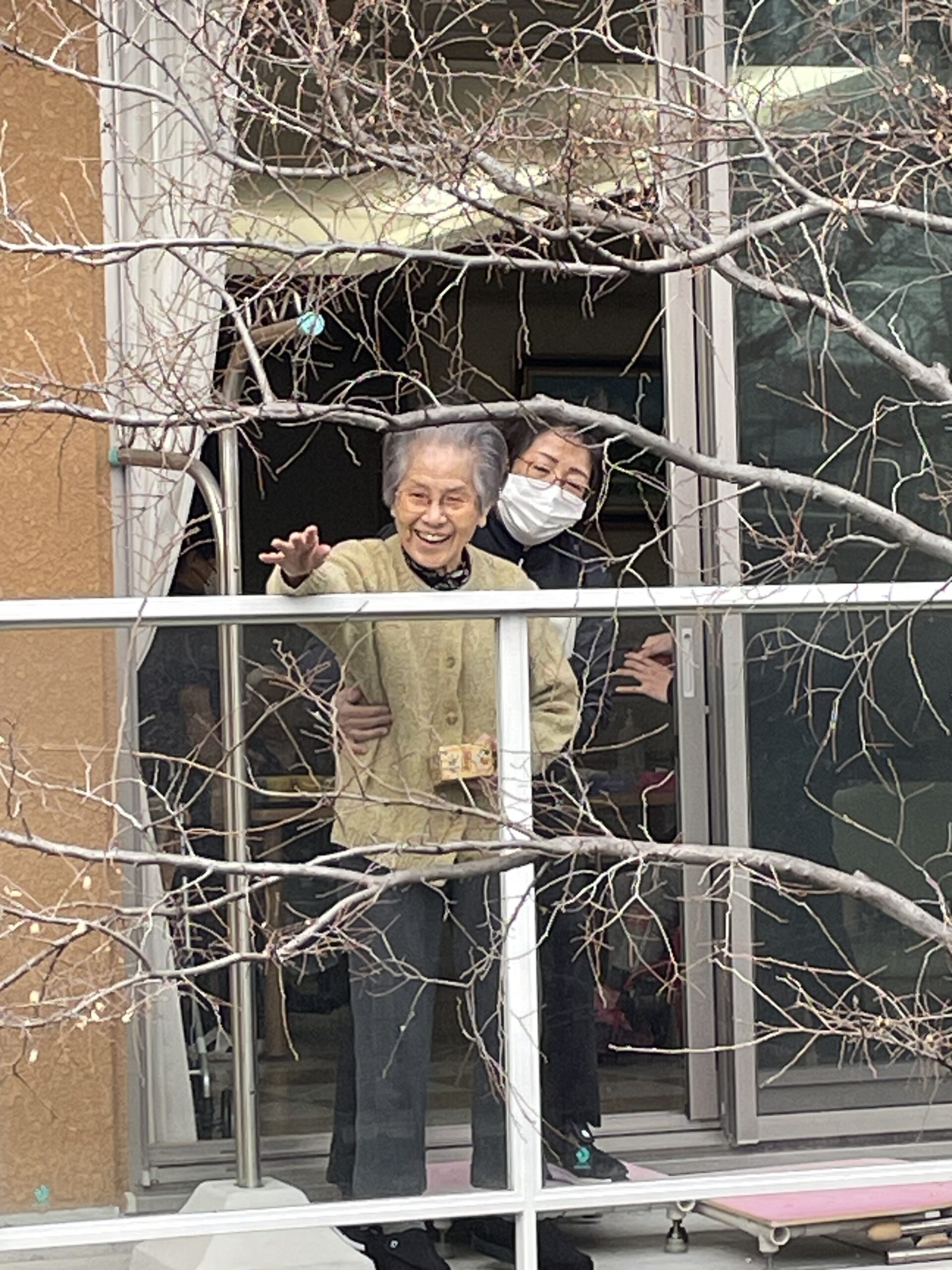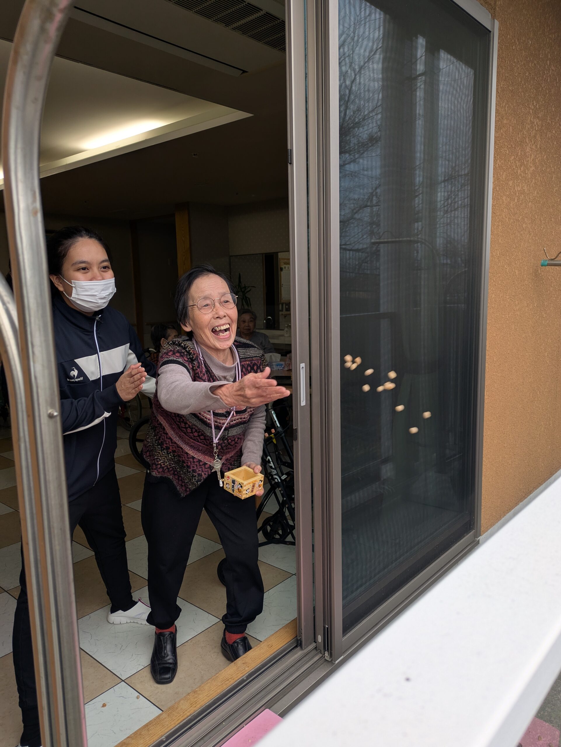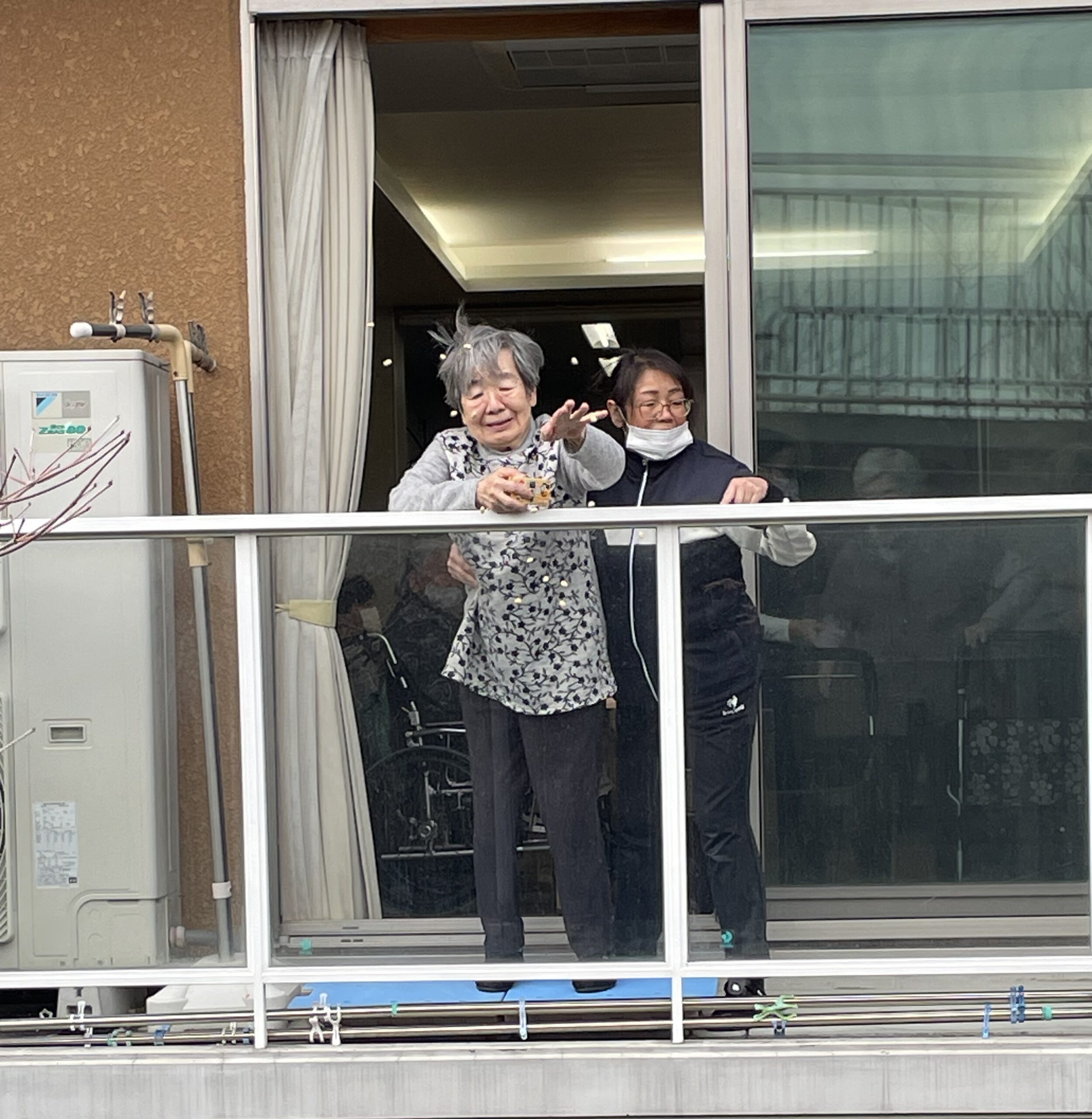 恐々ベランダに出られたご入居者様。「大丈夫ですよ!しっかりスタッフがサポート致します☆ 」とお伝えすると「じゃあ安心やね」と初めての豆まきを楽しんでくださっていました ♪