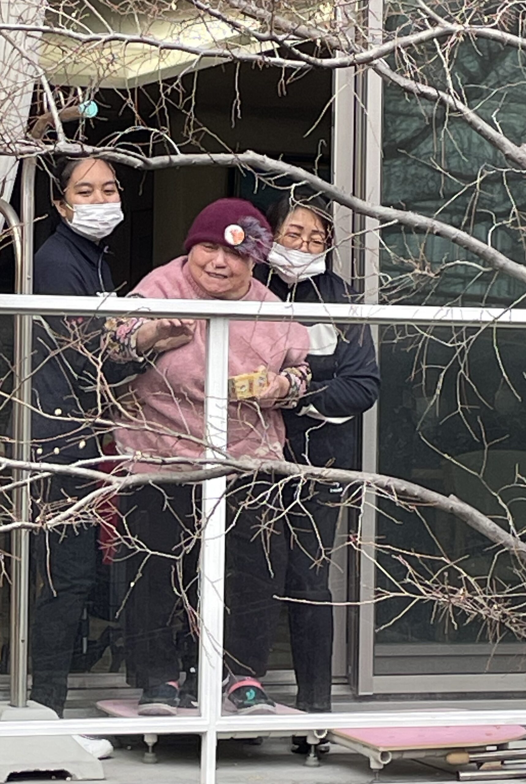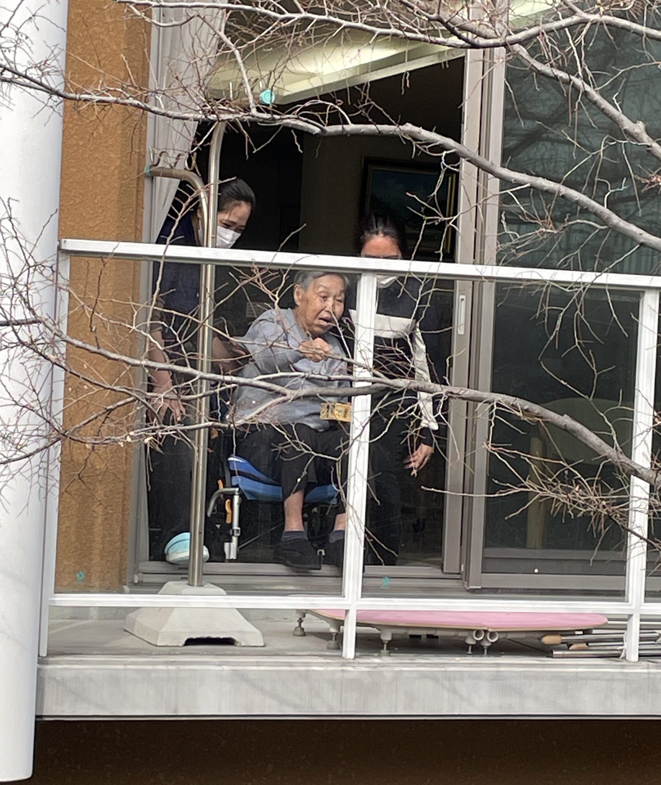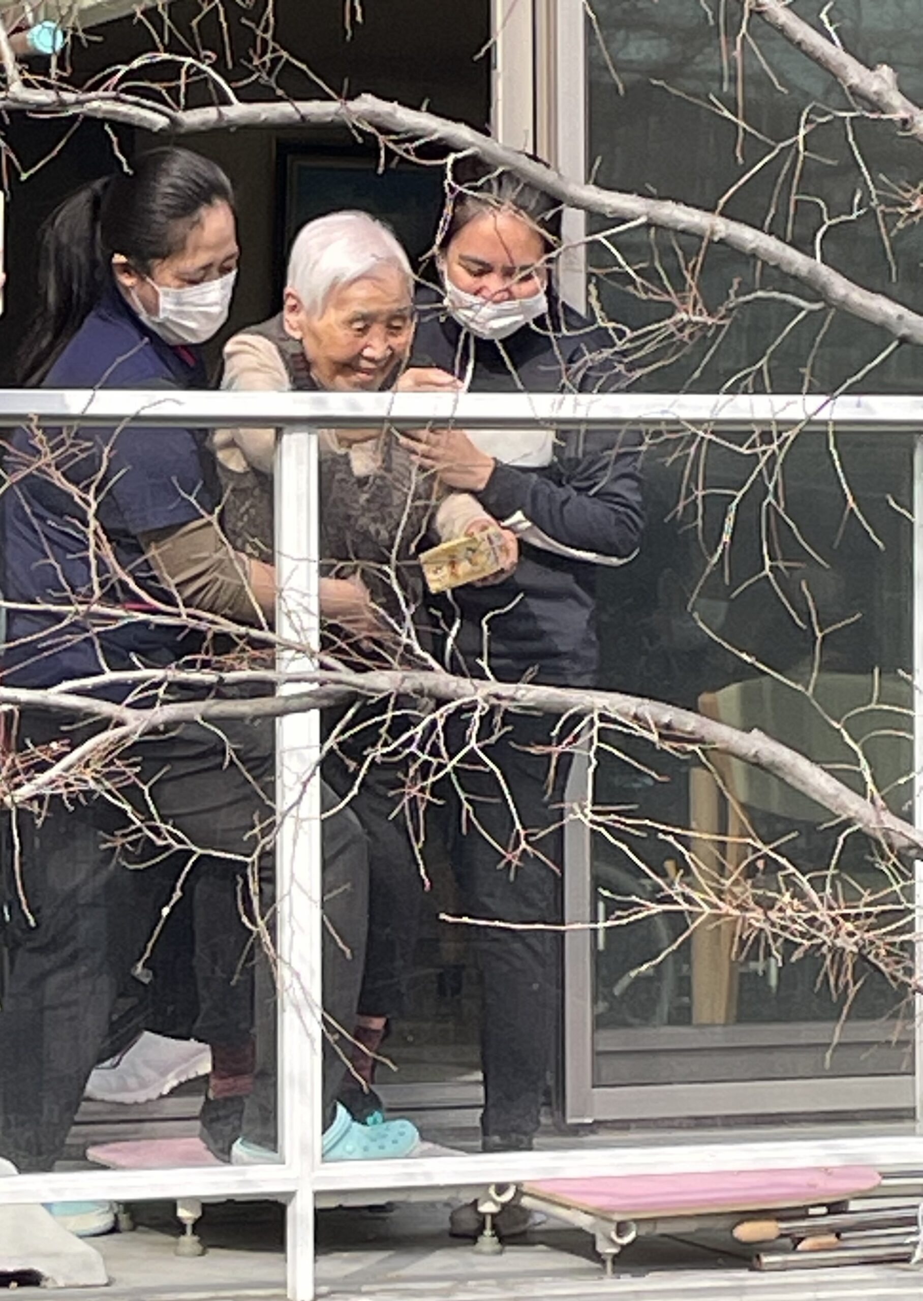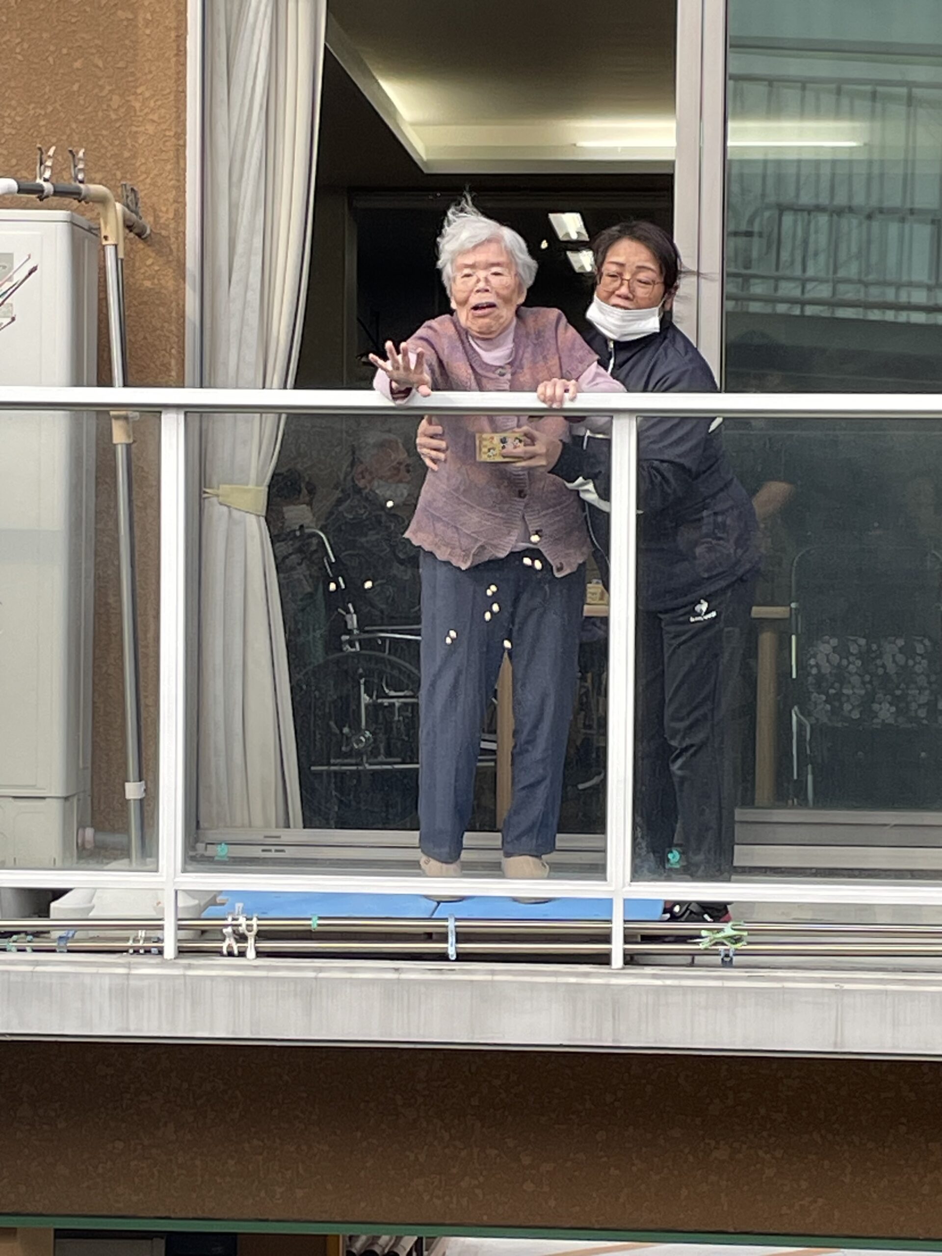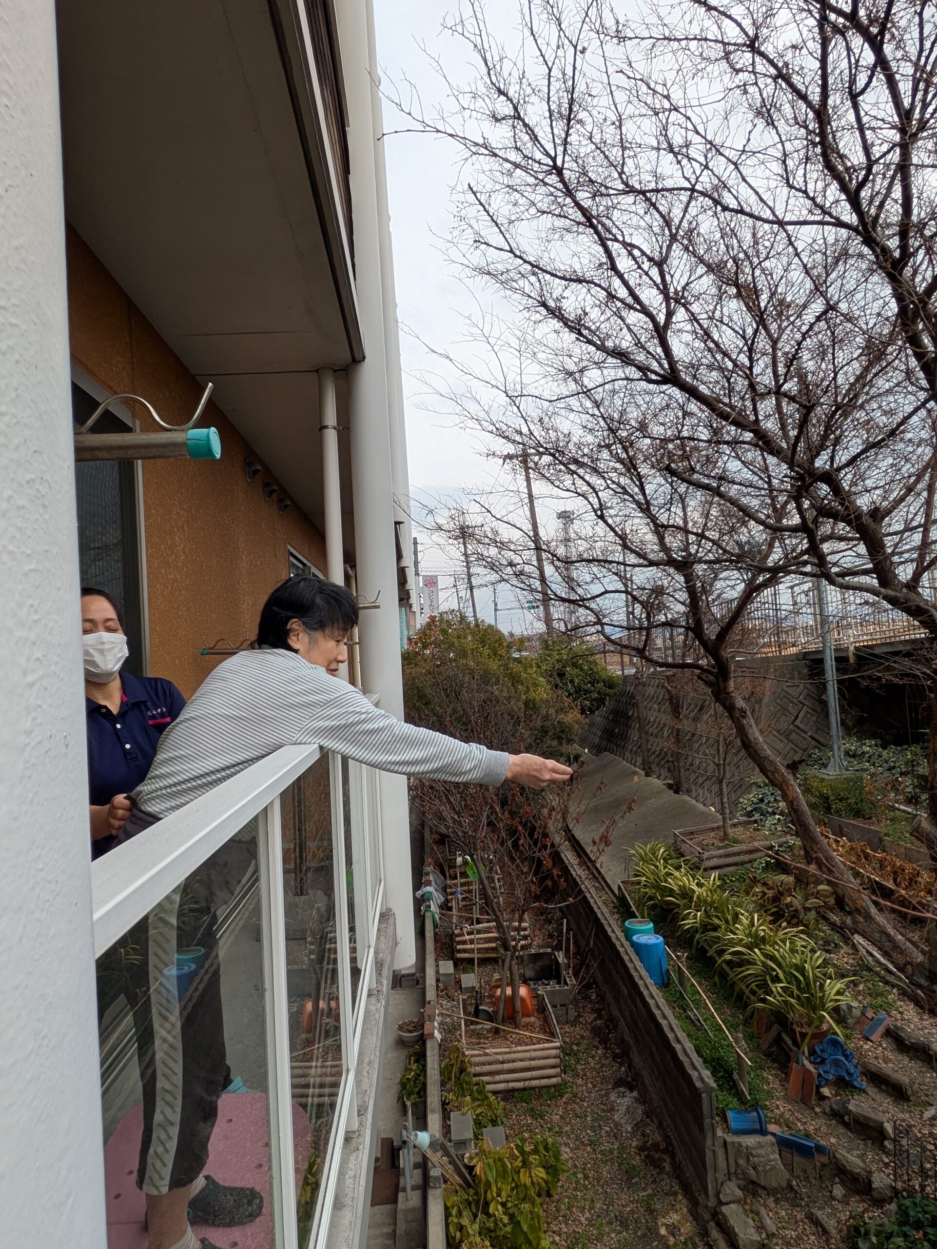 恐々ベランダに出られたご入居者様。「大丈夫ですよ!しっかりスタッフがサポート致します☆ 」とお伝えすると「じゃあ安心やね」と初めての豆まきを楽しんでくださっていました ♪