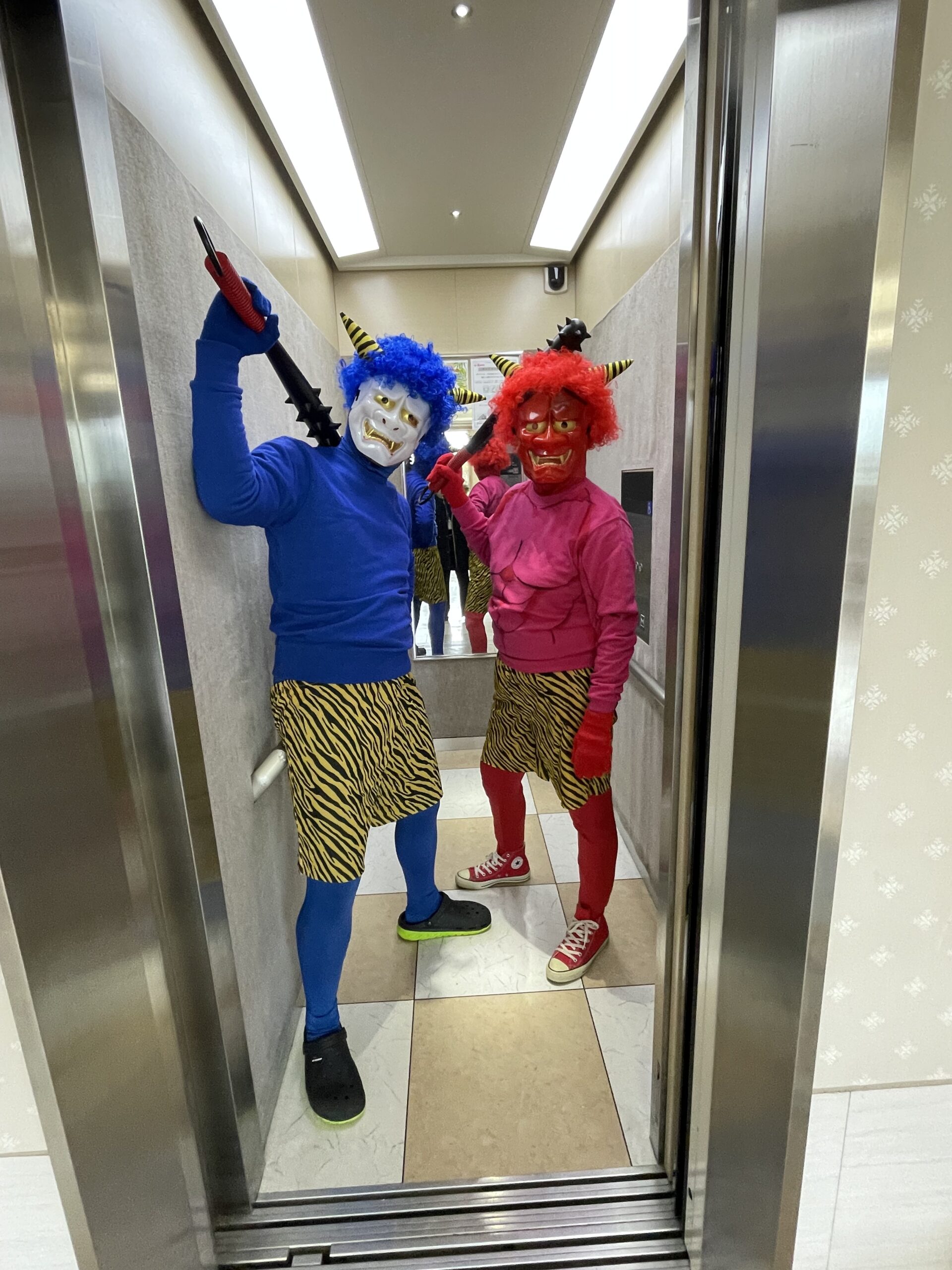 「赤鬼と青鬼が襲来です!!皆様逃げてください!」