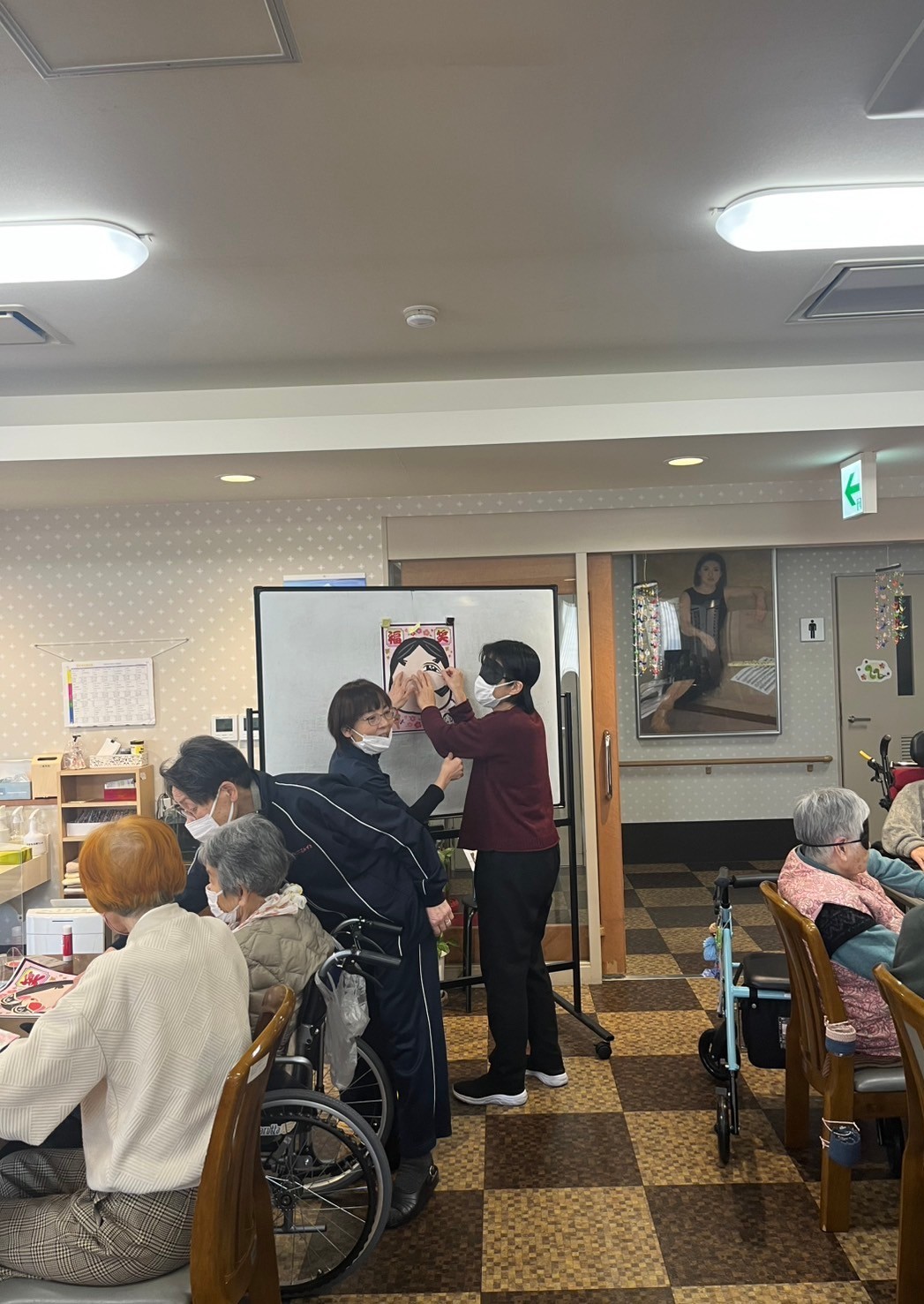 周りのスタッフやご入居者様達が「目はもうちょっと上!」「鼻はもうちょっと下!!」などと言ってくださるので、何とか顔が完成しました。