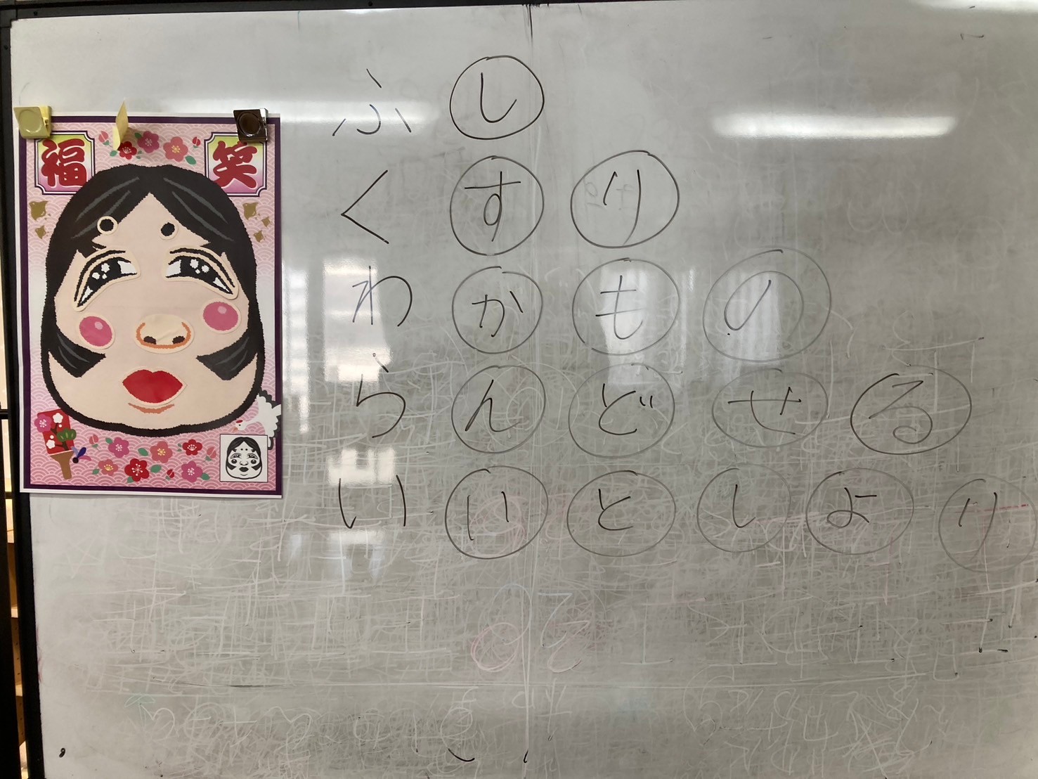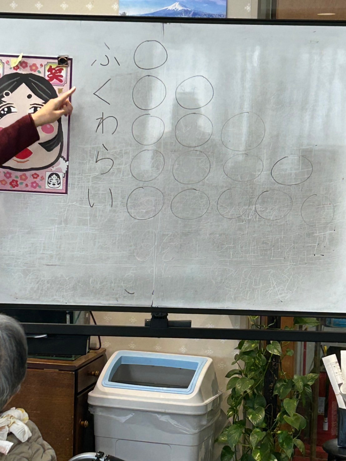 「頭の体操」と題しまして… ホワイトボードに「ふ・く・わ・ら・い」という五文字を頭文字とした「ふ〇」「く〇〇」「わ〇〇〇」「ら〇〇〇〇」「い〇〇〇〇〇」という様に、文字数に合う言葉を見つけていただきます ♪