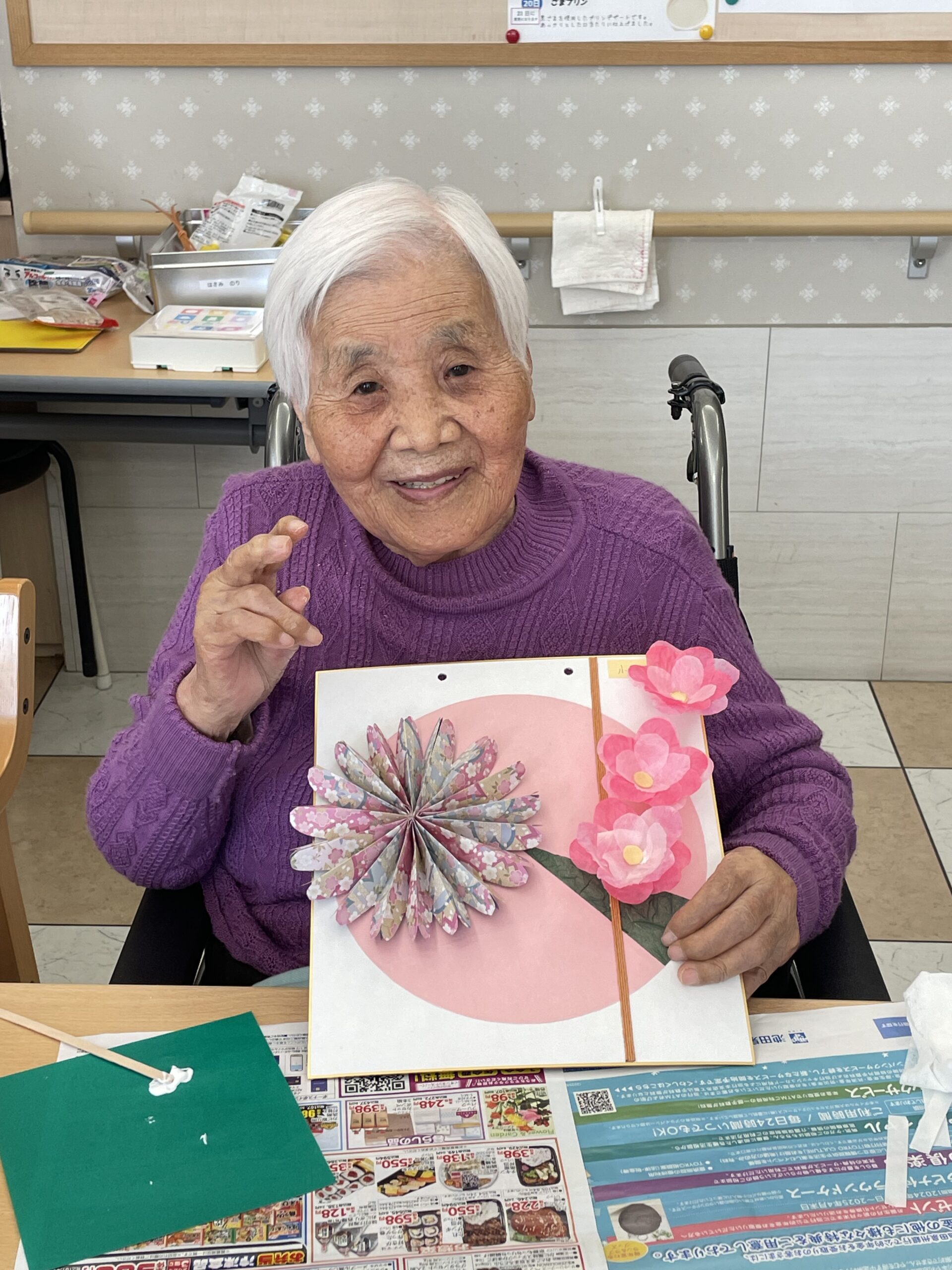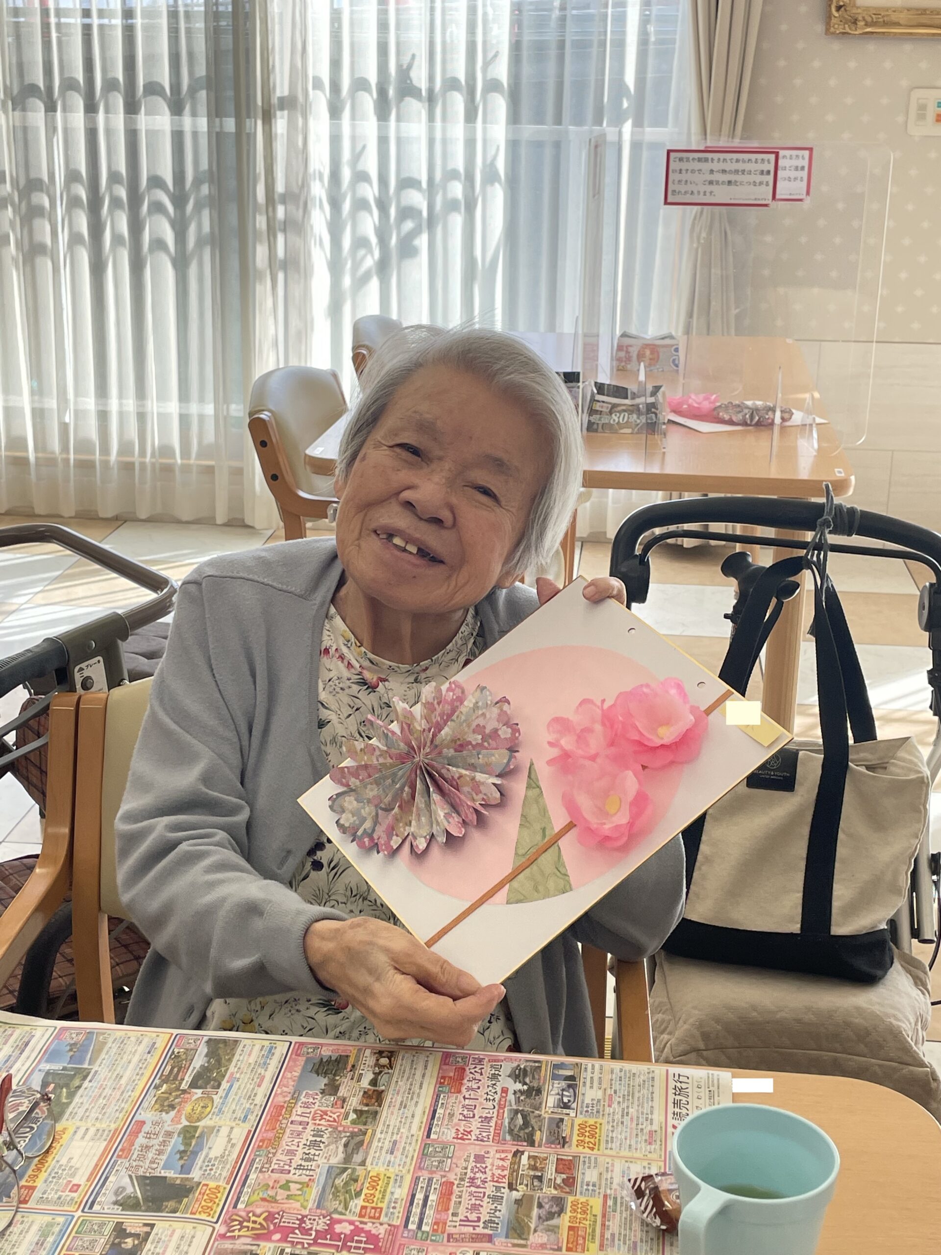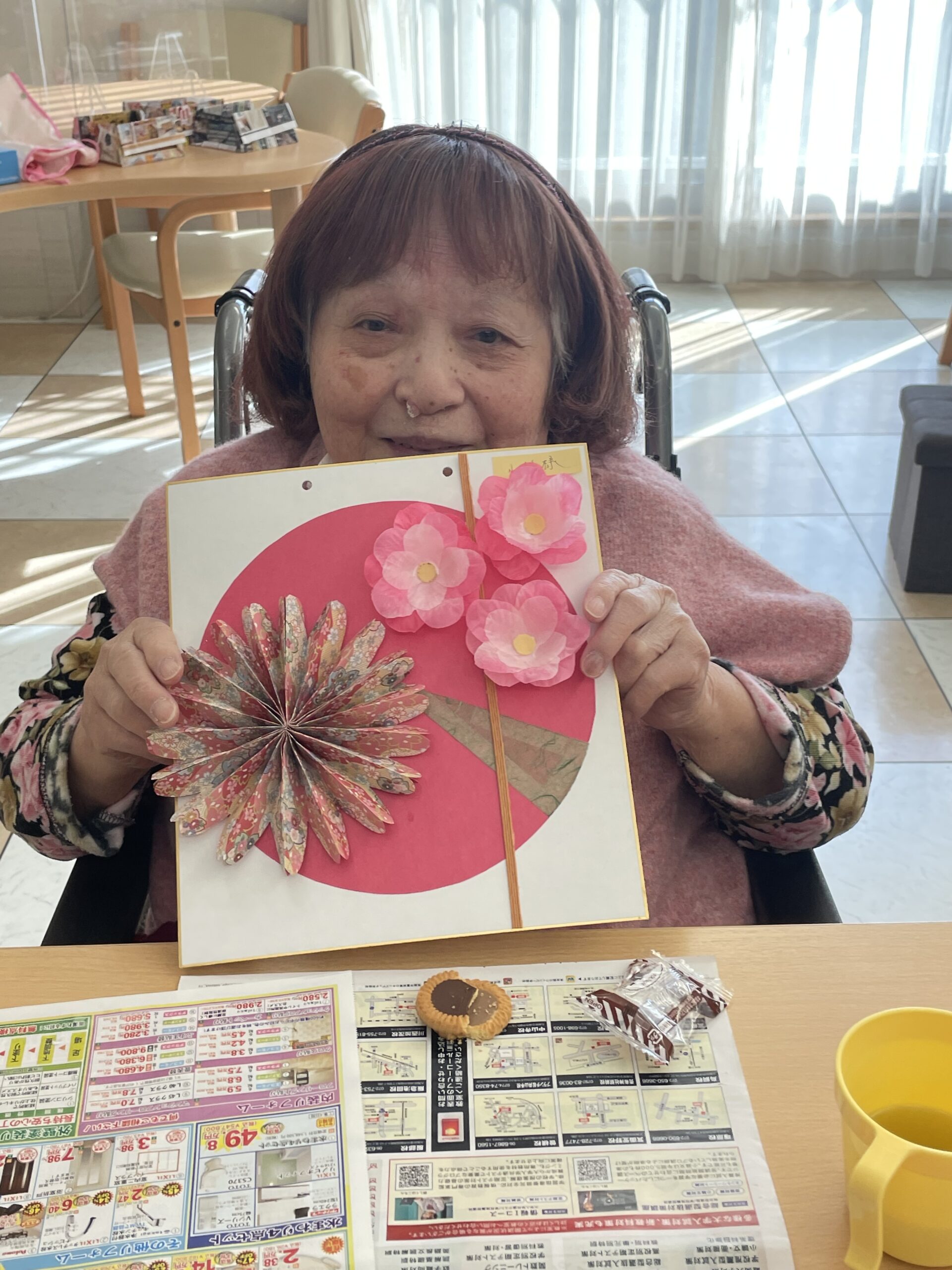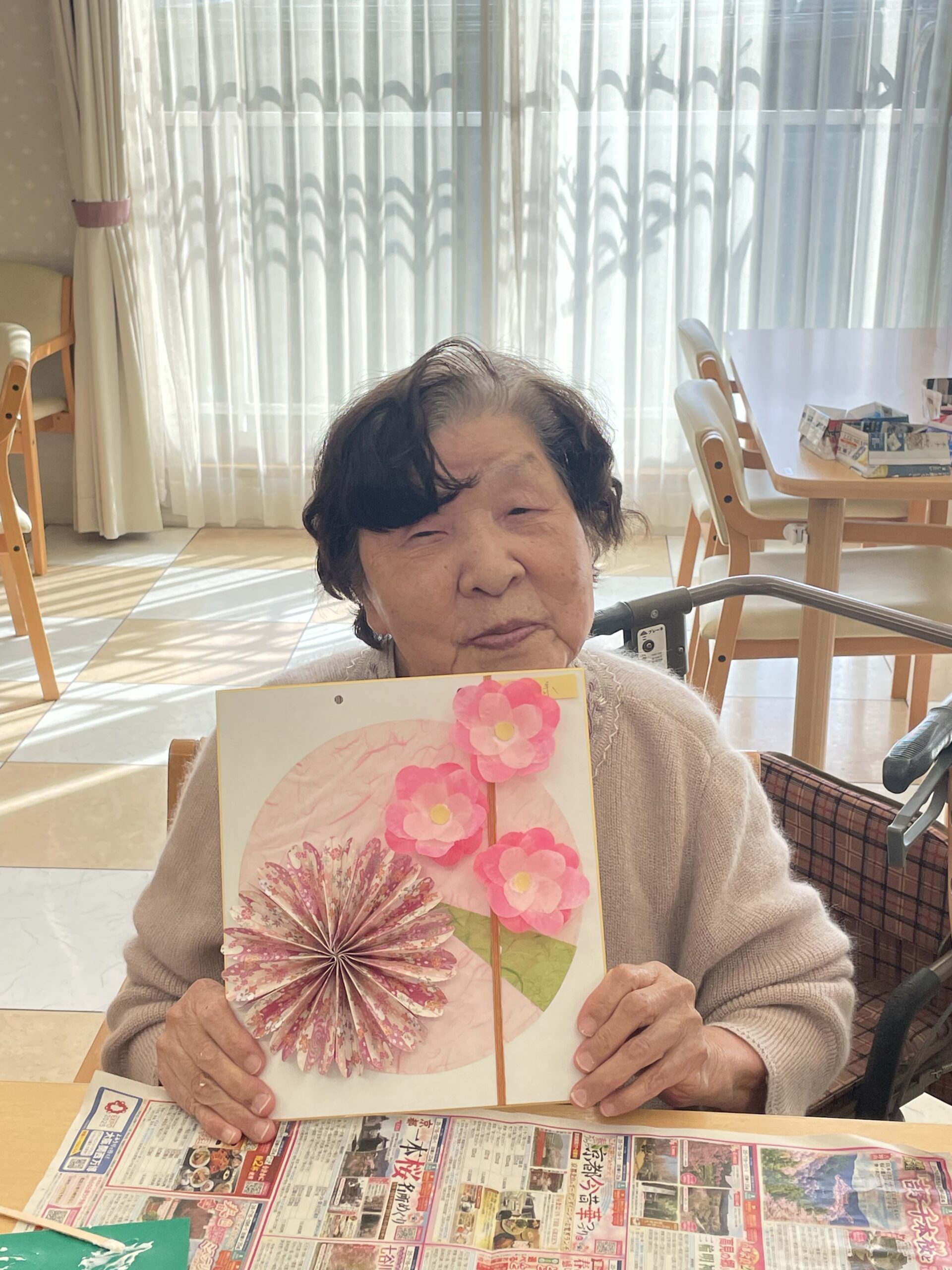 「上手くできたわ!」と嬉しそうに完成したひな祭り飾りをスタッフに見せてくださいました☆ とっても華やかで素敵ですね ♪