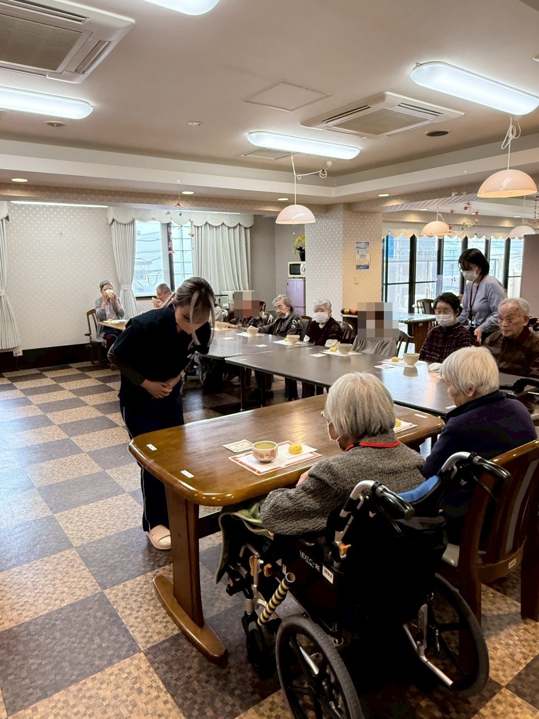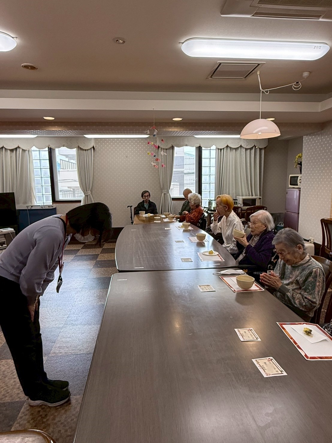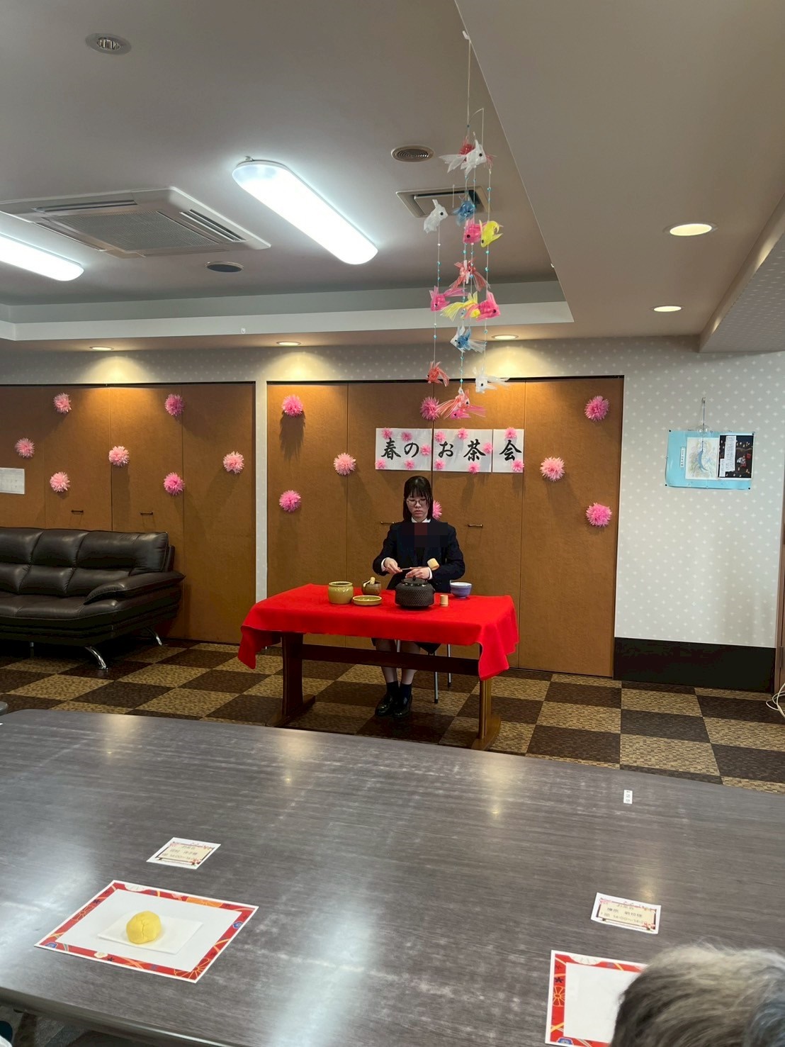 皆様のお席のテーブルには、和菓子をご用意させていただきました。お点前が始まる前に最初にお菓子を召し上がっていただいてから、お抹茶を召し上がってください。とご説明させていただいたのですが、ご入居者様達がじっとお点前をご覧くださっていたので、最終的にはお菓子とお抹茶を一緒にお召し上がりになっていました。