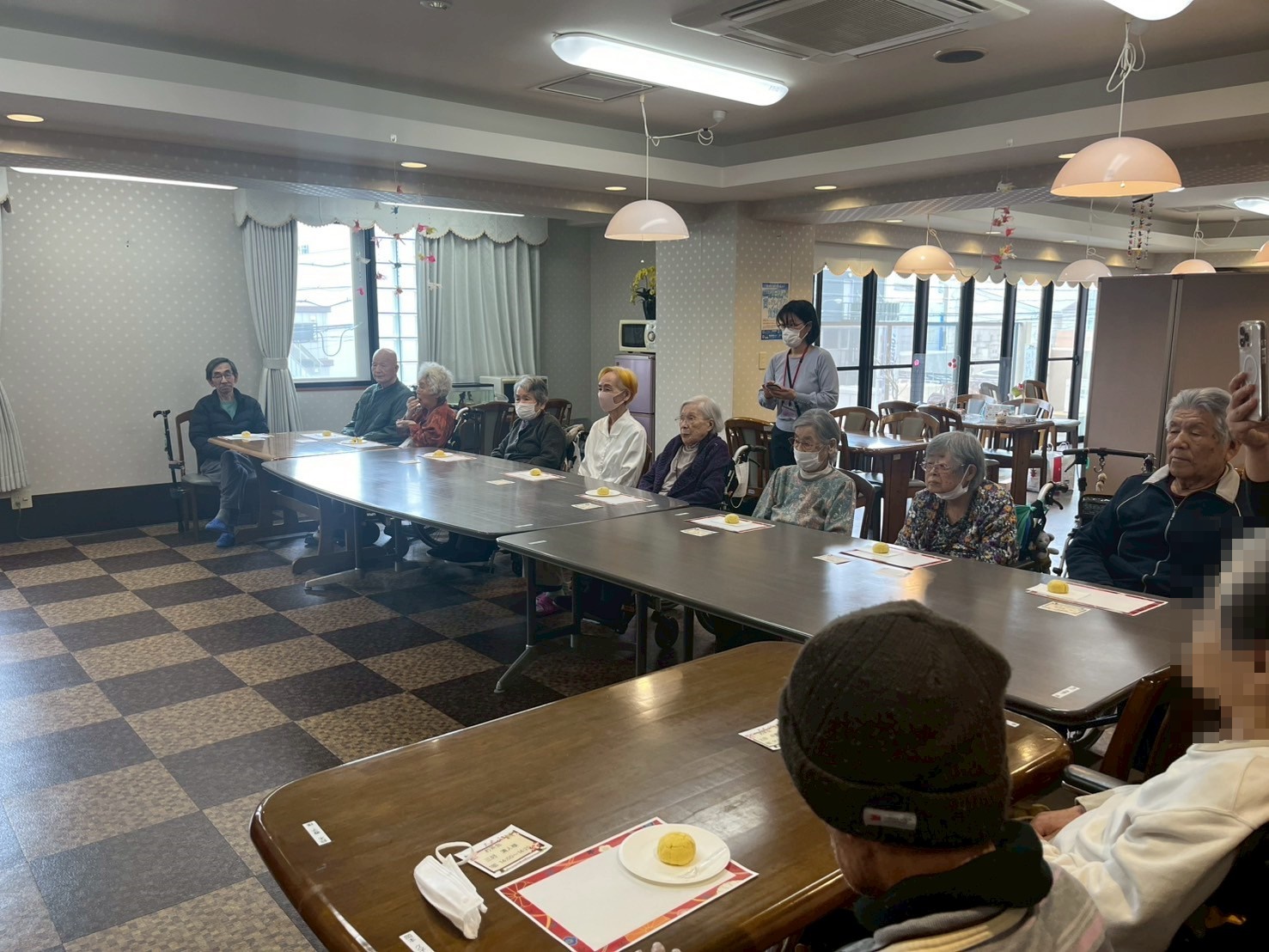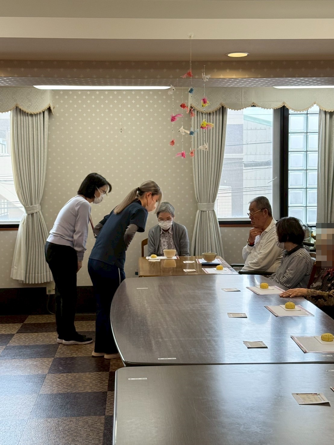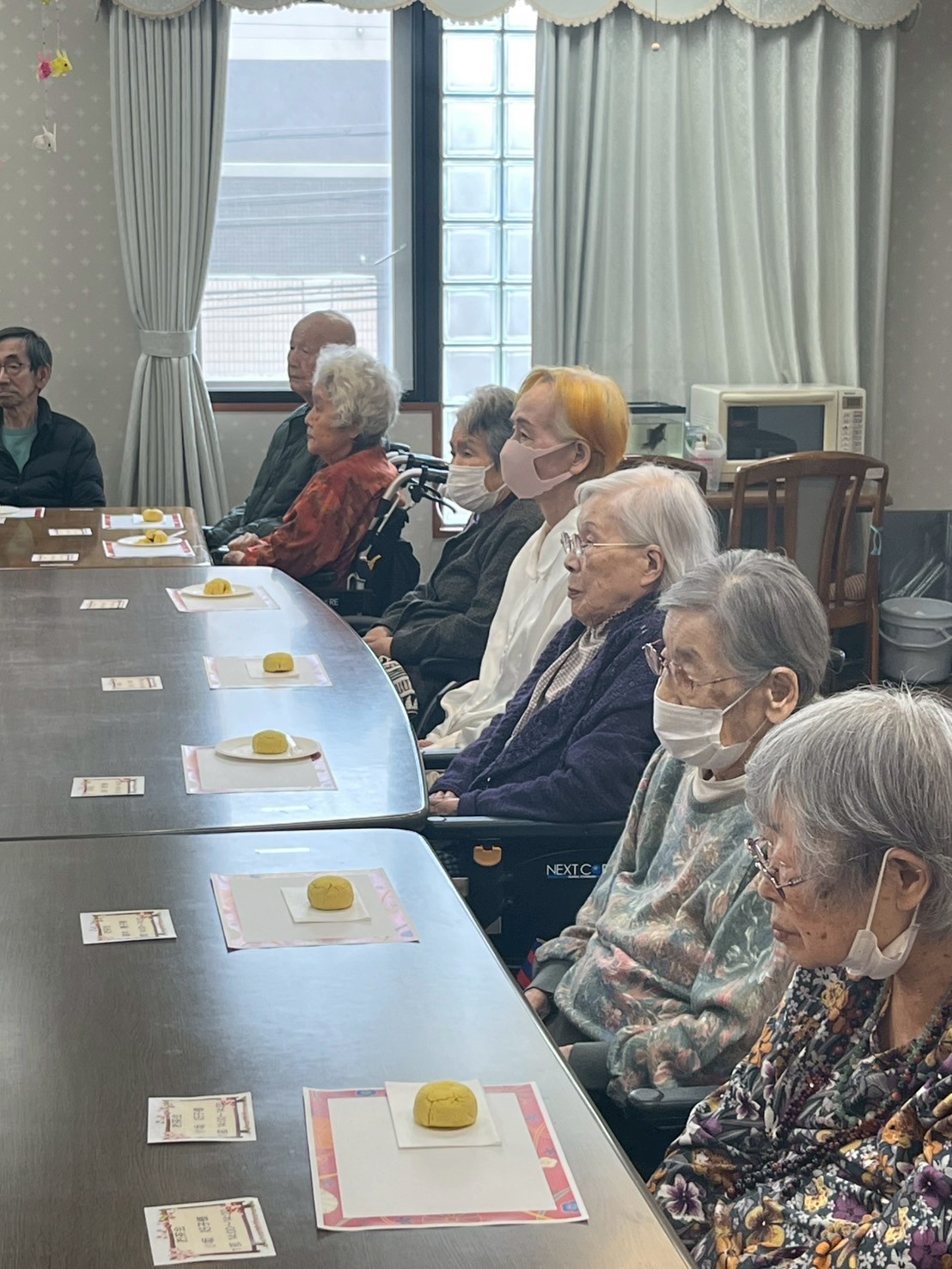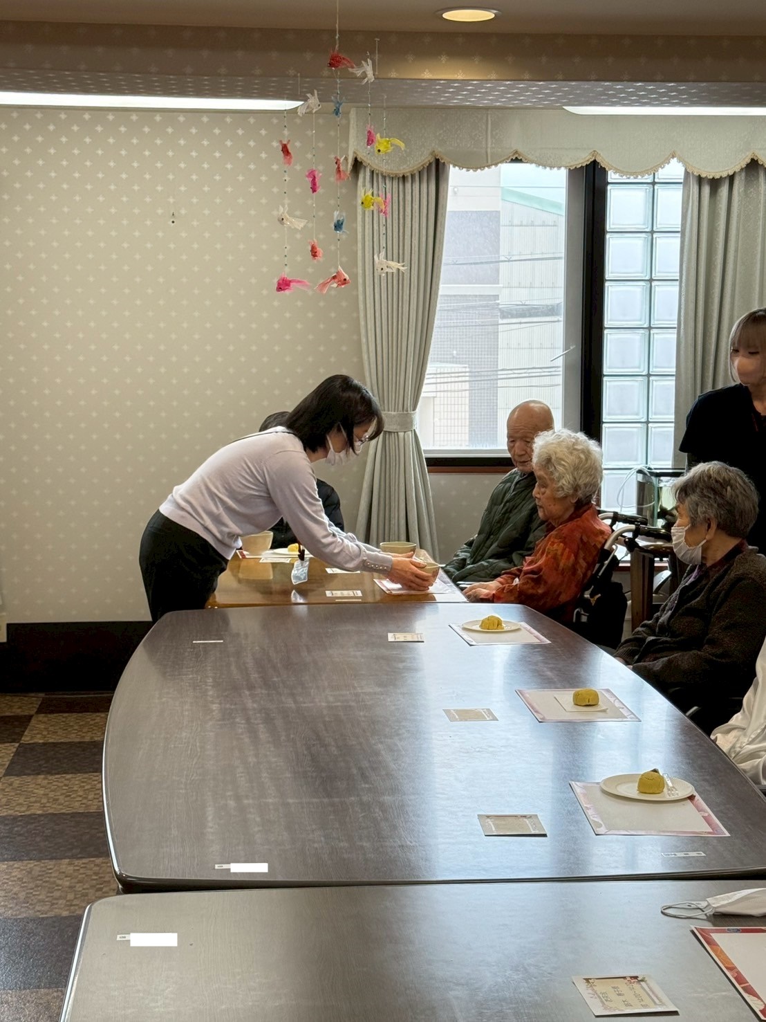 皆様のお席のテーブルには、和菓子をご用意させていただきました。お点前が始まる前に最初にお菓子を召し上がっていただいてから、お抹茶を召し上がってください。とご説明させていただいたのですが、ご入居者様達がじっとお点前をご覧くださっていたので、最終的にはお菓子とお抹茶を一緒にお召し上がりになっていました。