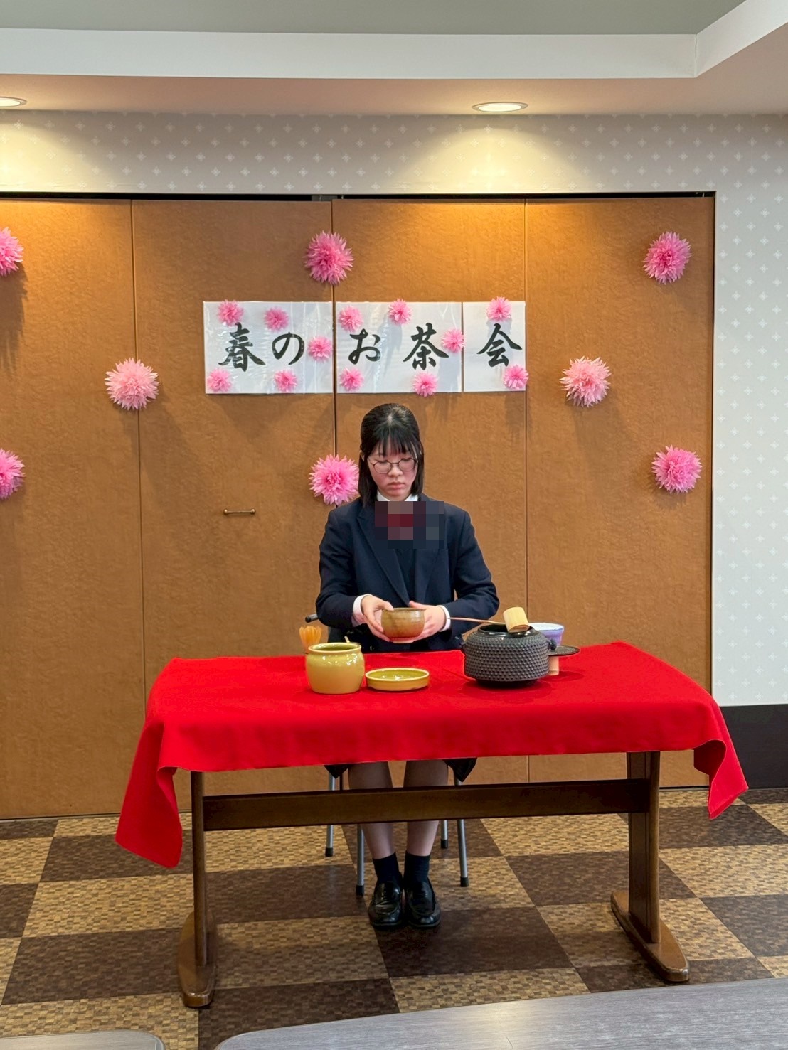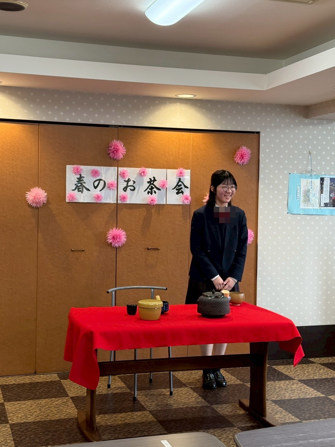 スタッフの娘様が茶華道部に所属しているので、この日はご入居者様の皆様へお茶を点てに来てくれました☆ 余談ですが、お茶を点てることを「お点前」と言うんですね ♪ ご入居者様に教えて頂きました。