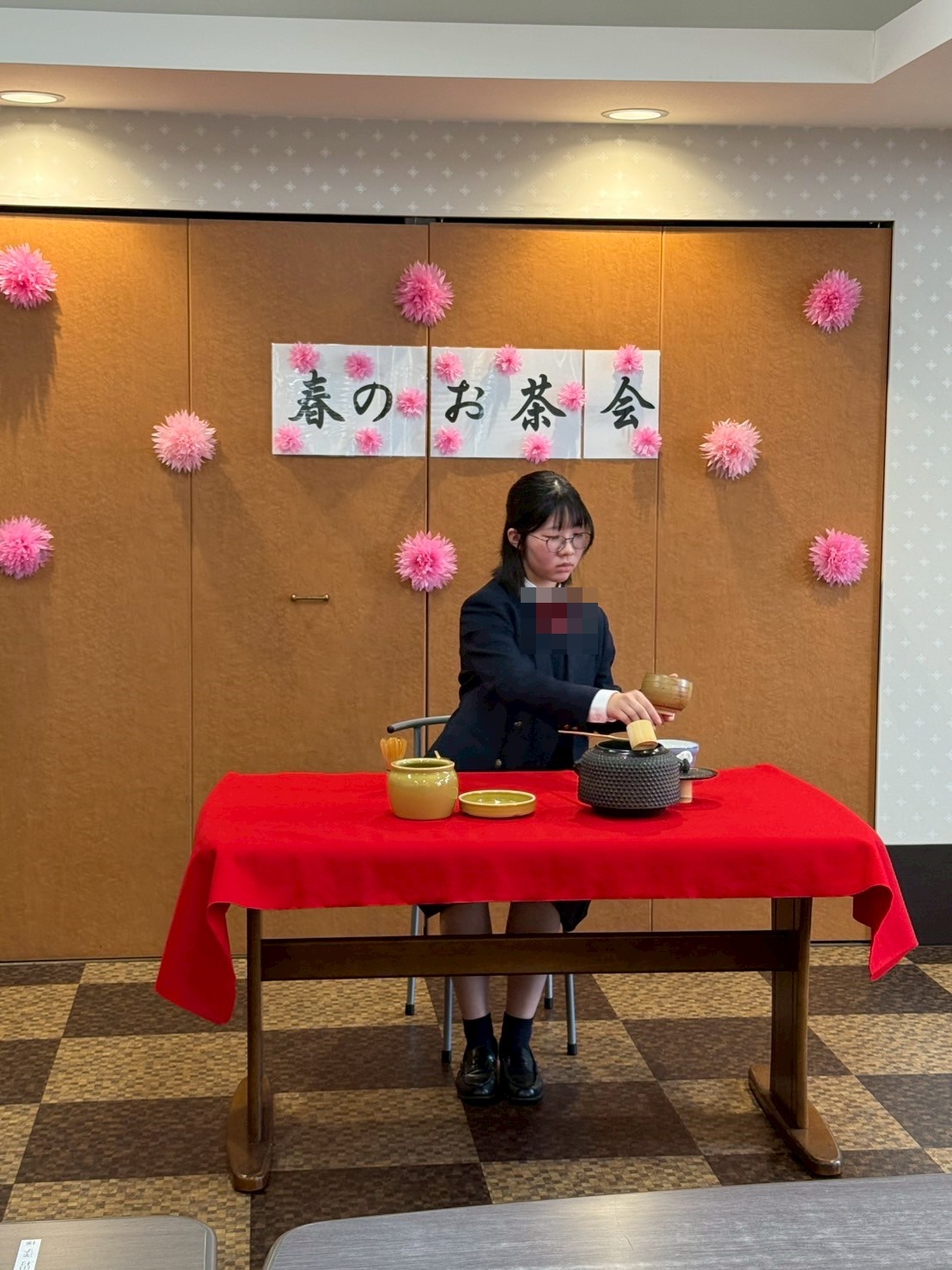 スタッフの娘様が茶華道部に所属しているので、この日はご入居者様の皆様へお茶を点てに来てくれました☆ 余談ですが、お茶を点てることを「お点前」と言うんですね ♪ ご入居者様に教えて頂きました。
