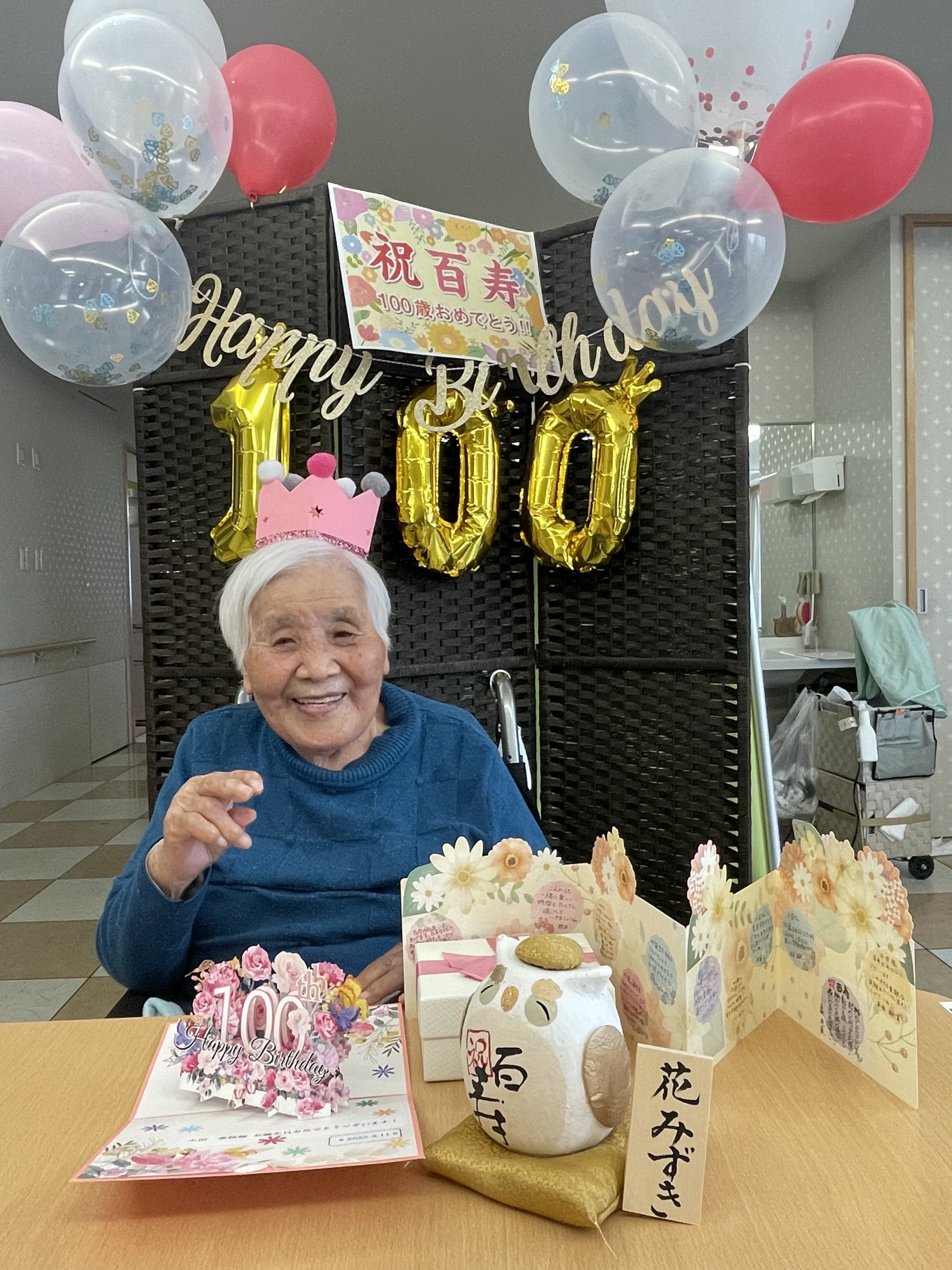 これで終わりかと思ったら… 施設管理者より「今月は100歳のお誕生日のお祝いをしたいと思います!」と100歳を祝う飾り付けが運ばれてきます…☆