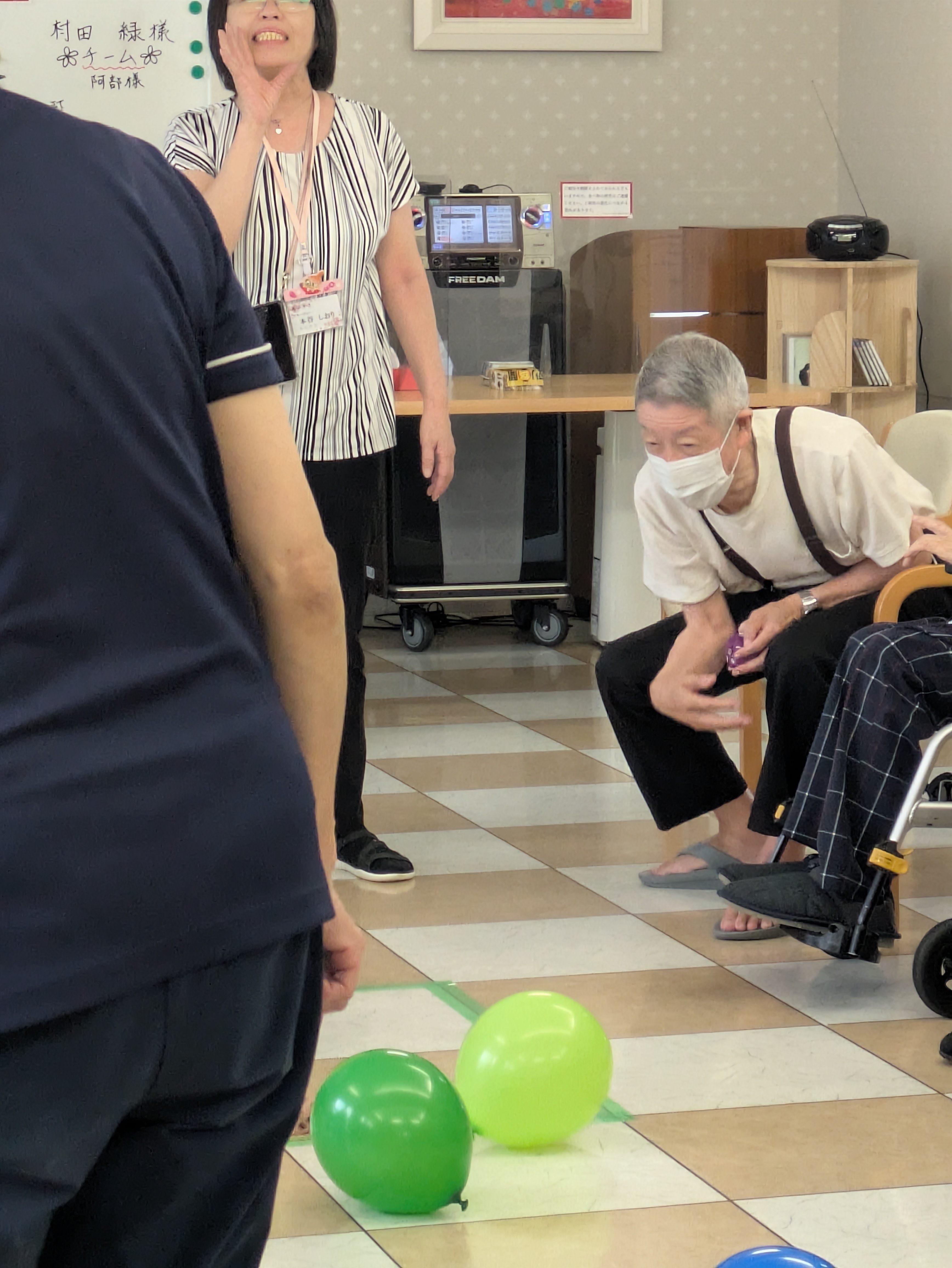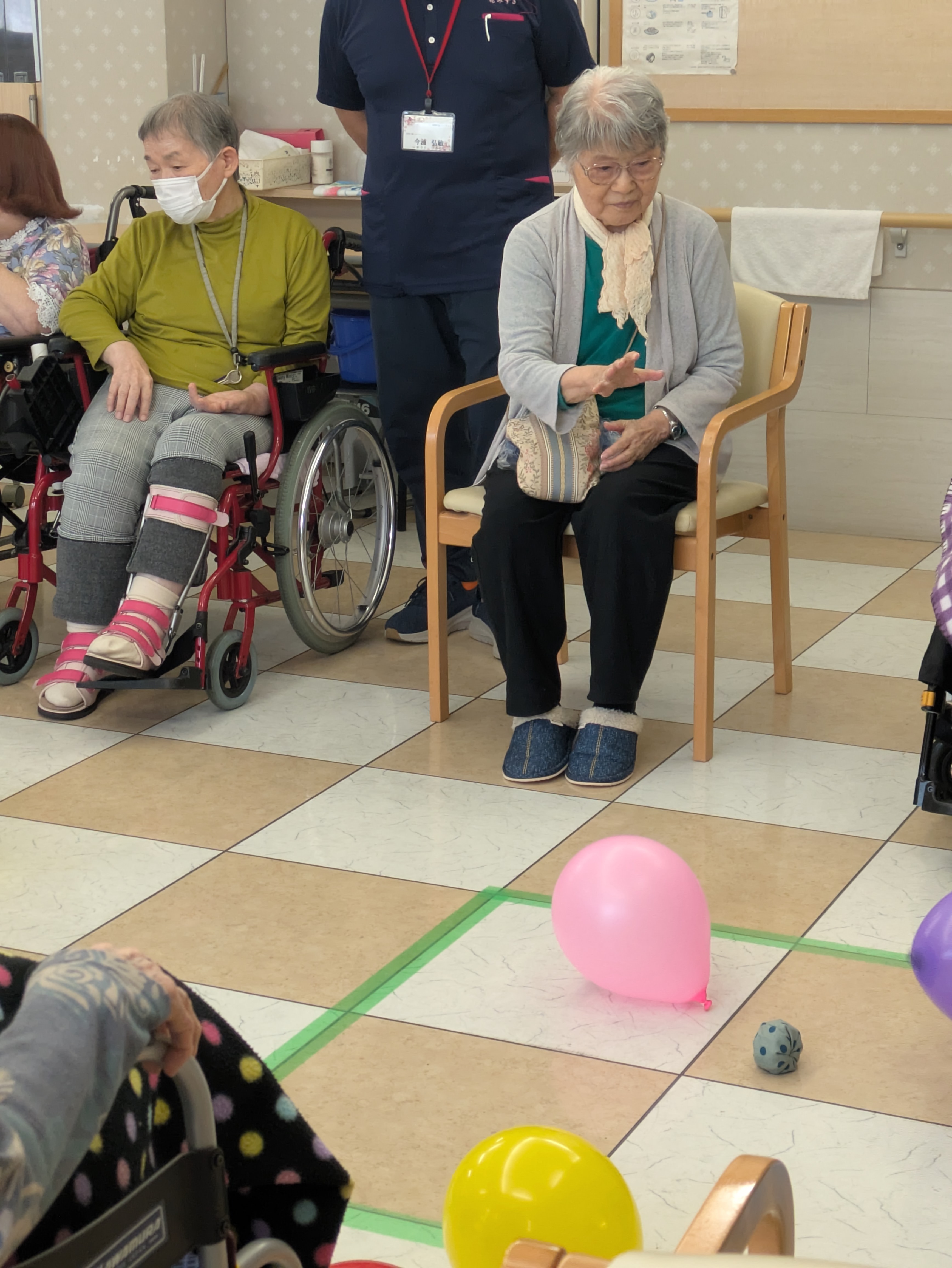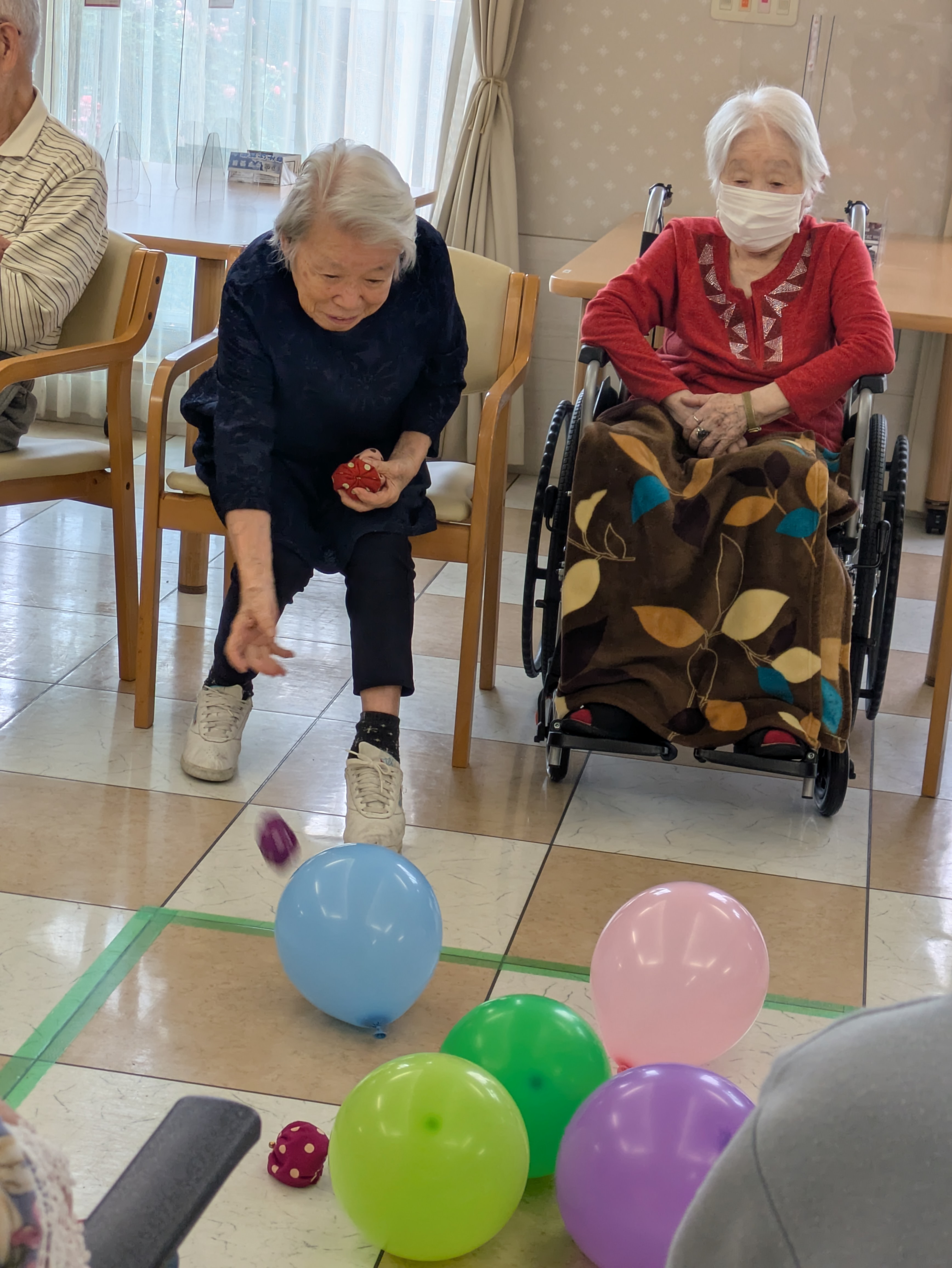 こちらのご入居者様も「対戦ゲームでは負けたくない!」と勢いのある投球でした☆ 風船がはじけ飛んでいます!